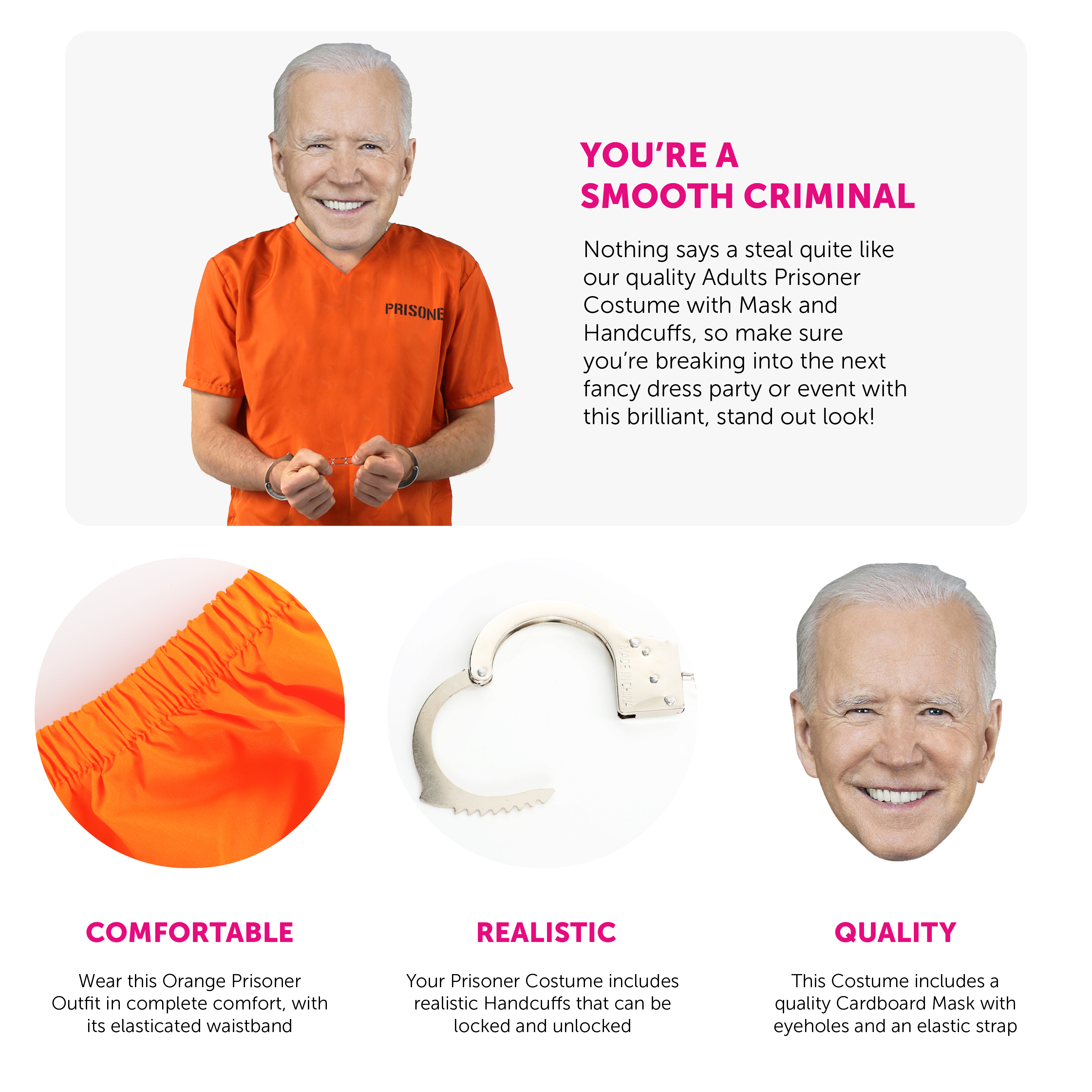 COSTUME INCLUDES: This Costume includes an Orange Prisoner Convict Top with ‘PRISONER’ printed on the front and back, with matching Orange Trousers, Metal Handcuffs with a set of keys, and a Cardboard Joe Biden Mask, the perfect look for any fancy dress event!