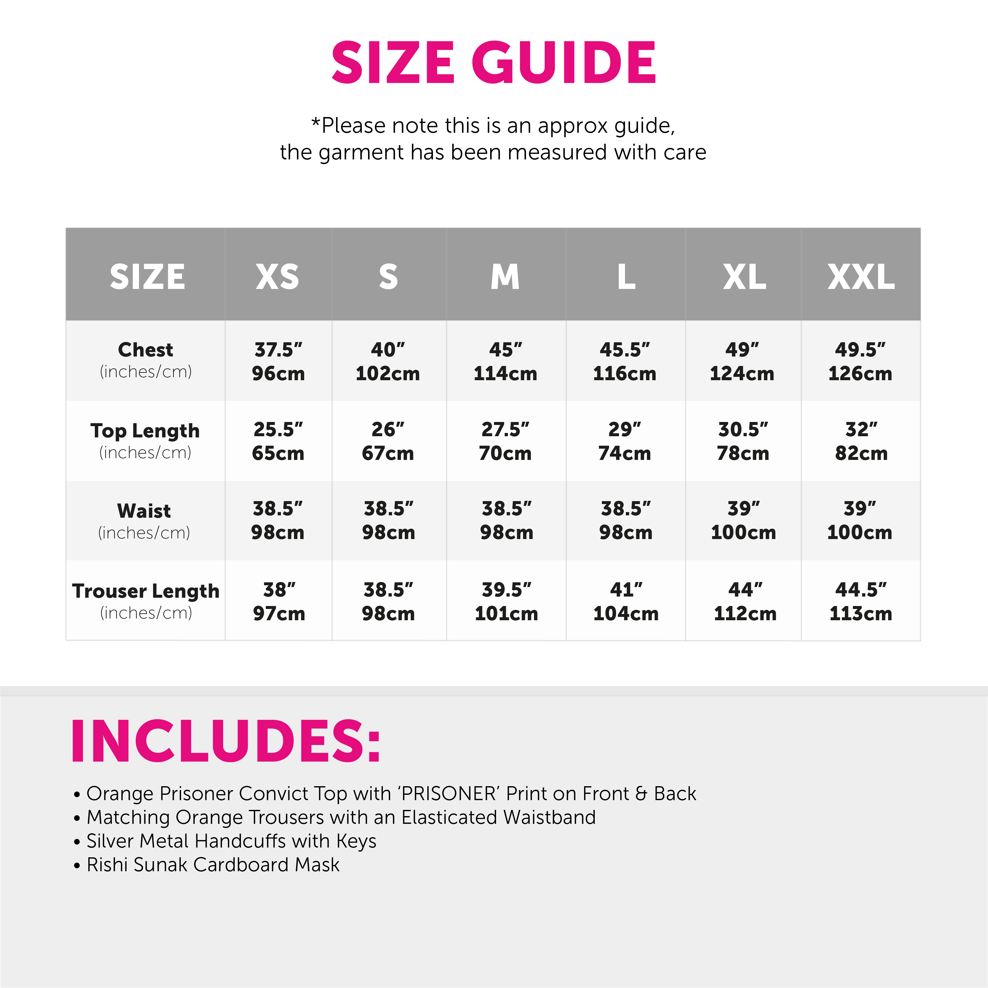 AVAILABLE IN MULTIPLE SIZES: Our Adults Prisoner Costume is available in multiple sizes from X-Small – XX-Large: X Small: Chest: 37.5" (96cm), Top Length: 25.5" (65cm), Waist: 38.5" (98cm), Trouser Length: 38" (97cm) | Small: Chest: 40" (102cm), Top Length: 26" (67cm), Waist: 38.5" (98cm), Trouser Length: 38.5" (98cm) | Medium: Chest: 45" (114cm), Top Length: 27.5" (70cm), Waist: 38.5" (98cm), Trouser Length: 39.5" (101cm) | Large: Chest: 45.5" (116cm), Top Length: 29" (74cm), Waist: 38.5" (98cm), Trouser Length: 41" (104cm) | X Large: Chest: 49" (124cm), Top Length: 30.5" (78cm), Waist: 39" (100cm), Trouser Length: 44" (112cm) | XX Large: Chest: 49.5" (126cm), Top Length: 32" (82cm), Waist: 39" (100cm), Trouser Length: 44.5" (113cm)
