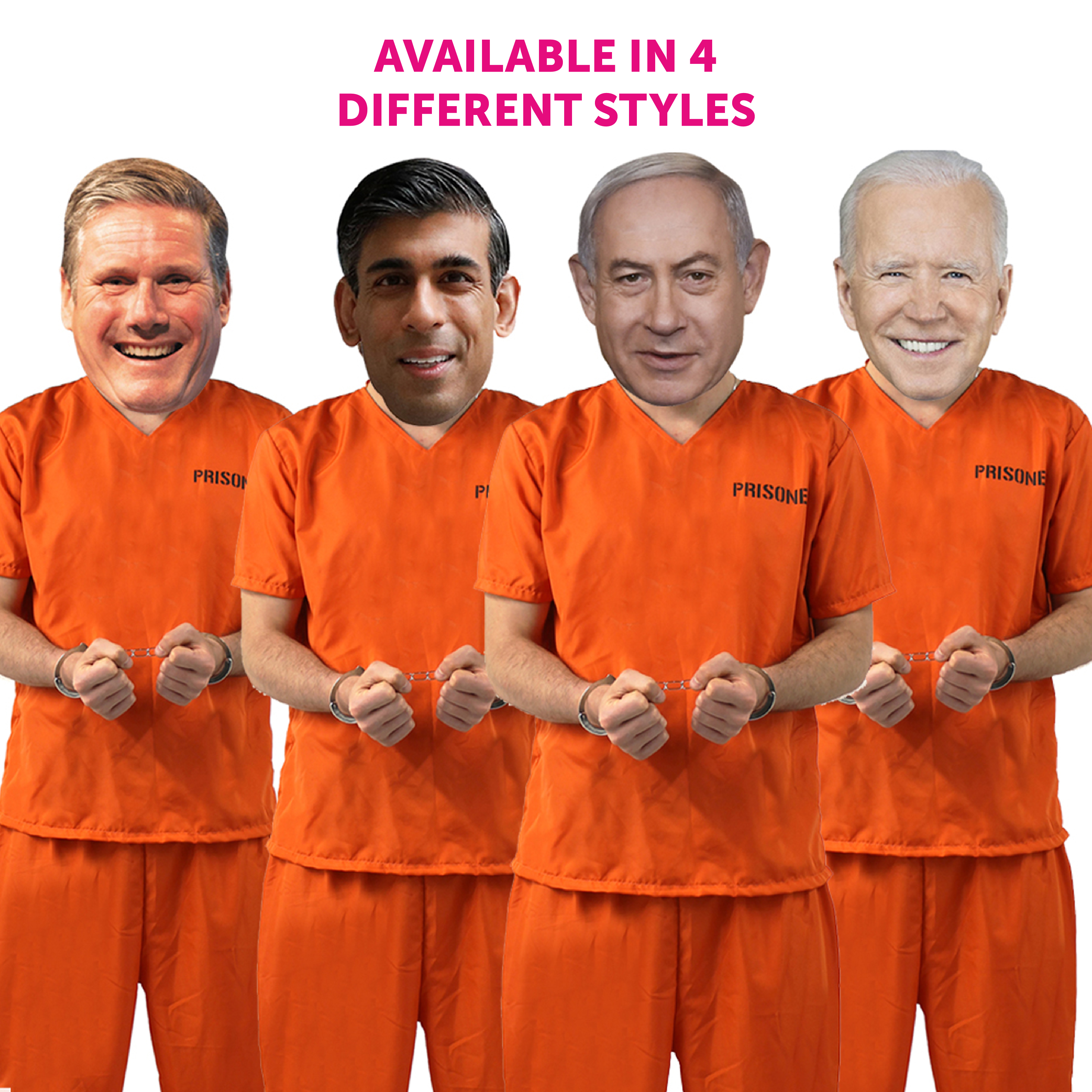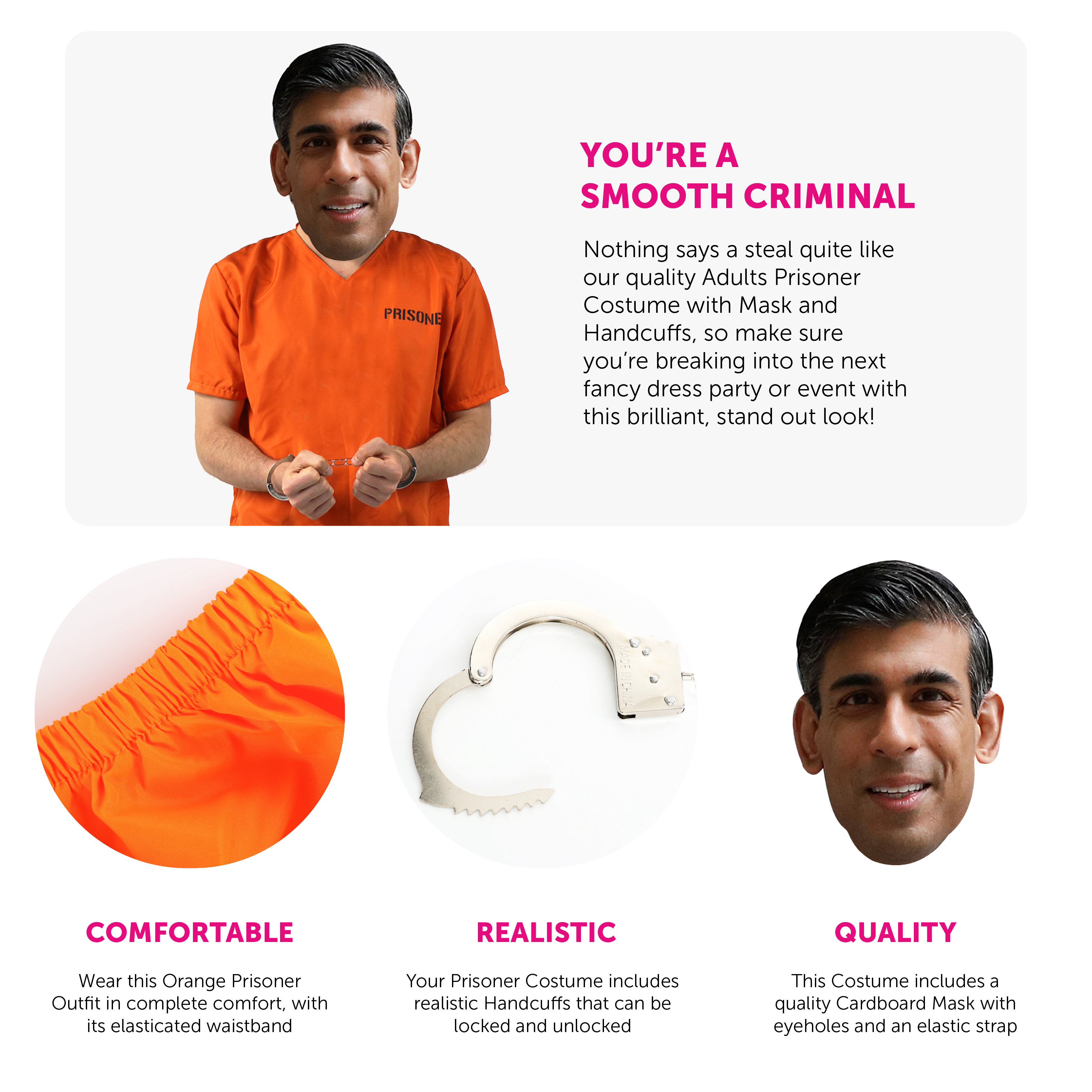 COSTUME INCLUDES: This Costume includes an Orange Prisoner Convict Top with ‘PRISONER’ printed on the front and back, with matching Orange Trousers, Metal Handcuffs with a set of keys, and a Cardboard Rishi Sunak Mask, the perfect look for any fancy dress event!