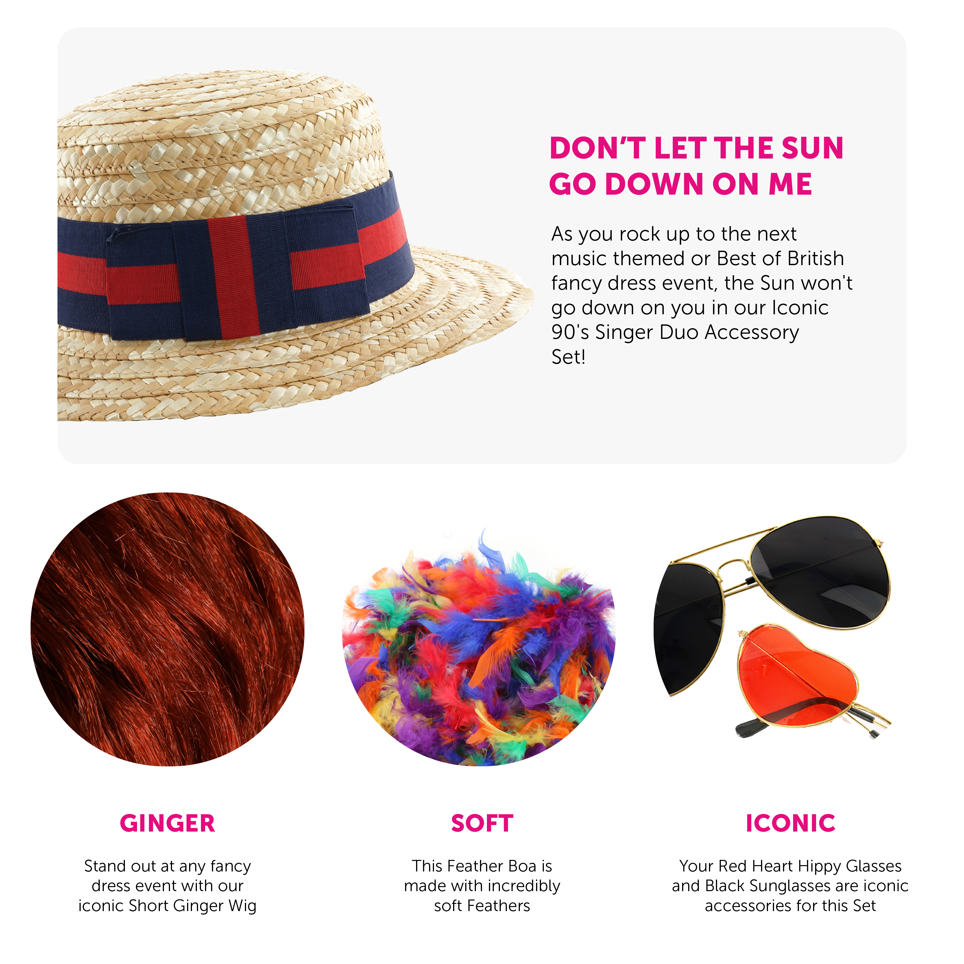ACCESSORY SET INCLUDES: This 90's Singer Duo Set includes a Straw Boater Hat with a Blue and Red Striped Band, a Short Ginger Wig, an 80's style Wig with Blonde tips, Red Heart Hippy Glasses, Gold Frame Sunglasses, and an incredibly soft Rainbow Feather Boa, the perfect look for any fancy dress event!