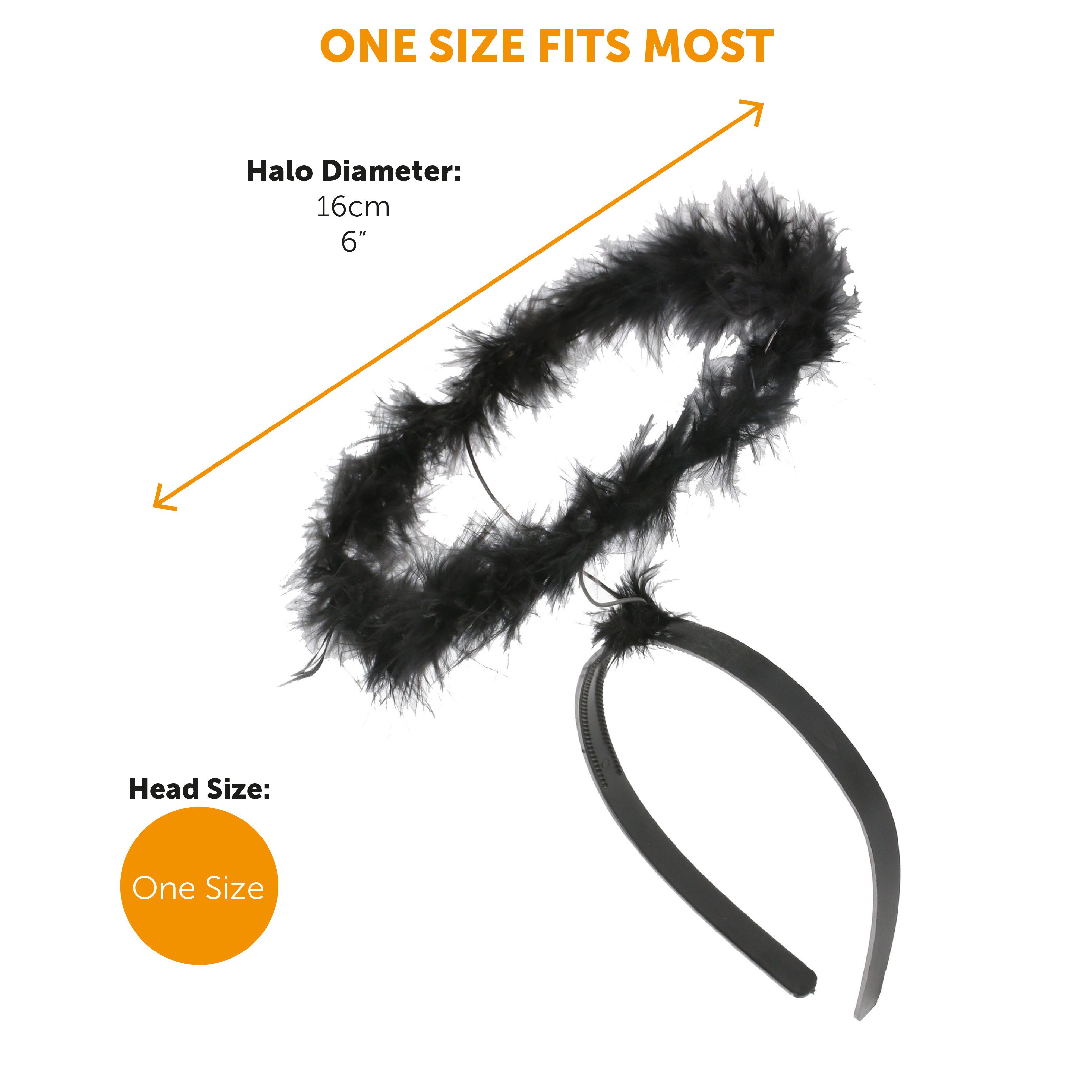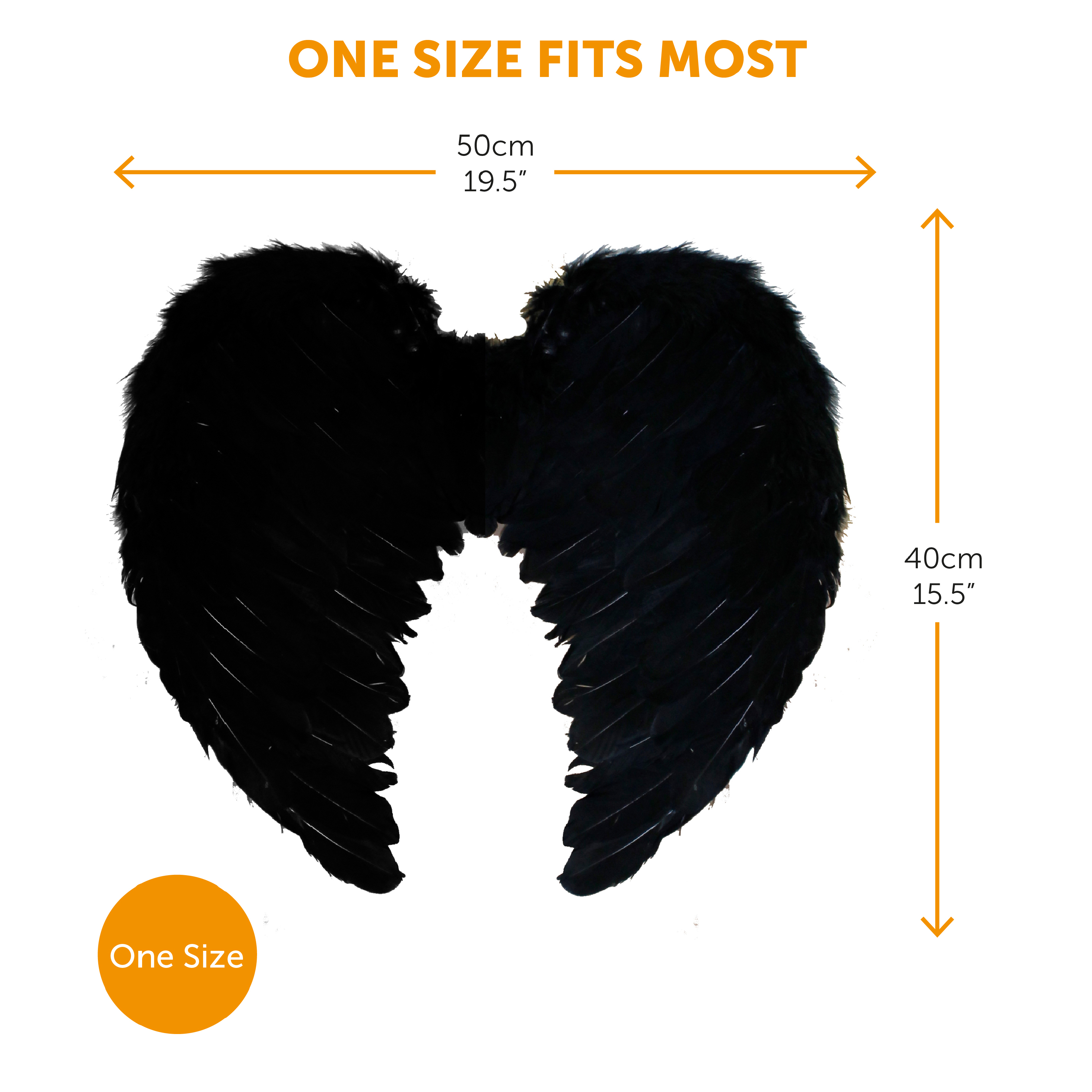 ACCESSORY MEASUREMENTS: The Black Feather Wings are a great size and will get you noticed at any event, measuring a width of 50cm (19.5") and a height of 40cm (15.5") | The Black Halo Headband measures a diameter of 16cm (6")!