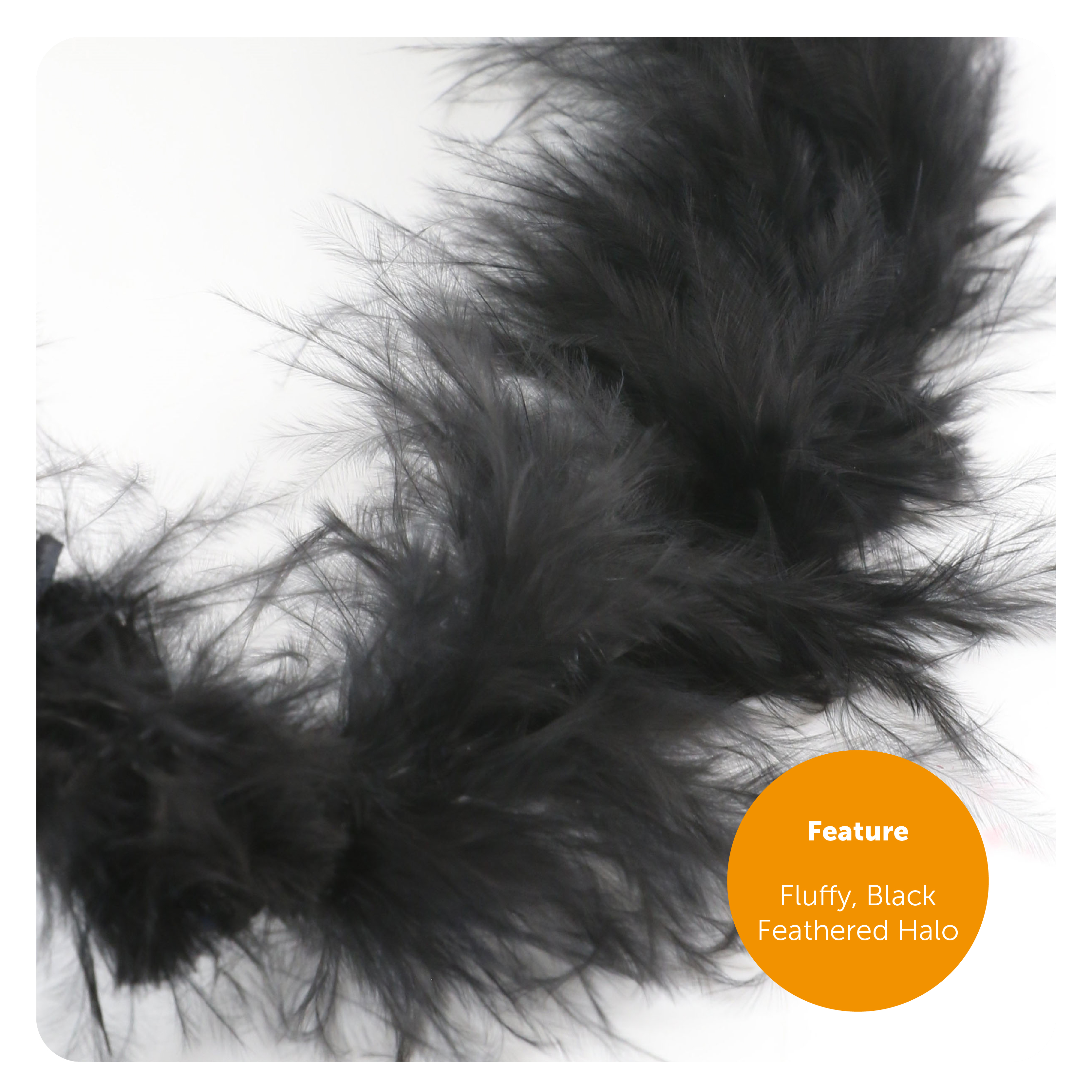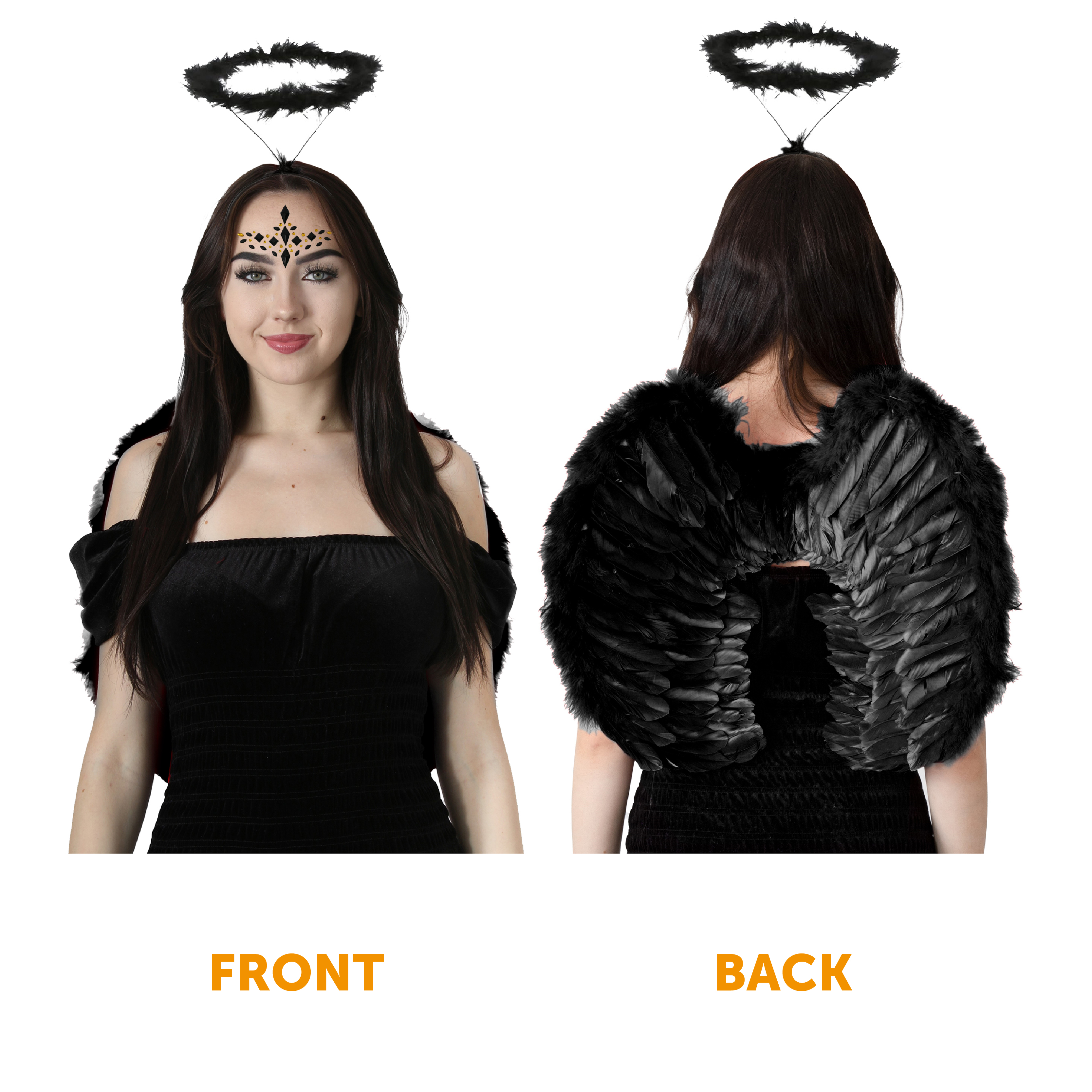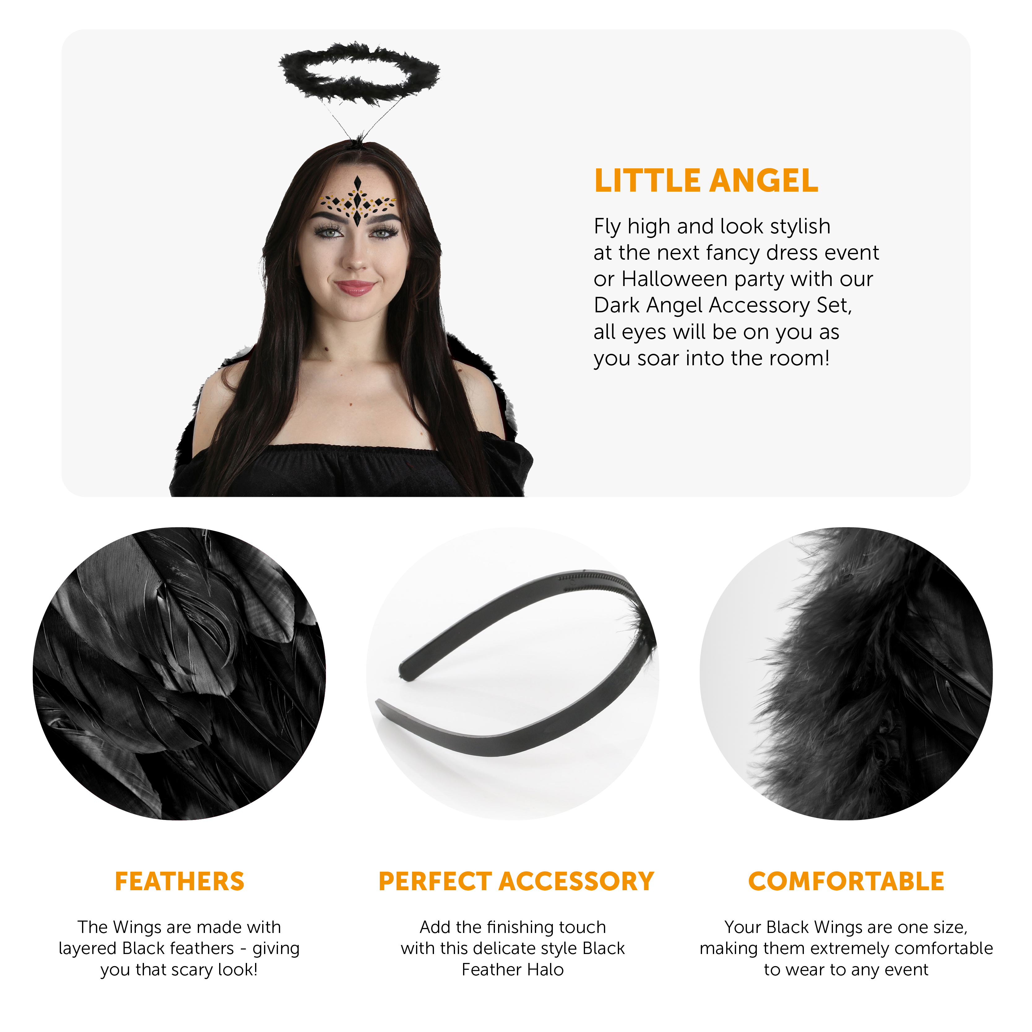 COSTUME INCLUDES: Your Dark Angel Accessory Set includes a Black Halo Headband, Black Feather Wings with comfortable straps, a pair of Long Black Gloves, and Black and Gold adhesive Face Gems, the perfect look for any fancy dress event!