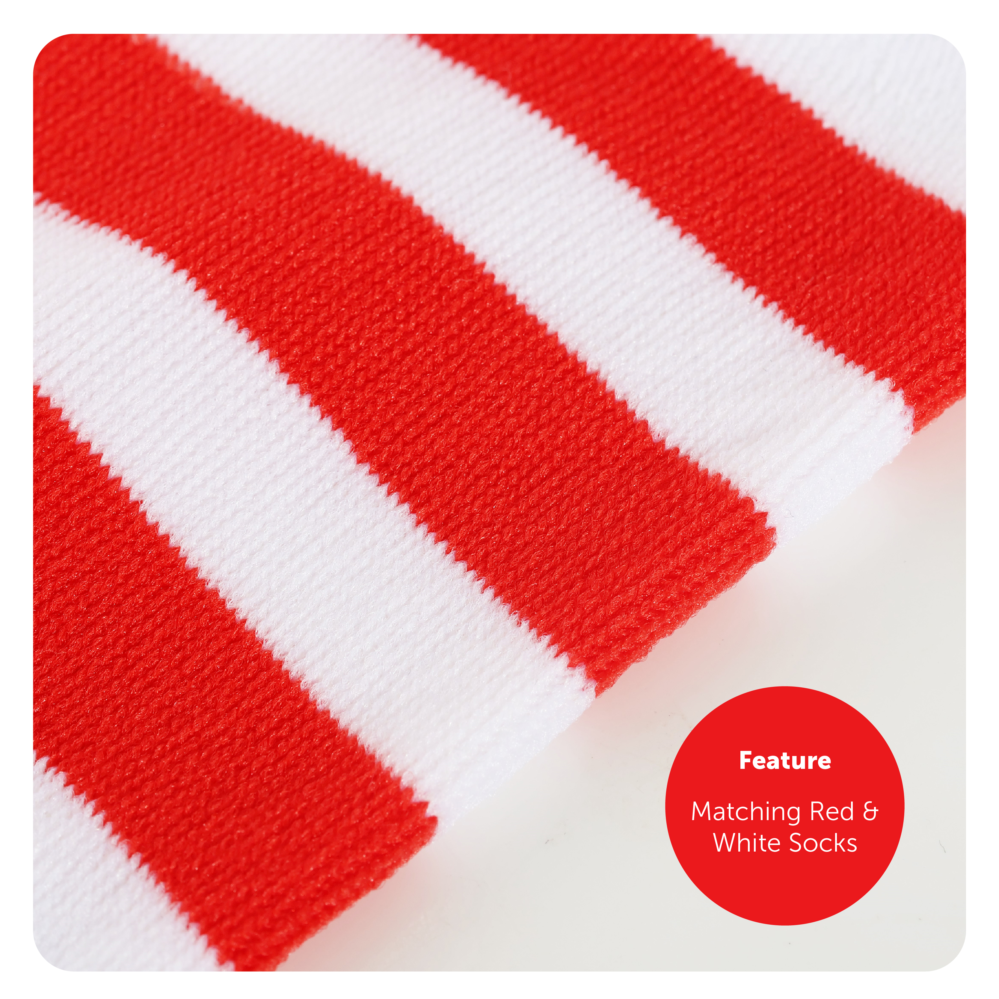 QUALITY SOCKS: The Costume includes a perfectly matching pair of one size, knee length, White Sports Socks with three Red Stripes around the top!