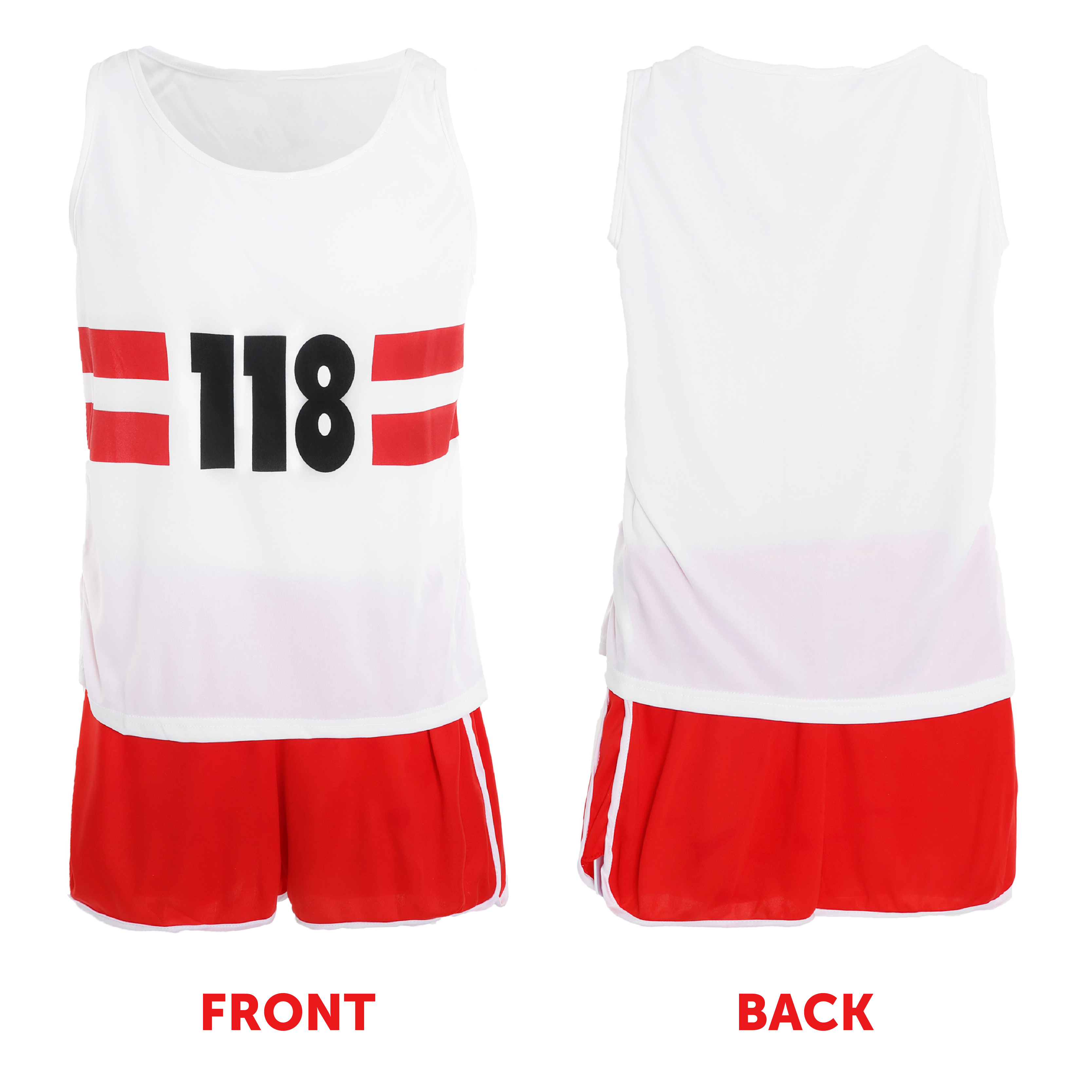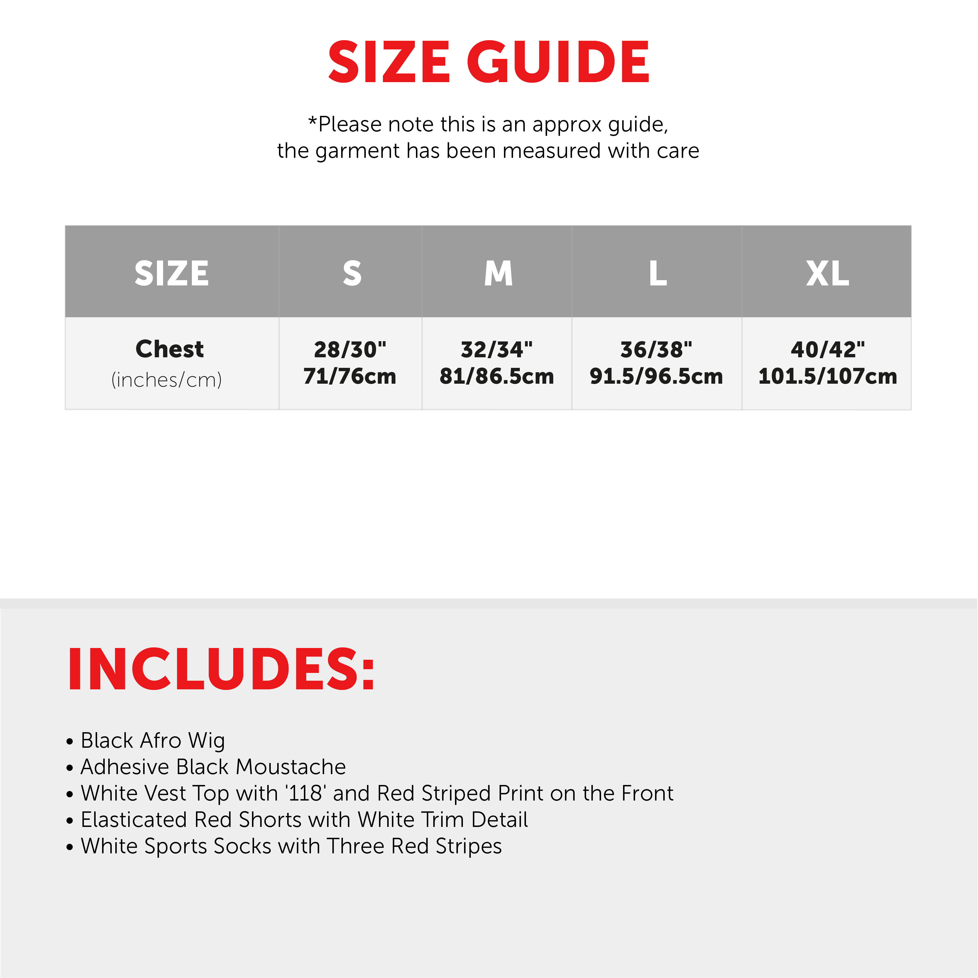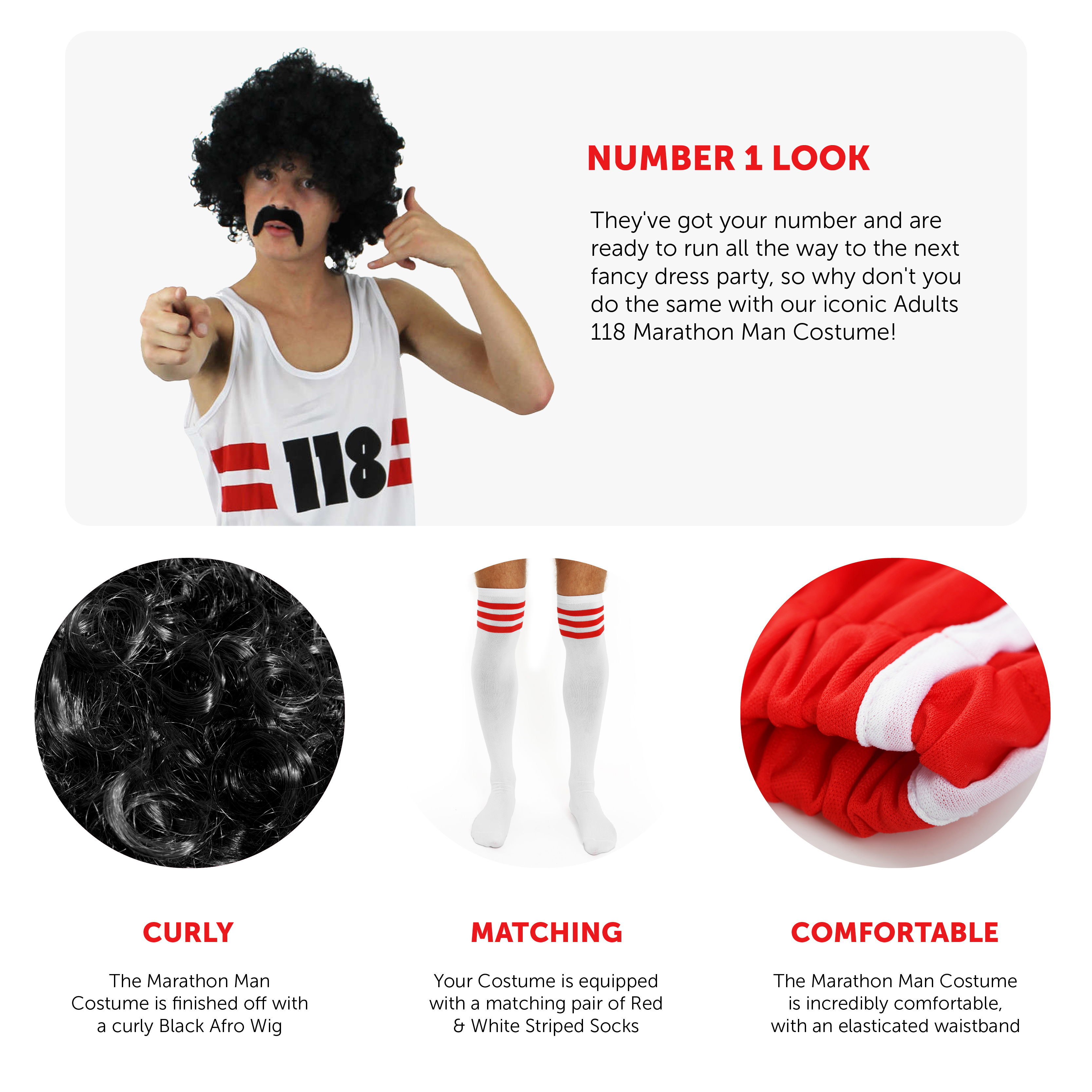 COSTUME DETAILS: Your Adults 118 Marathon Man Costume includes a Black Afro Wig, an Adhesive Black Moustache, a White Vest Top with '118' Print on the front, Red Shorts with White Trim detail and a pair of long White Sports Socks with three Red Stripes around the top!