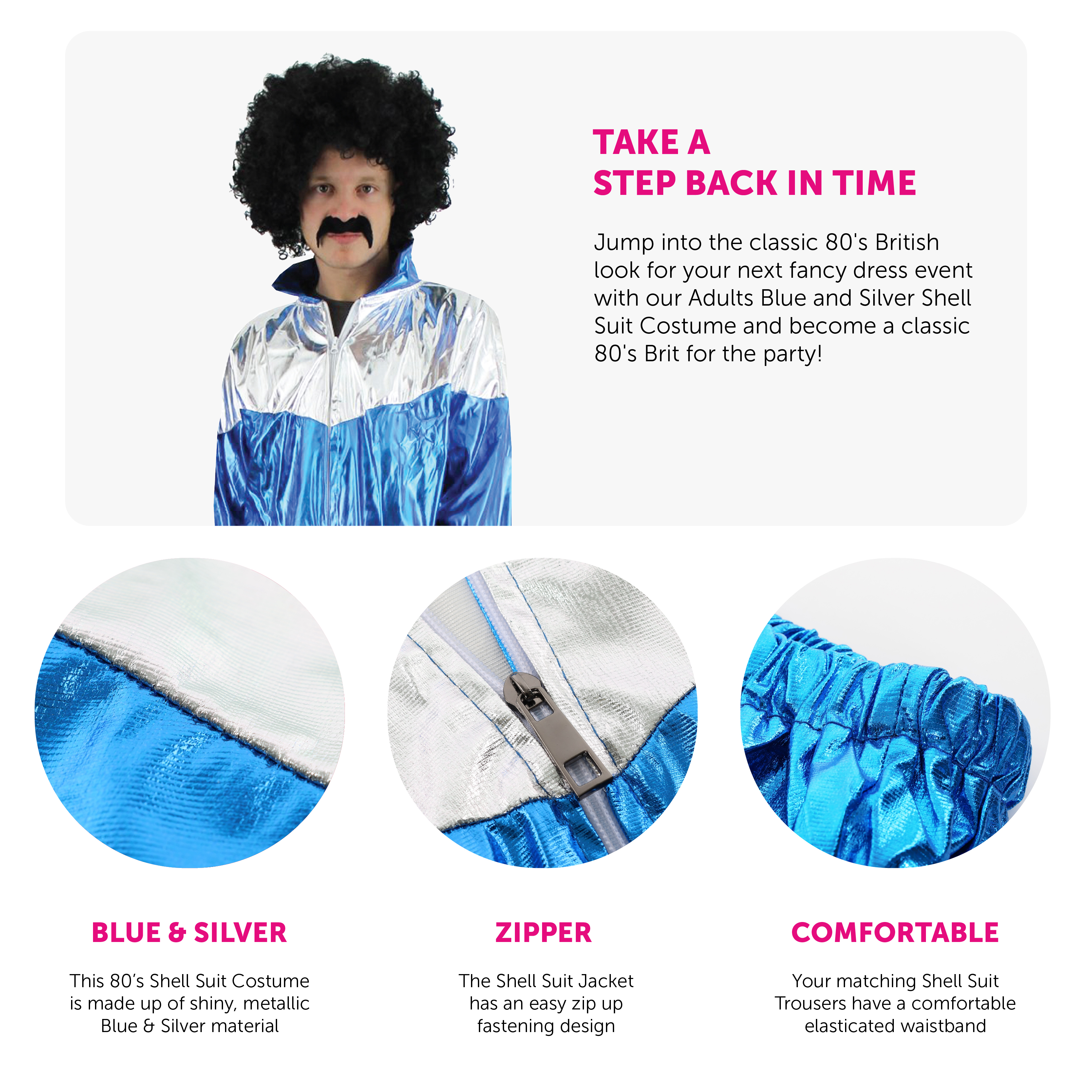 COSTUME INCLUDES: Your Adults Shell Suit Costume includes a Dark Blue Shiny Shell Suit Jacket with a Silver panel across the shoulders and chest and comfortable zip up fastening, and matching Shell Suit Trousers with an elasticated waistband!