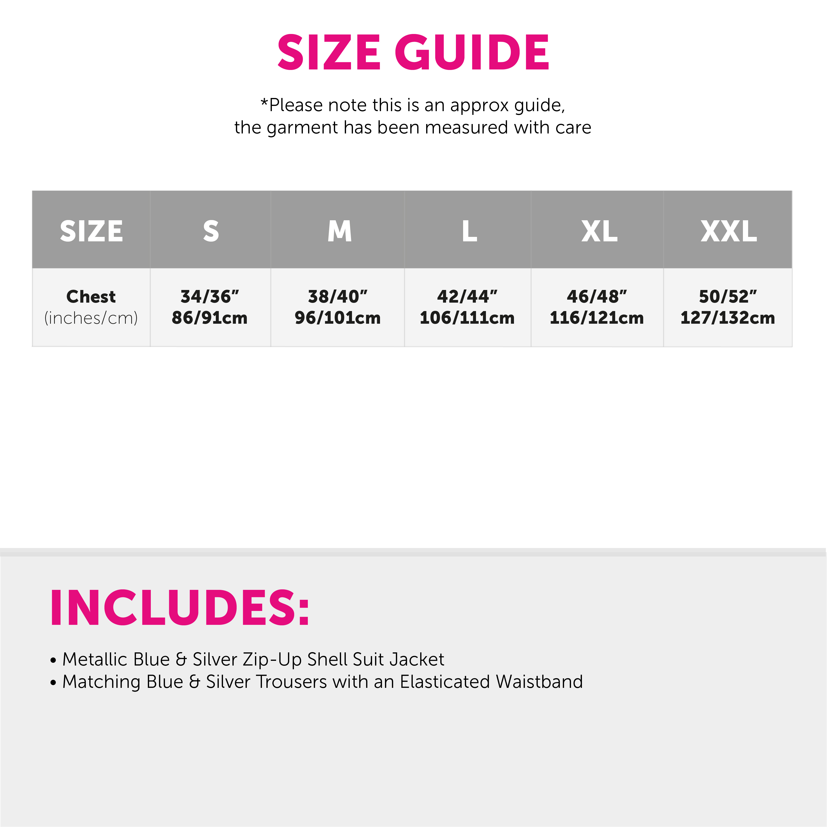 AVAILABLE IN MULTIPLE SIZES: Your Adults Blue and Silver Shell Suit is available in multiple sizes from Small to XX-Large: Small: Chest: 34/36” (86/91cm) | Medium: Chest: 38/40” (96/101cm) | Large: Chest: 42/44” (106/111cm) | X-Large: Chest: 46/48” (116/121cm) | XX-Large: Chest: 50/52” (127/132cm)