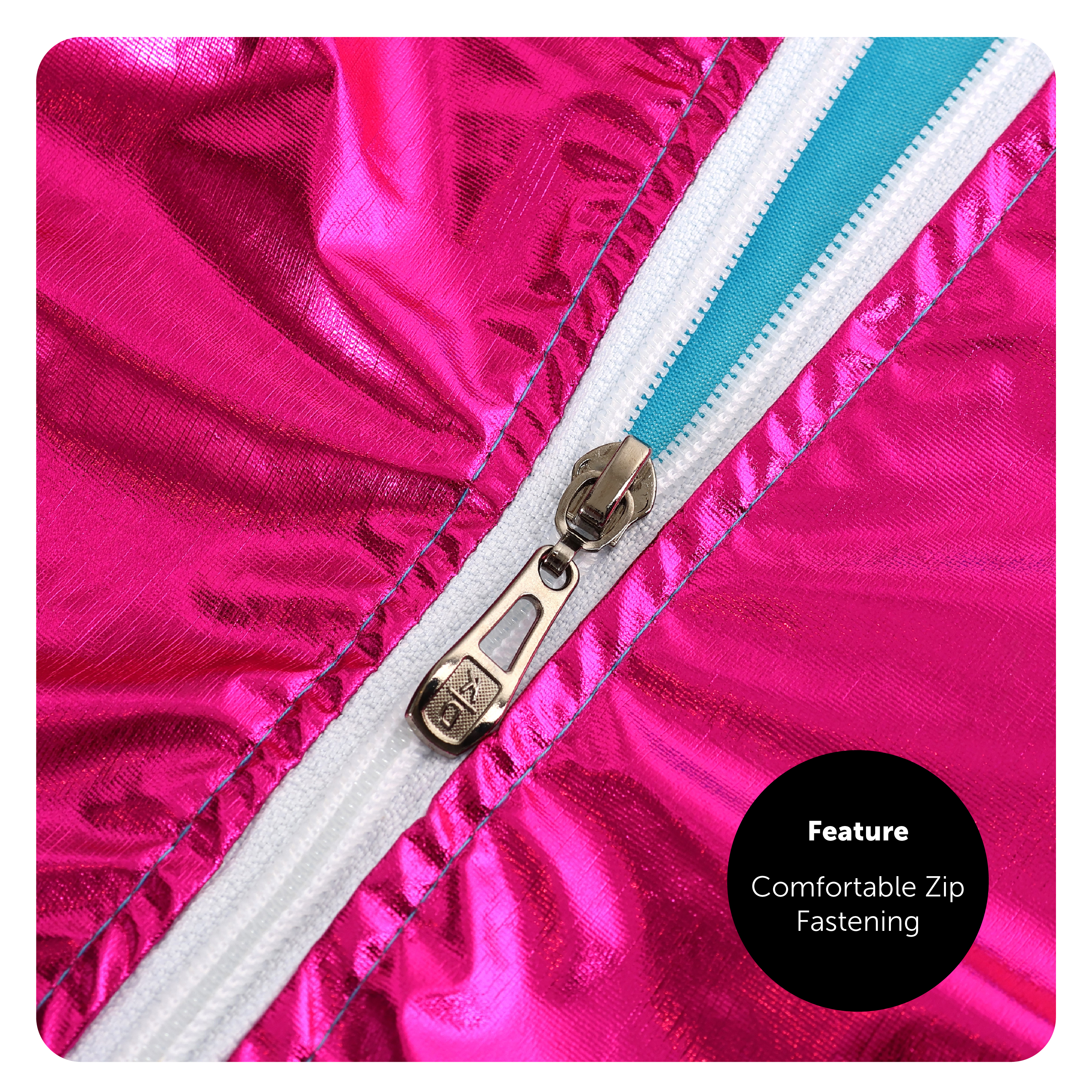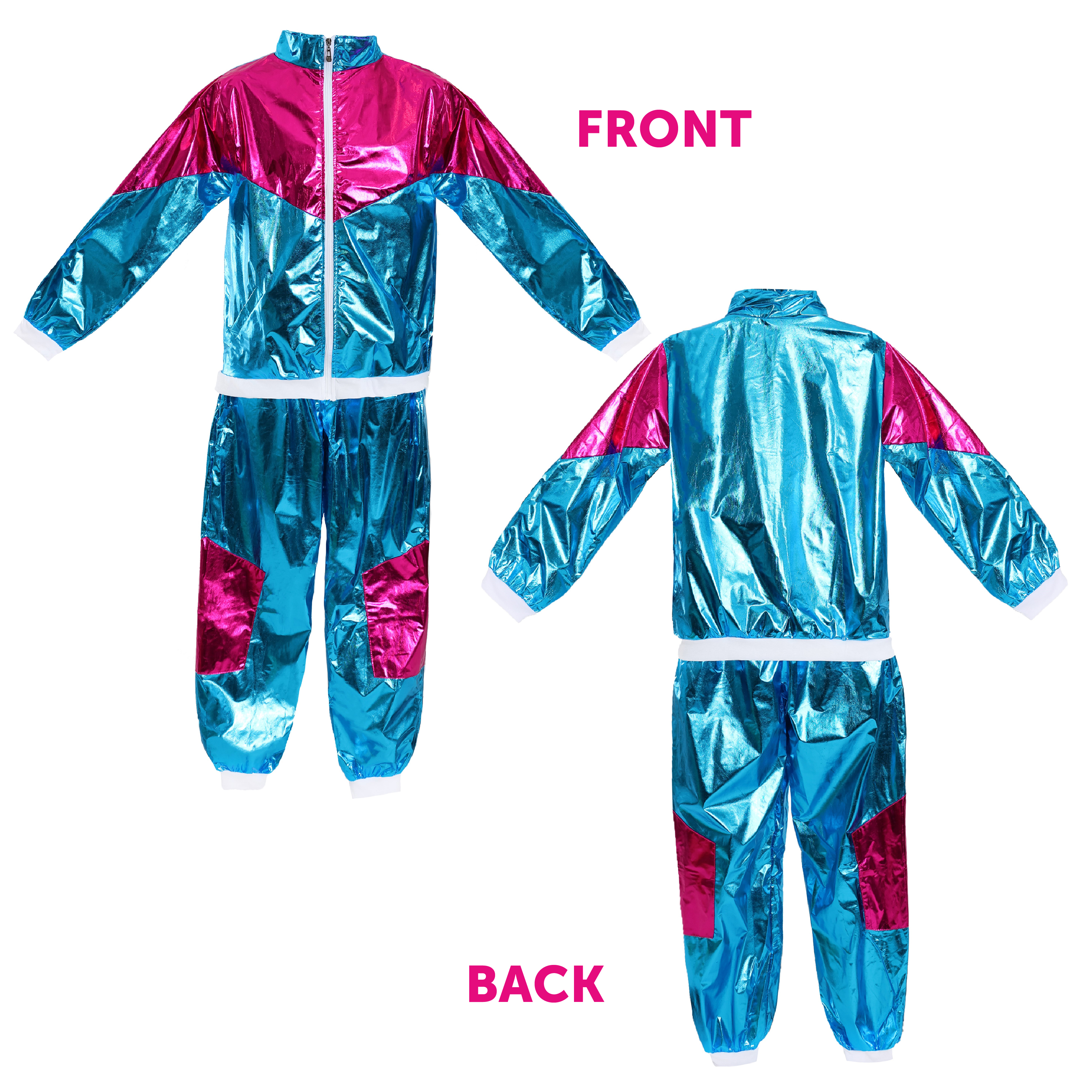 COSTUME INCLUDES: Your Adults Shell Suit Costume includes a Bright Blue Shiny Shell Suit Jacket with Pink and Purple Stripes across the shoulders and chest and comfortable zip up fastening, and matching Shell Suit Trousers with an elasticated waistband!