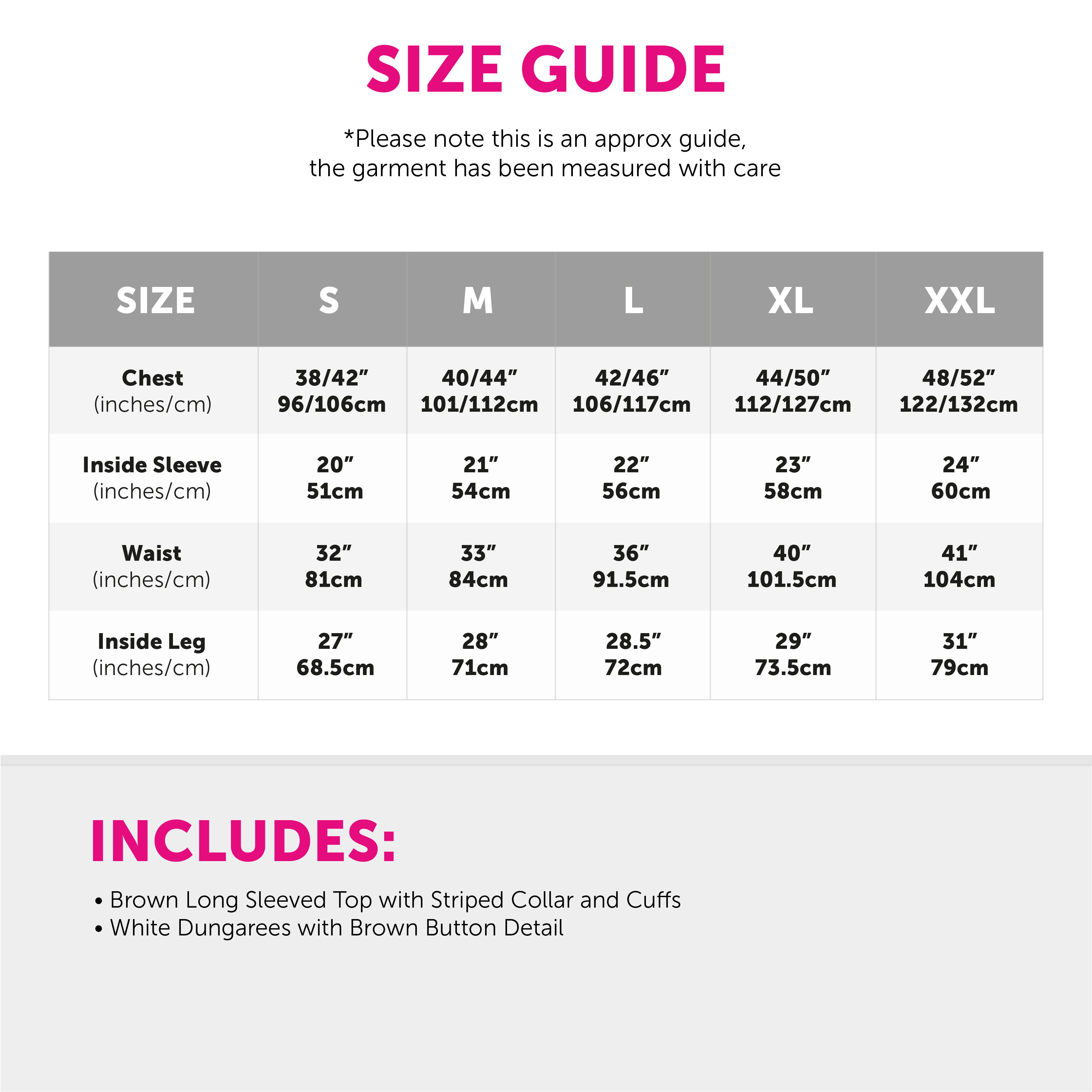 COSTUME DETAILS: This Adults Factory Worker Costume includes a Brown Long-Sleeved Top with Striped Collar and Cuffs and White Dungarees with Crossed Straps, the perfect Costume for World Book Day and other events!