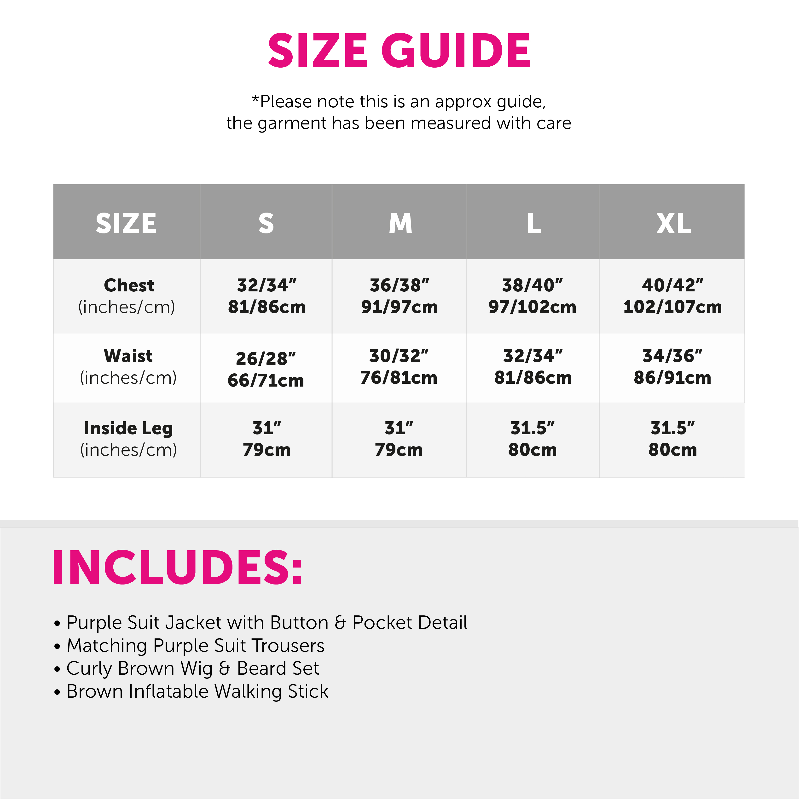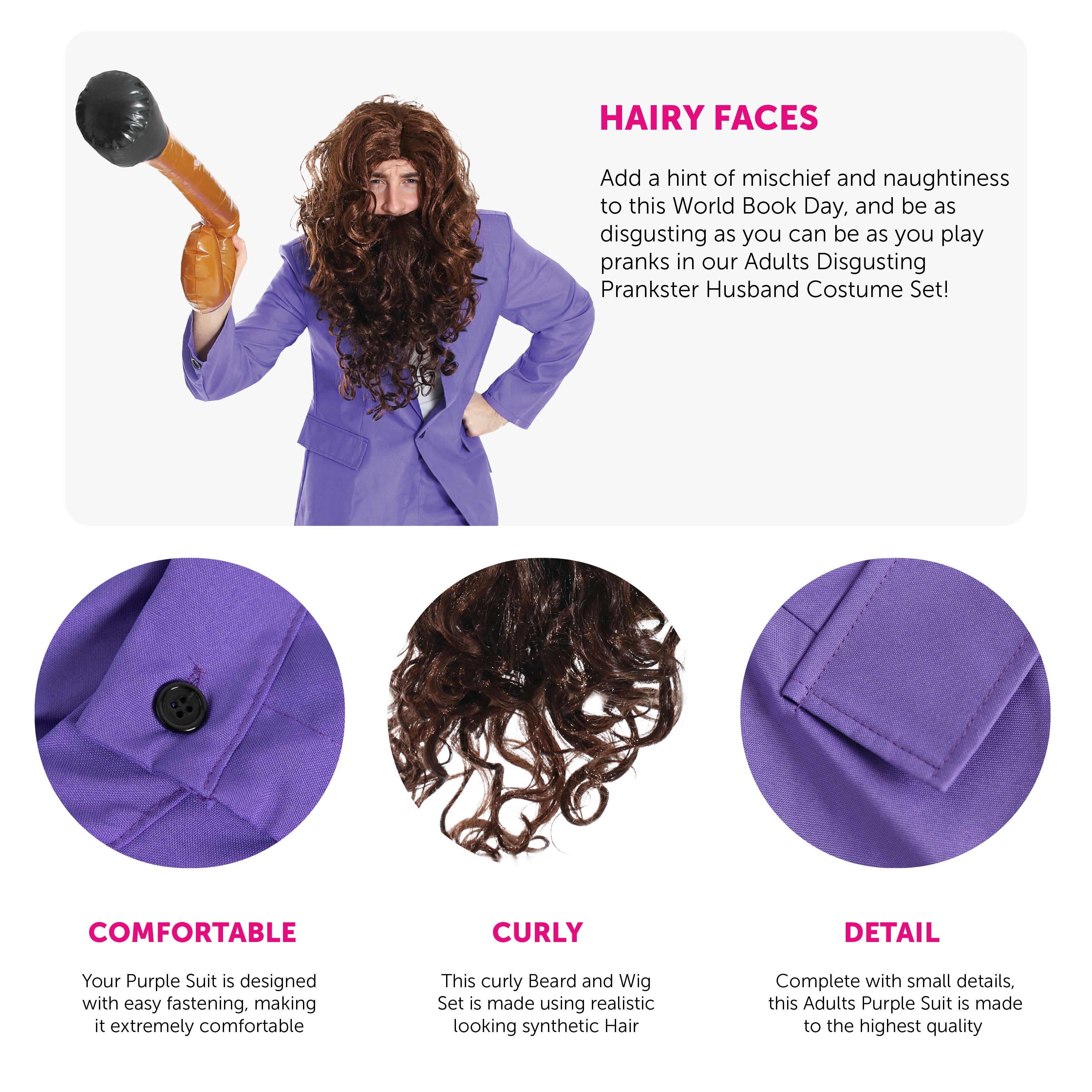 DISGUSTING PRANKSTER COSTUME INCLUDES: Your Adults Disgusting Prankster Husband Costume Set includes a Purple Suit Jacket with button detail, a pair of matching Purple Suit Trousers, a bushy Brown Beard and Wig set, and a life-sized brown Inflatable Walking Stick to complete your look!