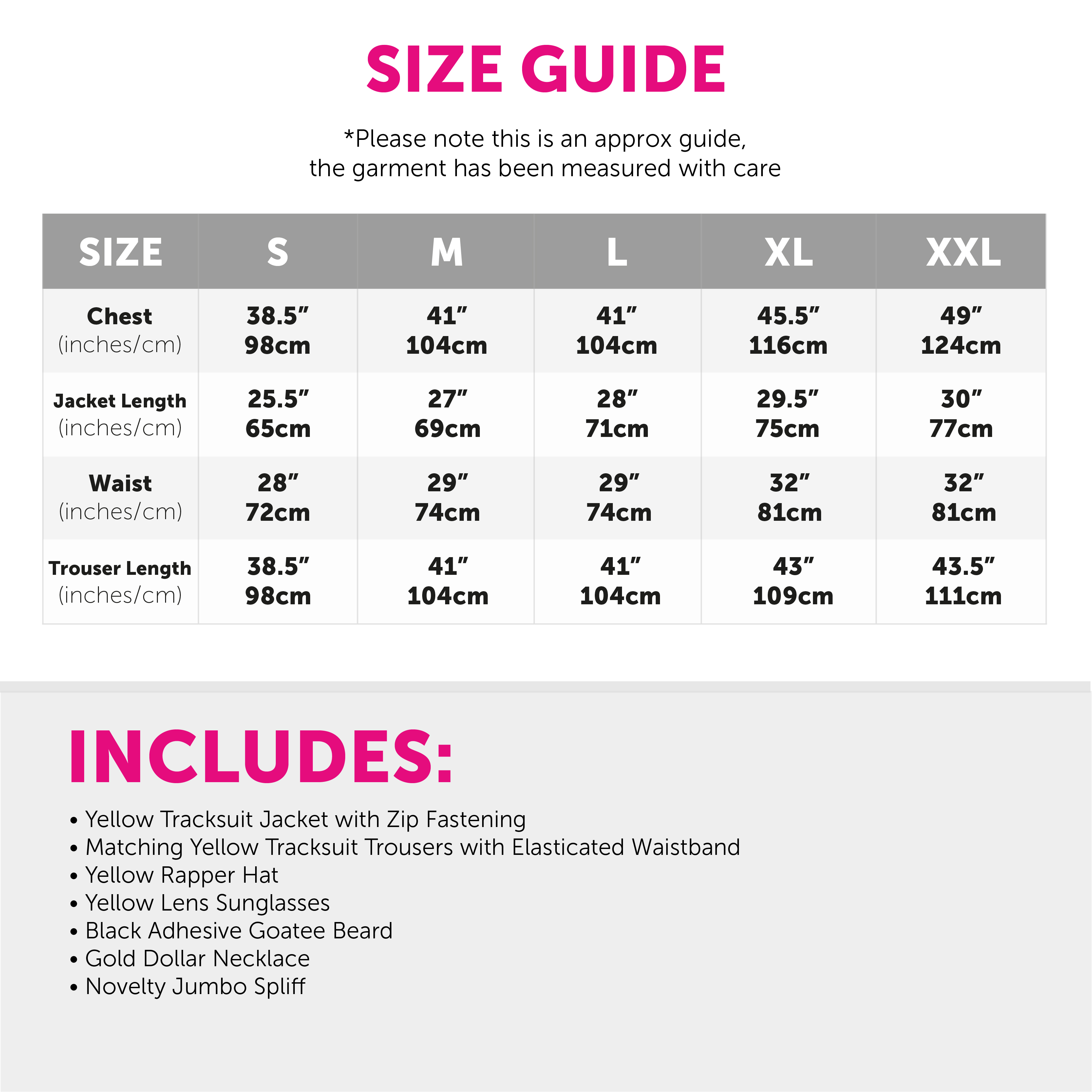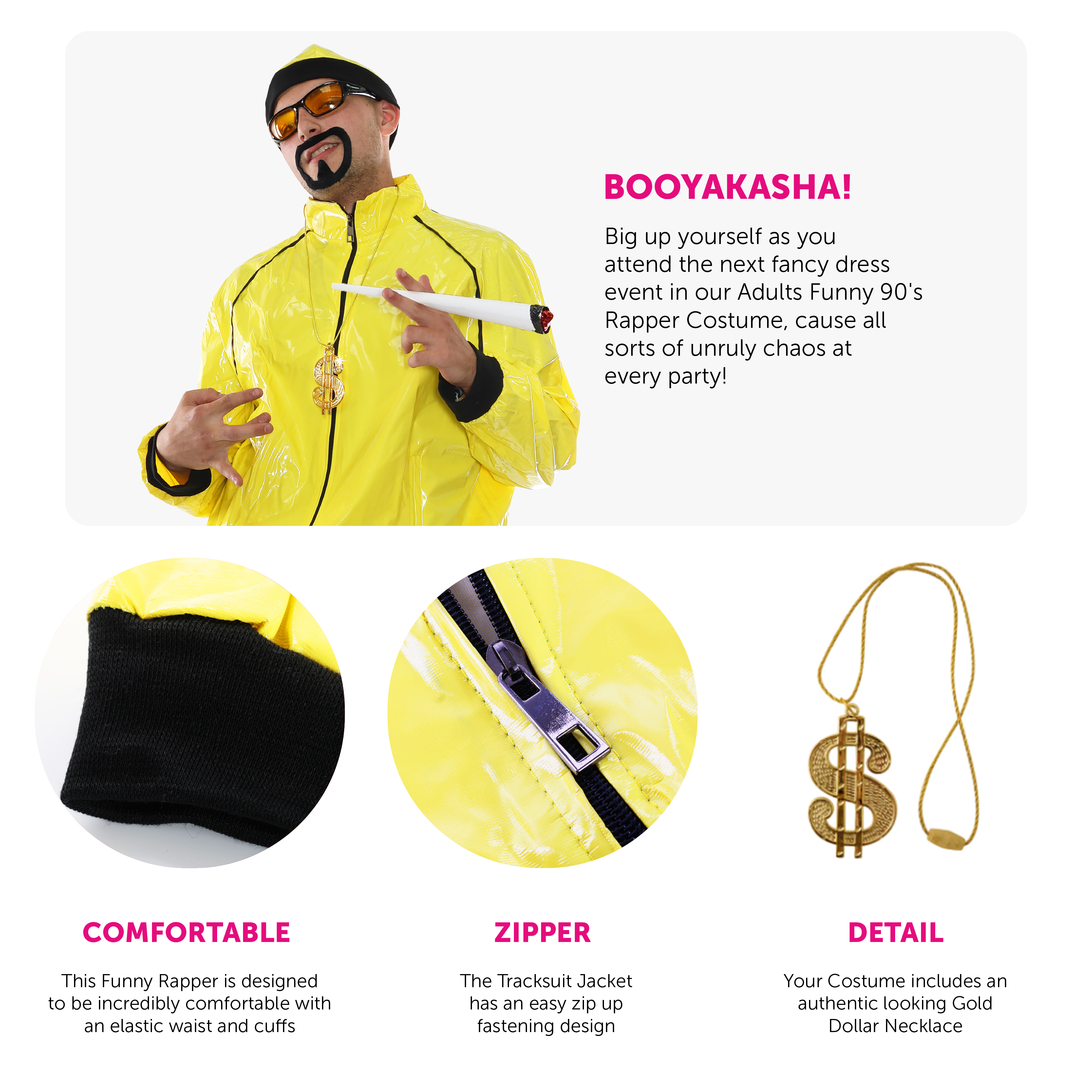 COSTUME DETAILS: Your Funny Rapper Costume includes a bright Yellow Tracksuit Jacket with matching Trousers, a Yellow Hat, Yellow Lens Sunglasses, a Black Adhesive Goatee Beard, a Gold Dollar Necklace, and a Novelty Jumbo Spliff, the perfect Costume set for any fancy dress event!