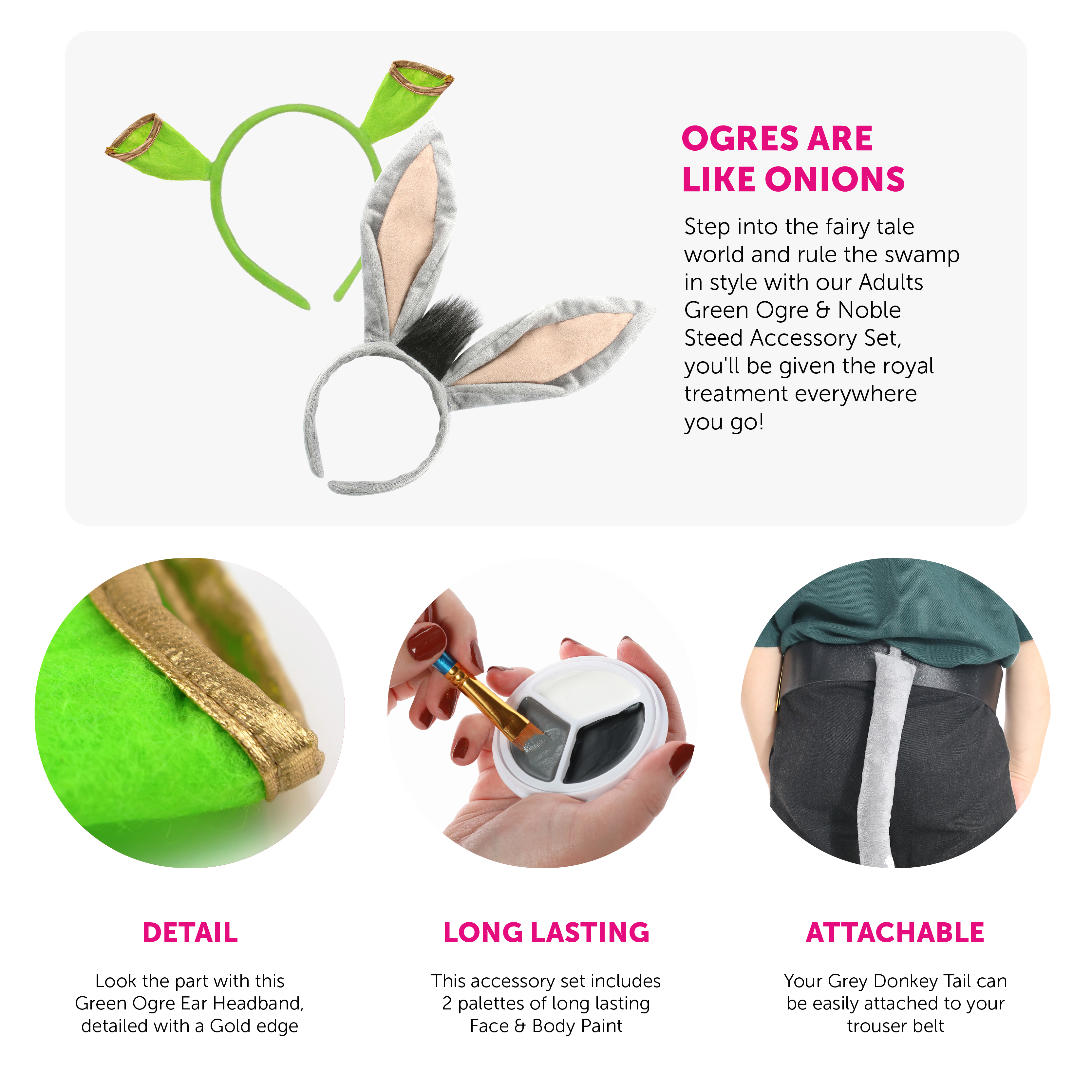 SET INCLUDES: This Adults Green Ogre & Noble Steed Accessory Set includes Green Ogre Ear Headband, a palette of Green Face & Body Paint, a Grey Donkey set with Long Ears and an attachable Tail, and a palette of White, Grey & Black Face & Body Paint, to help you finish off your desired look!