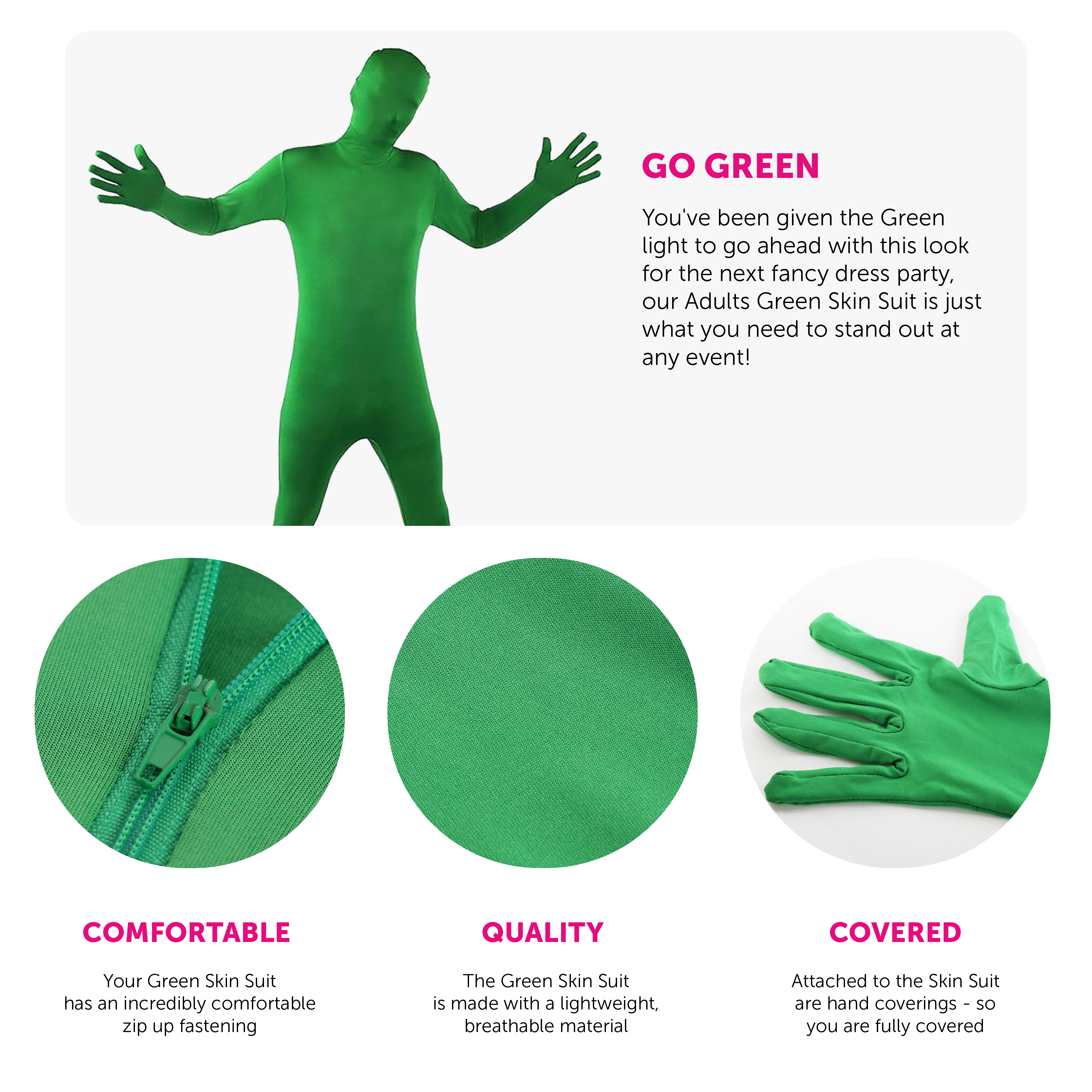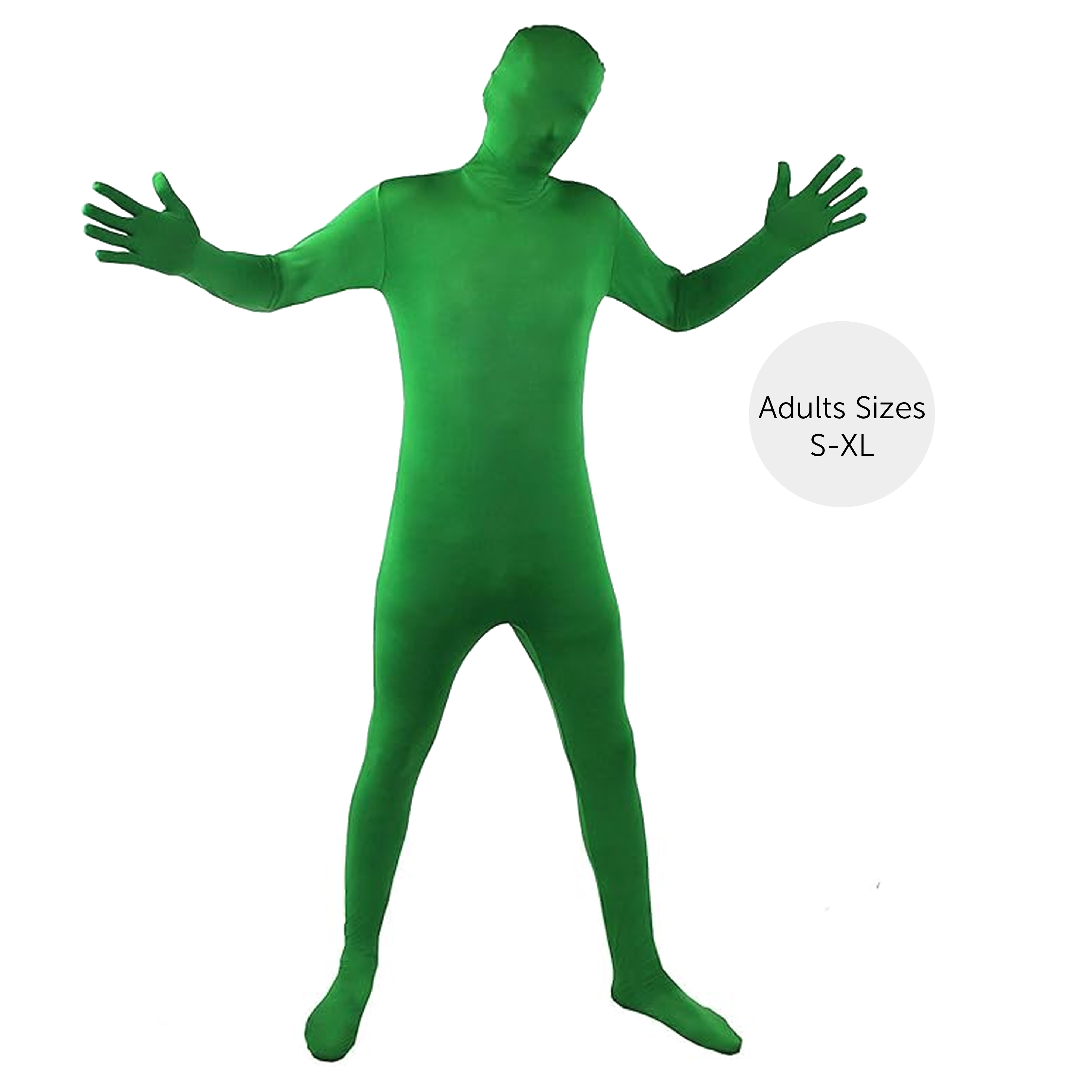 SKIN SUIT DETAILS: This Adults Skin Suit is a vibrant Green all-in-one Skin Suit with a zip up back, a mask that can be folded down when needed and attached hand coverings!