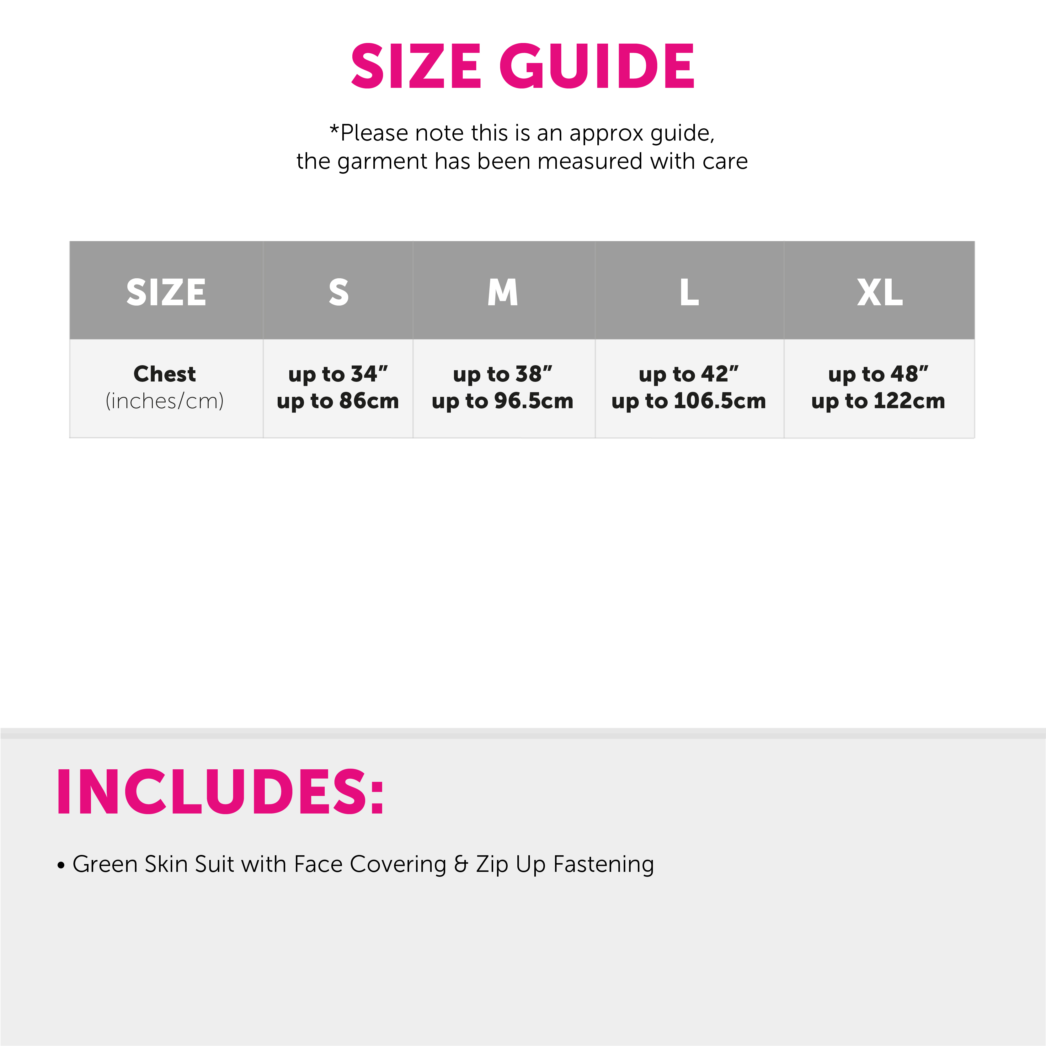 AVAILABLE IN MULTIPLE SIZES: Your Adults Green Skin Suit is available in multiple sizes from Small to X-Large: Small - Chest: Up To 34" (86cm) | Medium - Chest: Up To 38" (96.5cm) | Large: Up To 42" (106.5cm) | X-Large: Up To 48" (122cm)