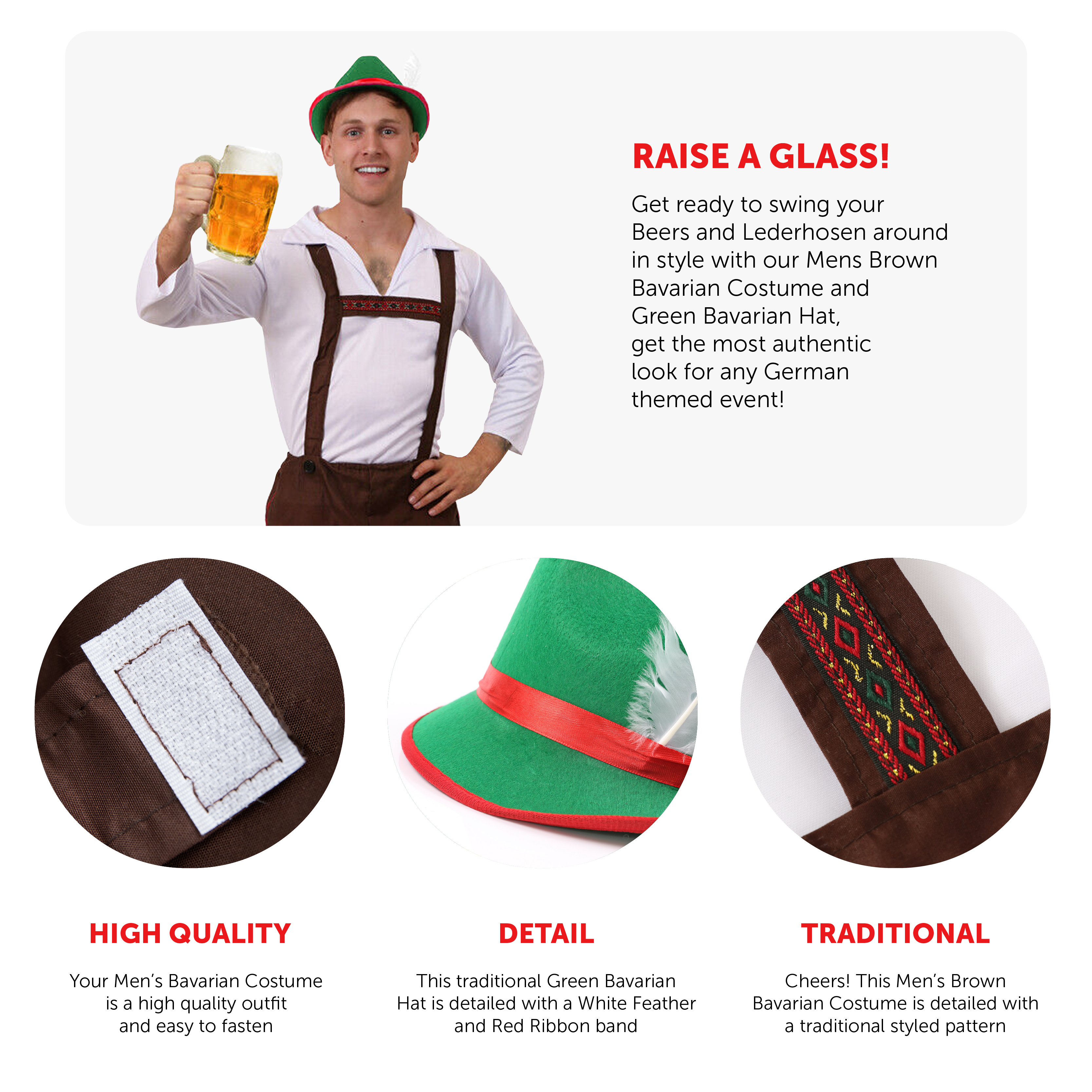 PERFECT FOR OKTOBERFEST & GERMAN FANCY DRESS: Whether you’re celebrating Oktoberfest, or attending a German fancy dress party, this Mens Brown Bavarian Costume and Green Bavarian Hat is the perfect choice for you!