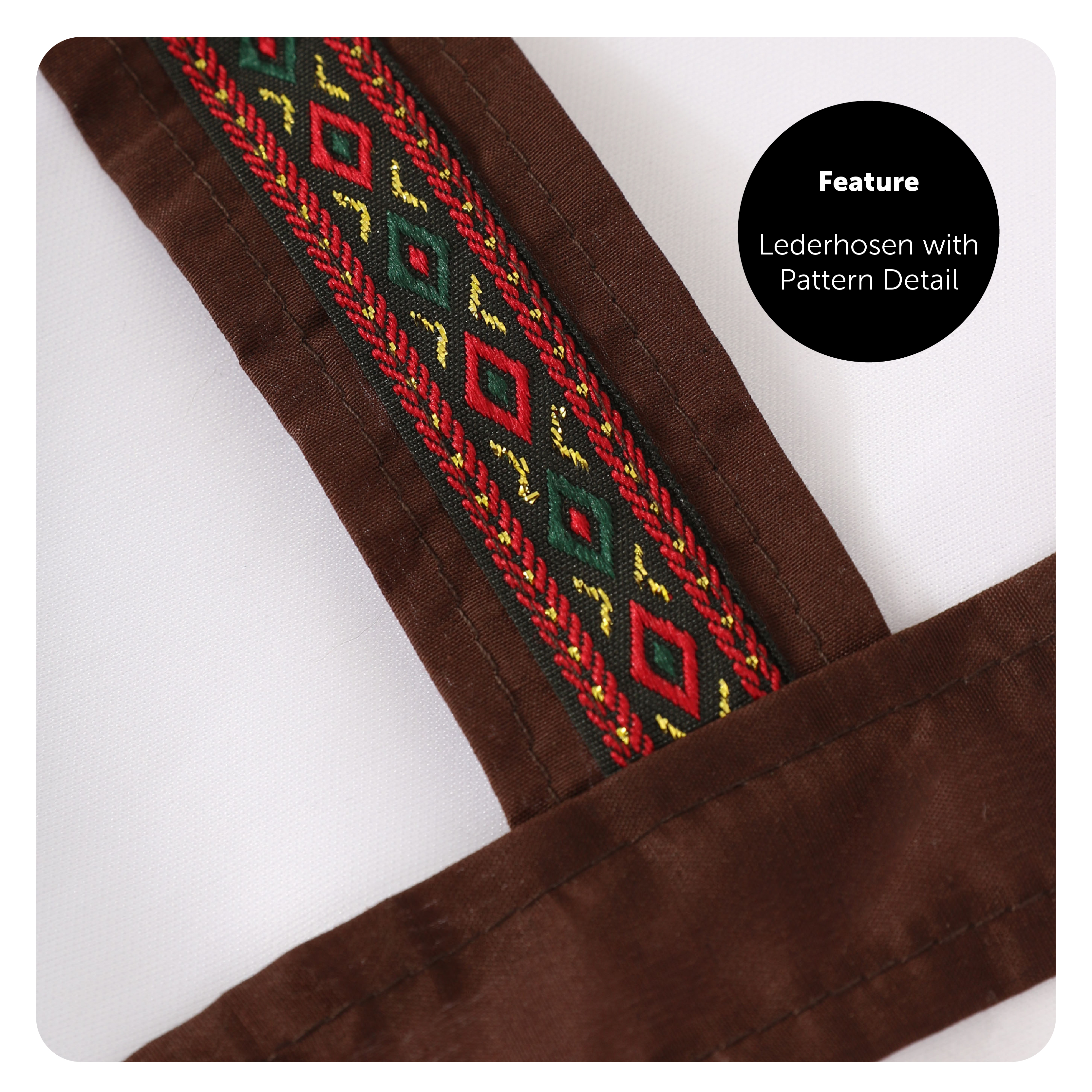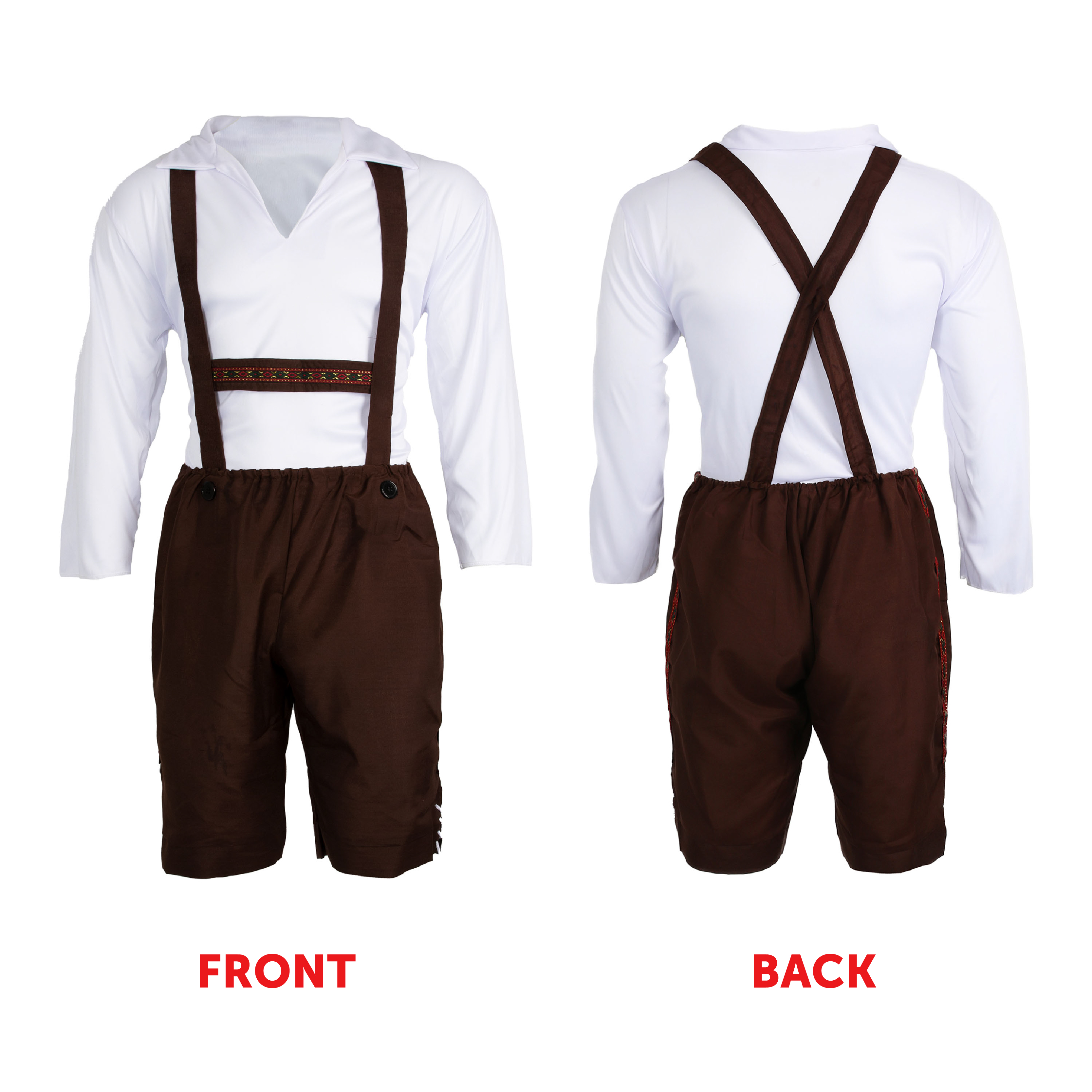 COSTUME INCLUDES: Your Mens Bavarian Costume includes a traditional Brown Lederhosen with detailed straps, a White long sleeved Shirt, and a Green Bavarian Hat with a Red Ribbon band and a White Feather, to complete your fantastic German look for any of your fancy dress events!