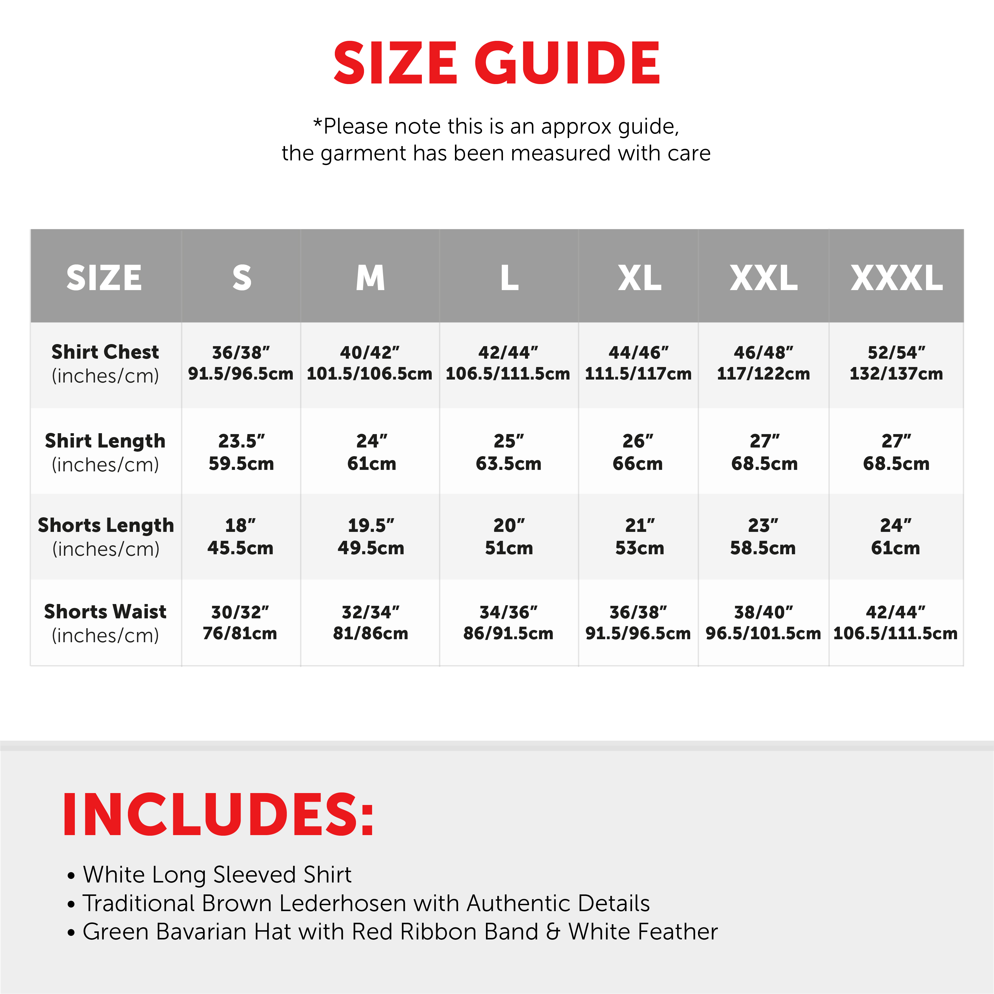 AVAILABLE IN MULTIPLE SIZES: Your Mens Bavarian Costume is available in multiple sizes from Small to XXX-Large: Small - Shirt Chest: 36/38" (91.5/96.5cm), Shirt Length: 23.5” (59.5cm), Shorts Length: 18” (45.5cm), Shorts Waist: 30/32" (76/81cm) | Medium - Shirt Chest: 40/42” (101.5/106.5cm), Shirt Length: 24” (61cm), Shorts Length: 19.5” (49.5cm), Shorts Waist: 32/34” (81/86cm) | Large - Shirt Chest: 42/44” (106.5/111.5cm), Shirt Length: 25” (63.5cm), Shorts Length: 20” (51cm), Shorts Waist: 34/36” (86/91.5cm) | X-Large - Shirt Chest: 44/46” (111.5/117cm), Shirt Length: 26” (66cm), Shorts Length: 21” (53cm), Shorts Waist: 36/38" (91.5/96.5cm) | XX-Large - Shirt Chest: 46/48” (117/122cm), Shirt Length: 27” (68.5cm), Shorts Length: 23” (58.5cm), Shorts Waist: 38/40" (96.5/101.5cm) | XXX-Large - Shirt Chest: 52/54” (132/137cm), Shirt Length: 27” (68.5cm), Shorts Length: 24” (61cm), Shorts Waist: 42/44” (106.5/111.5cm)