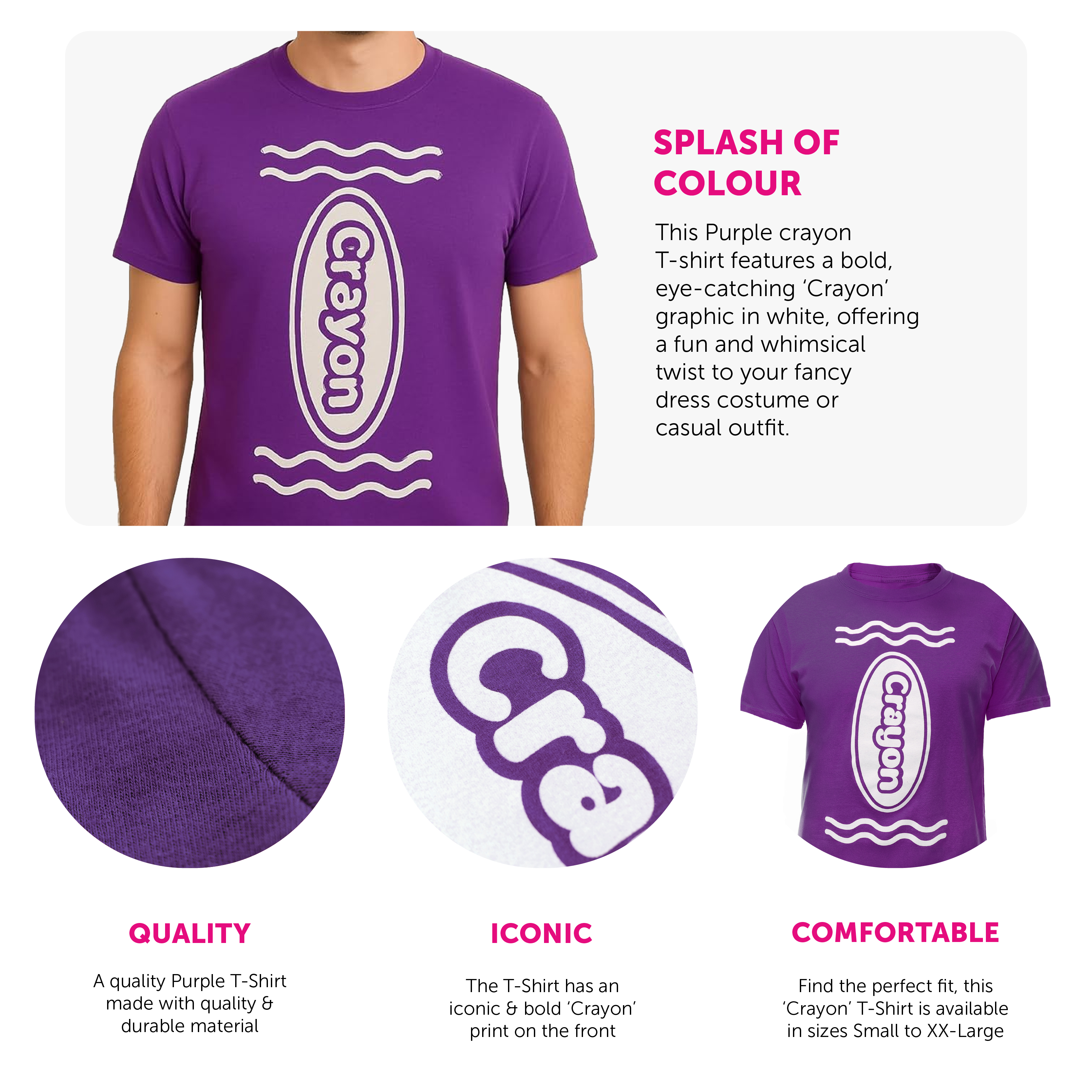 FUN AND CREATIVE DESIGN: This Purple crayon T-shirt features a bold, eye-catching "Crayon" graphic in white, offering a fun and whimsical twist to your fancy dress costume or casual outfit.