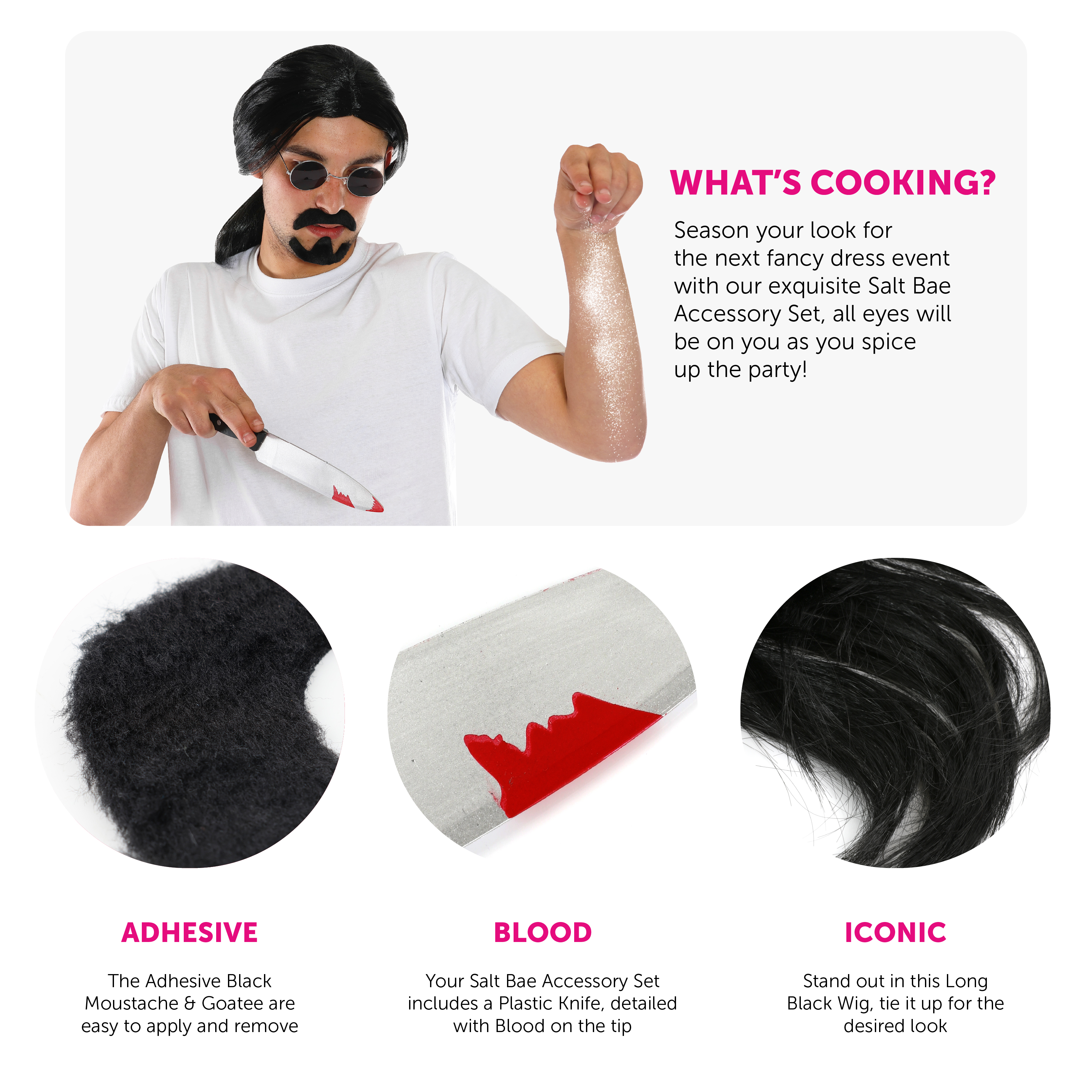 SET INCLUDES: The Salt Bae Accessory Set includes a Long Black Wig, Black Lens Round Hippy Glasses, an Adhesive Goatee that can be cut in half for the desired look, and a Plastic Knife with Blood detail on the tip, the perfect set for any fancy dress event!