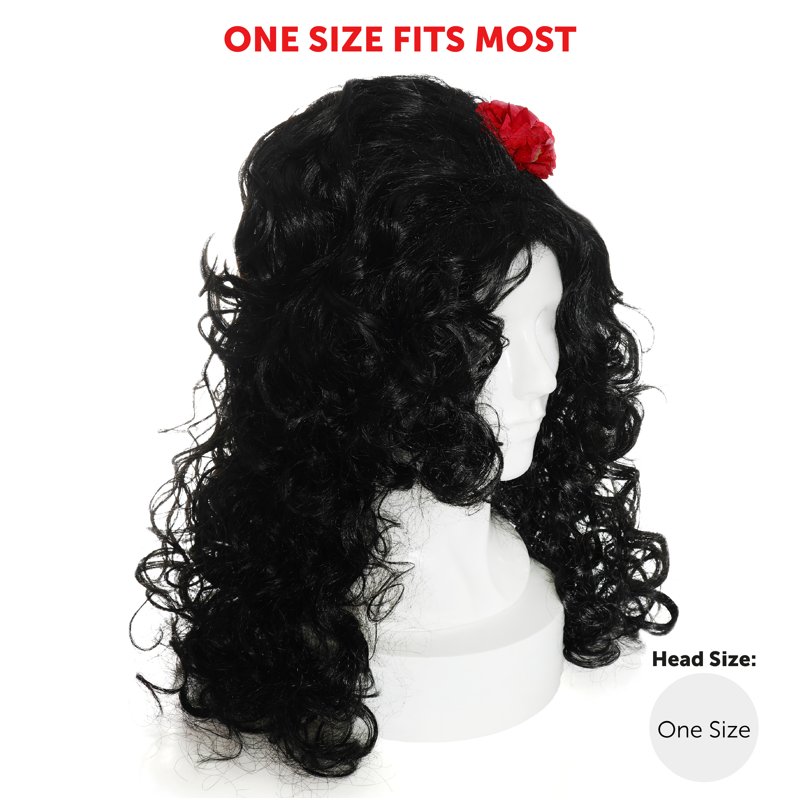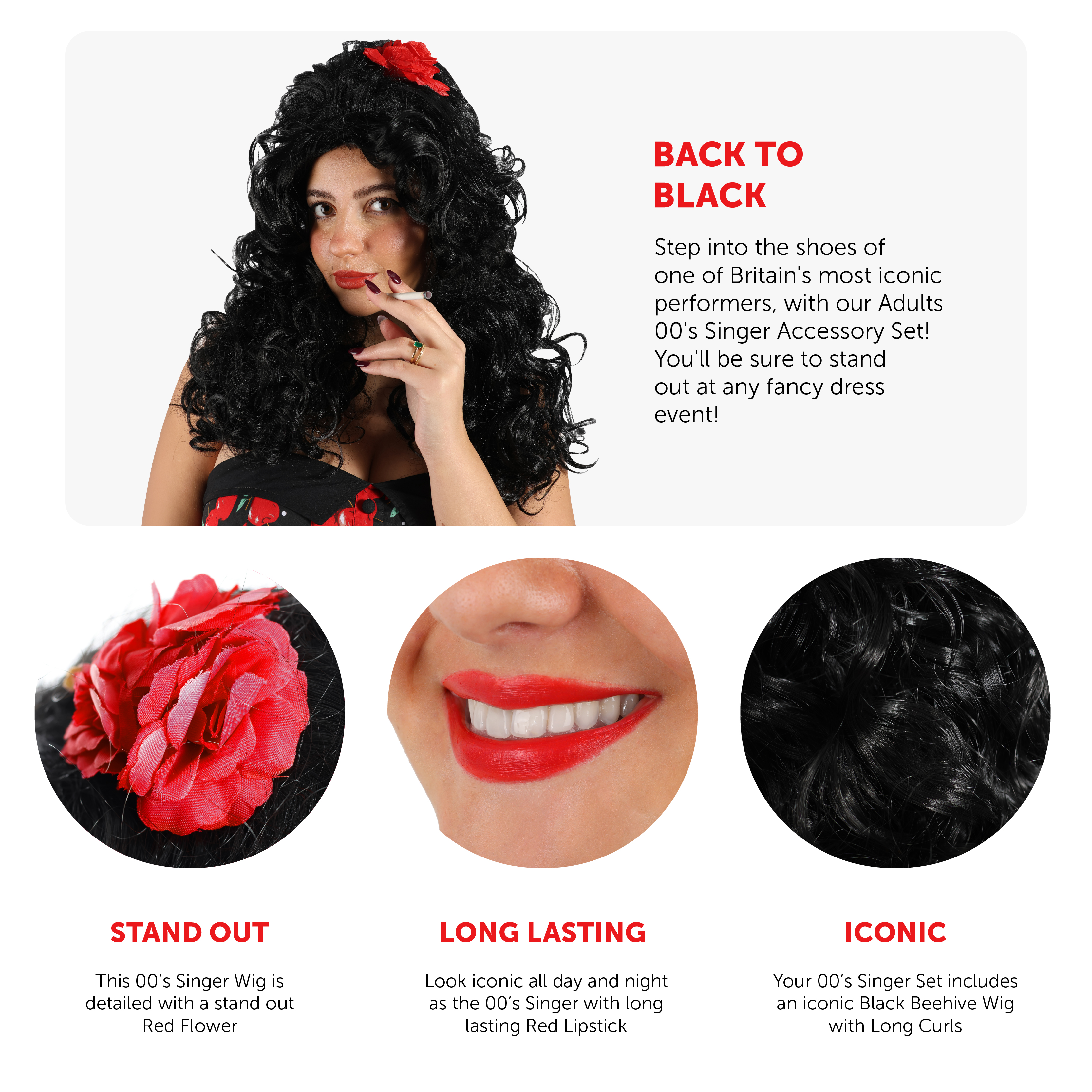 SET DETAILS: This Accessory Set includes a glamorous looking Long Curly Black Wig, styled into a stand out Beehive and detailed with a Red Flower, Temporary Tattoos, and long lasting Red Lipstick, the perfect addition to your music themed fancy dress costume!