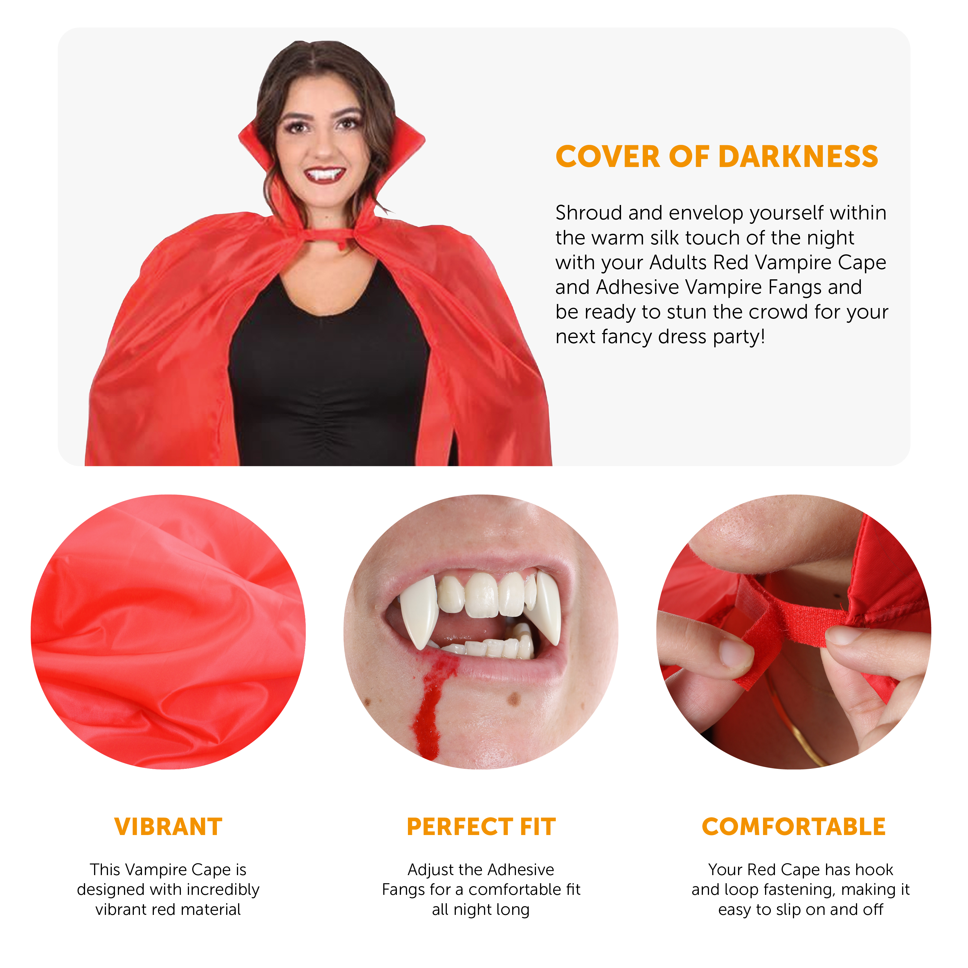 ADULTS RED VAMPIRE CAPE & VAMPIRE FANGS: Shroud and envelop yourself within the warm silk touch of the night with your Adults Red Vampire Cape and Vampire Fangs and be ready to stun the crowd for your next fancy dress party!