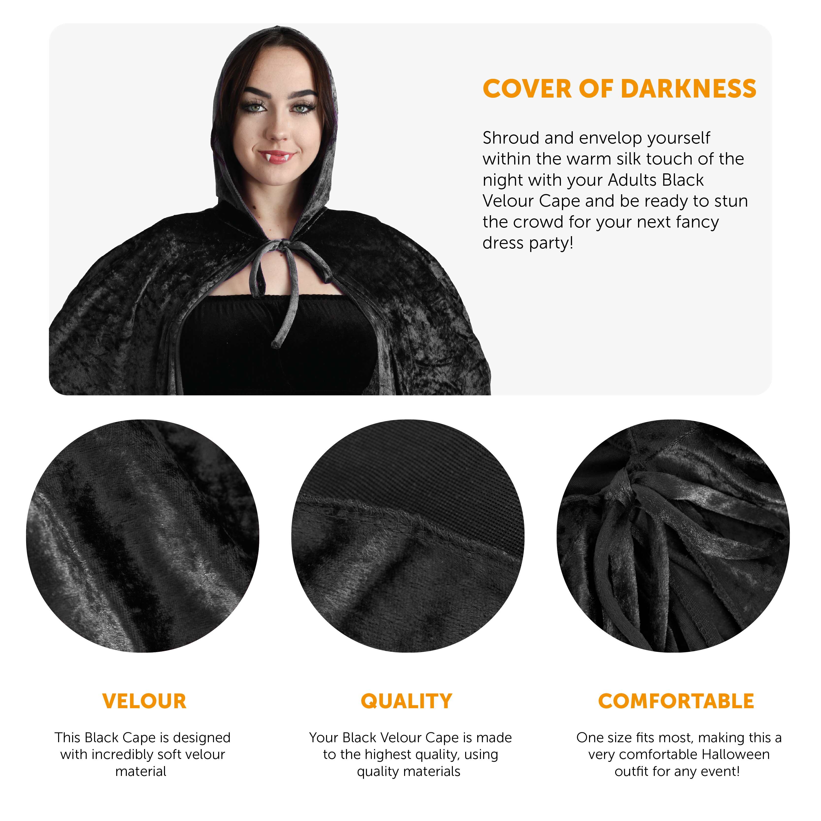 ADULTS BLACK VELOUR CAPE: Shroud and envelop yourself within the warm silk touch of the night with your Adults Black Velour Cape and be ready to stun the crowd for your next fancy dress party!