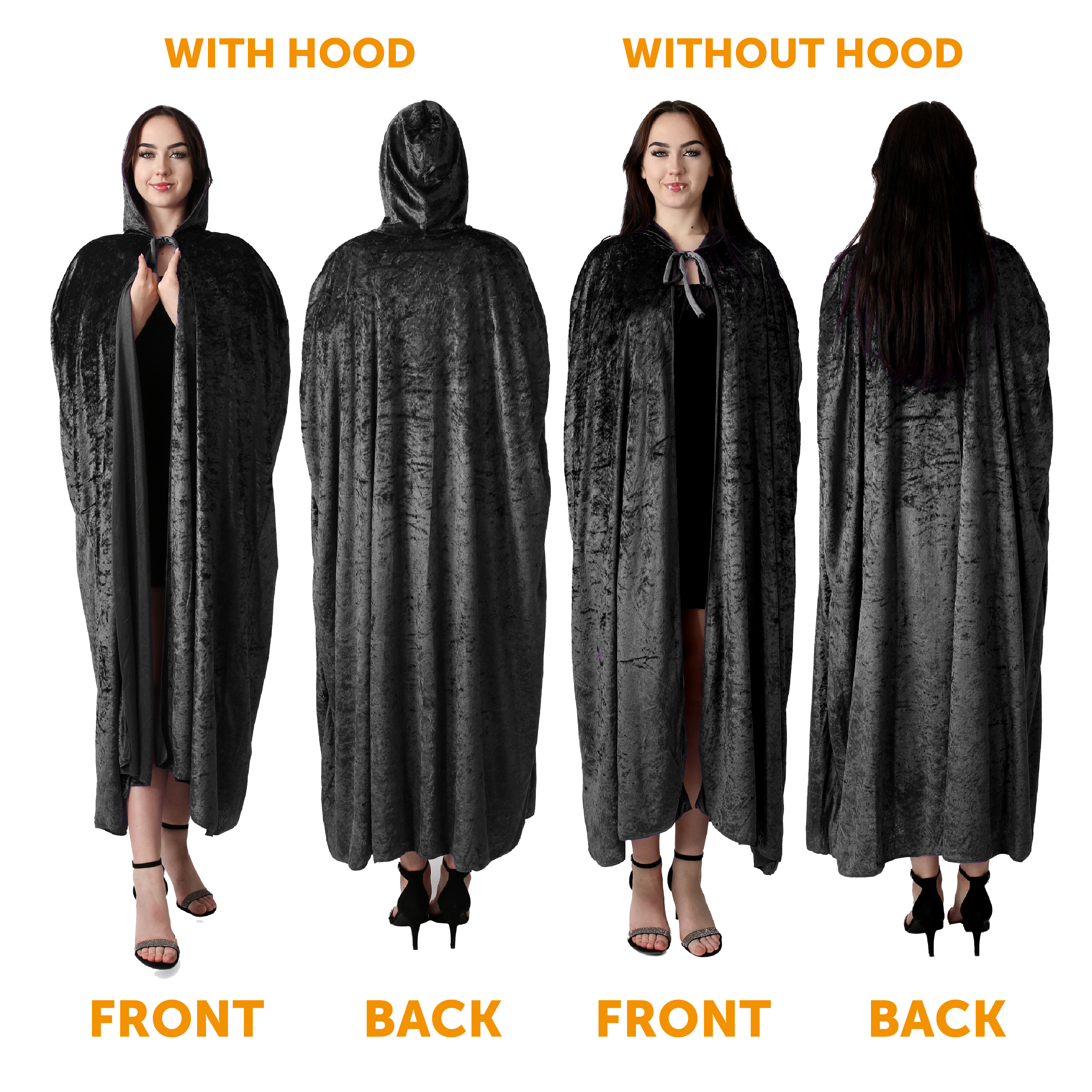 ADULTS LONG VELOUR CAPE DETAILS: Your Adults Black Velour Cape is a long, calve-length cape, with an attached hood on the cape, and a Black drawstring to tie the cape across your neck comfortably!
