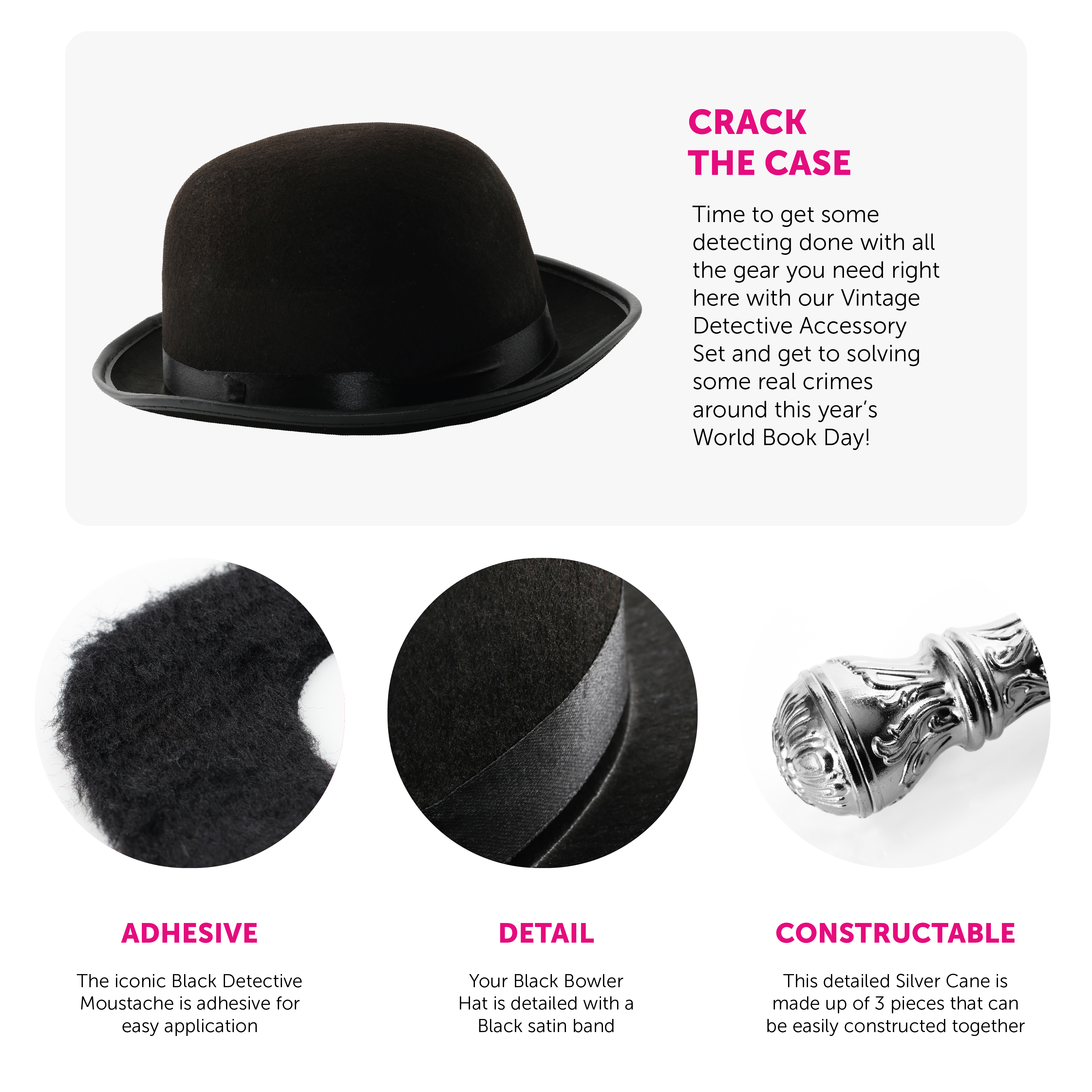 WHAT’S INCLUDED: The set includes a black bowler hat, black adhesive handlebar moustache, and a silver cane, offering everything you need for an iconic detective transformation.