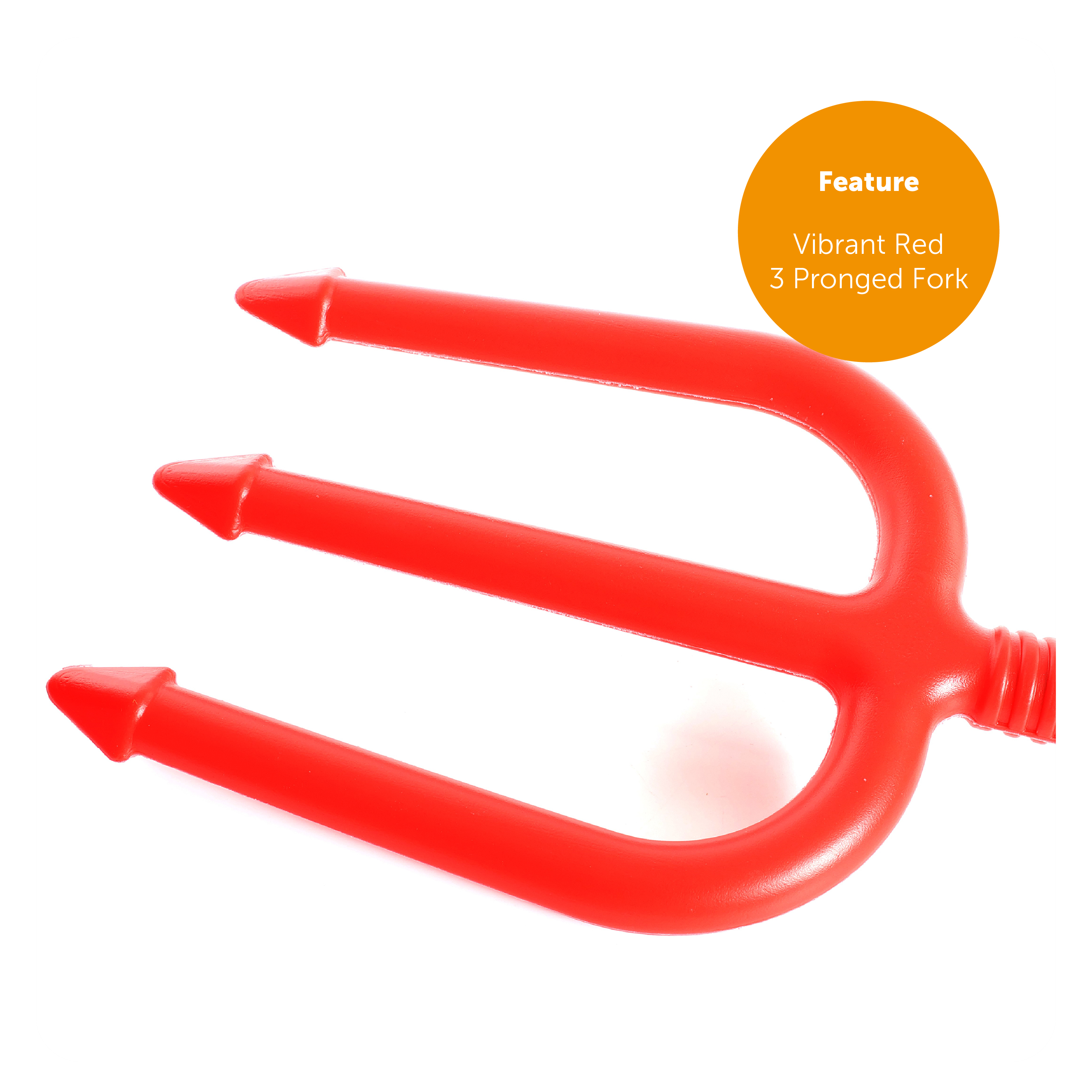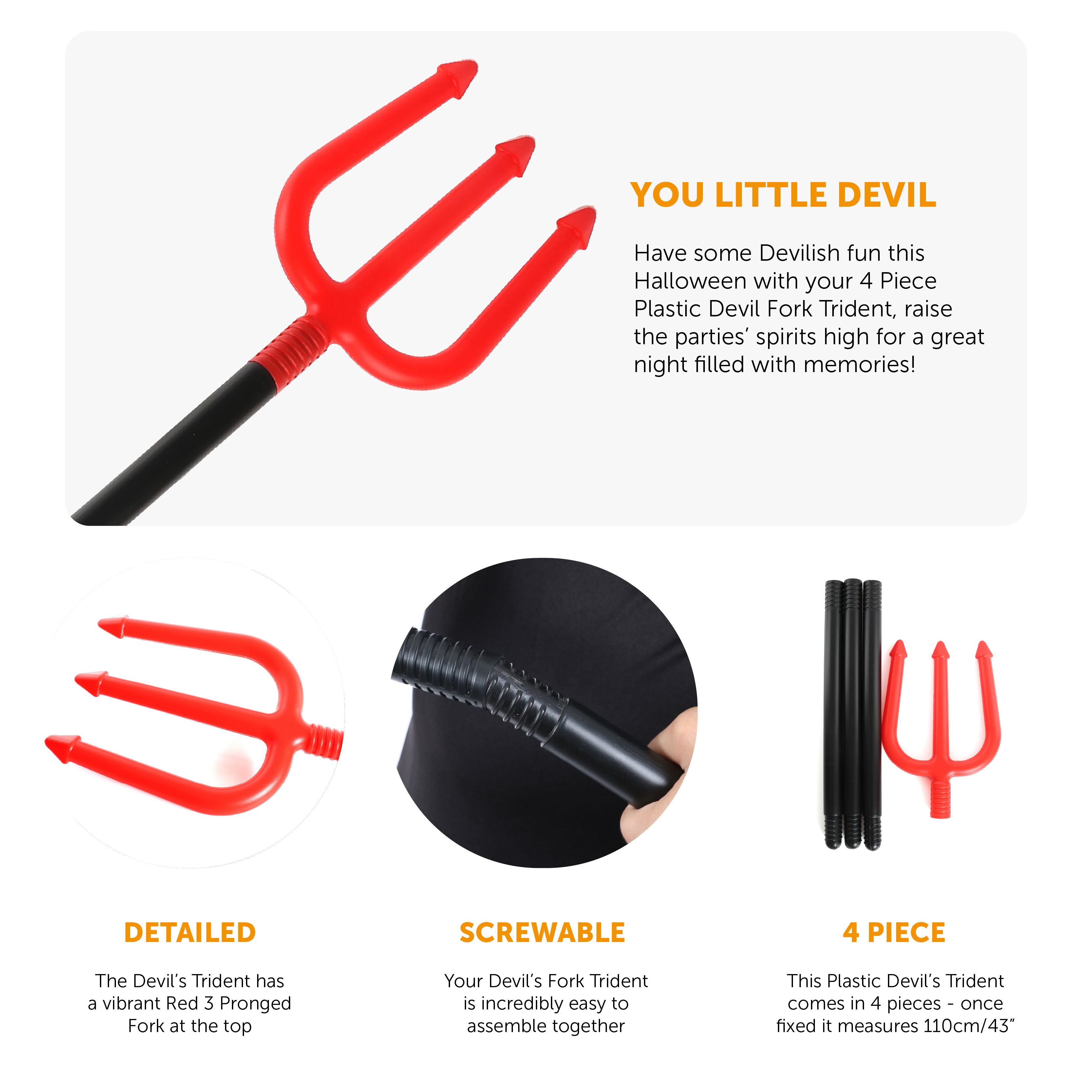 FORK DETAILS: A 4 Piece Devil's Trident with a screwable black plastic handle and a Red, three-pronged Fork at the end, the perfect accessory to act Devilish all night long!
