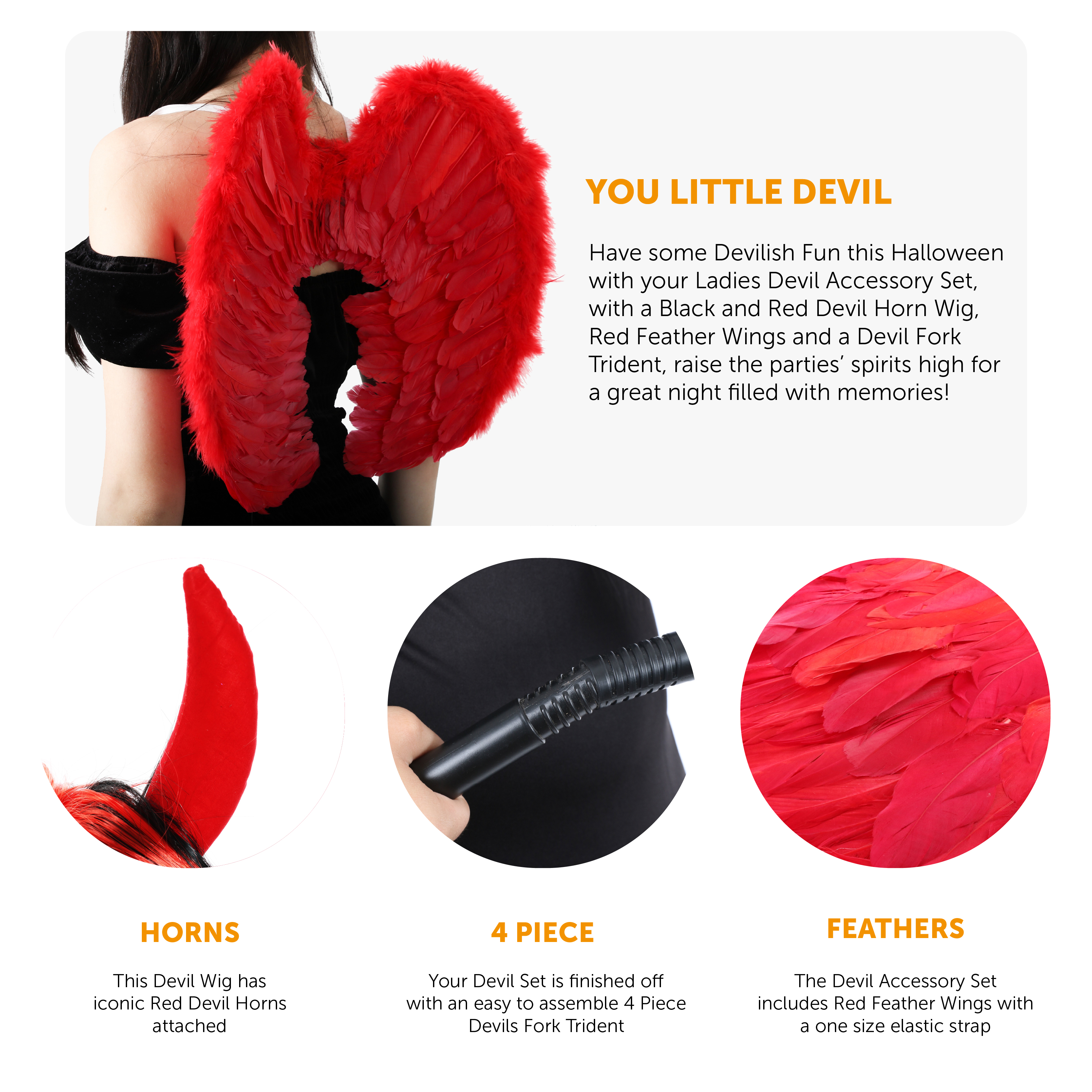 SET INCLUDES: This Ladies Devil Accessory Set includes a long Black and Red Wig with Red Devil Horns attached, Red Feather Wings with elasticated straps, and an easy to assemble 4 Piece Plastic Devil Fork Trident, the perfect accessory to act Devilish all night long!