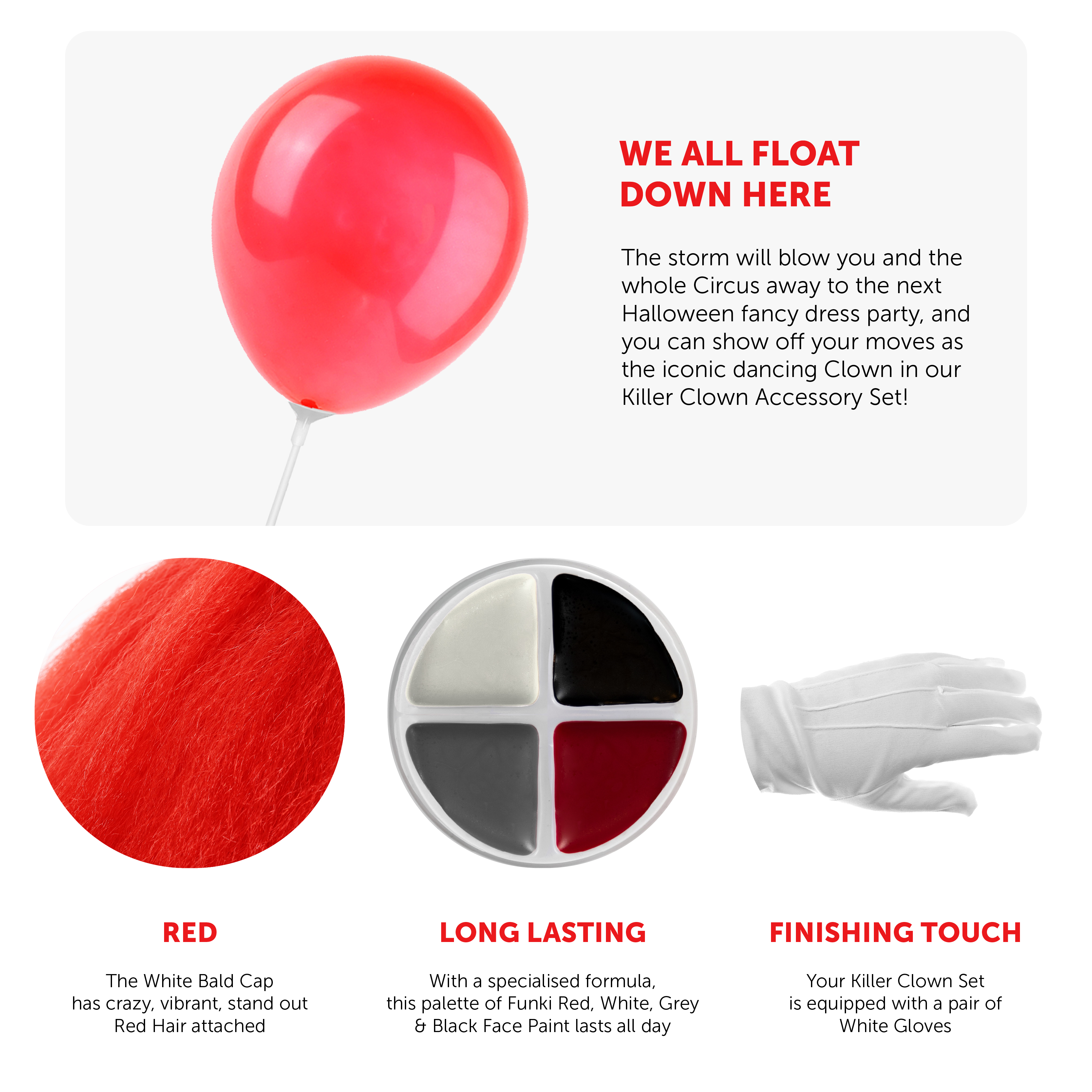 SET INCLUDES: Your Killer Clown Accessory Set includes a White Bald Cap with a long Red Wig attached, White Gloves, a Red Balloon with a Balloon Stick, and a palette of Black, White, Grey and Red Face Paint with a Sponge and a Tube of Fake Blood, a perfect set to get yourself ready to be a terror of the night!