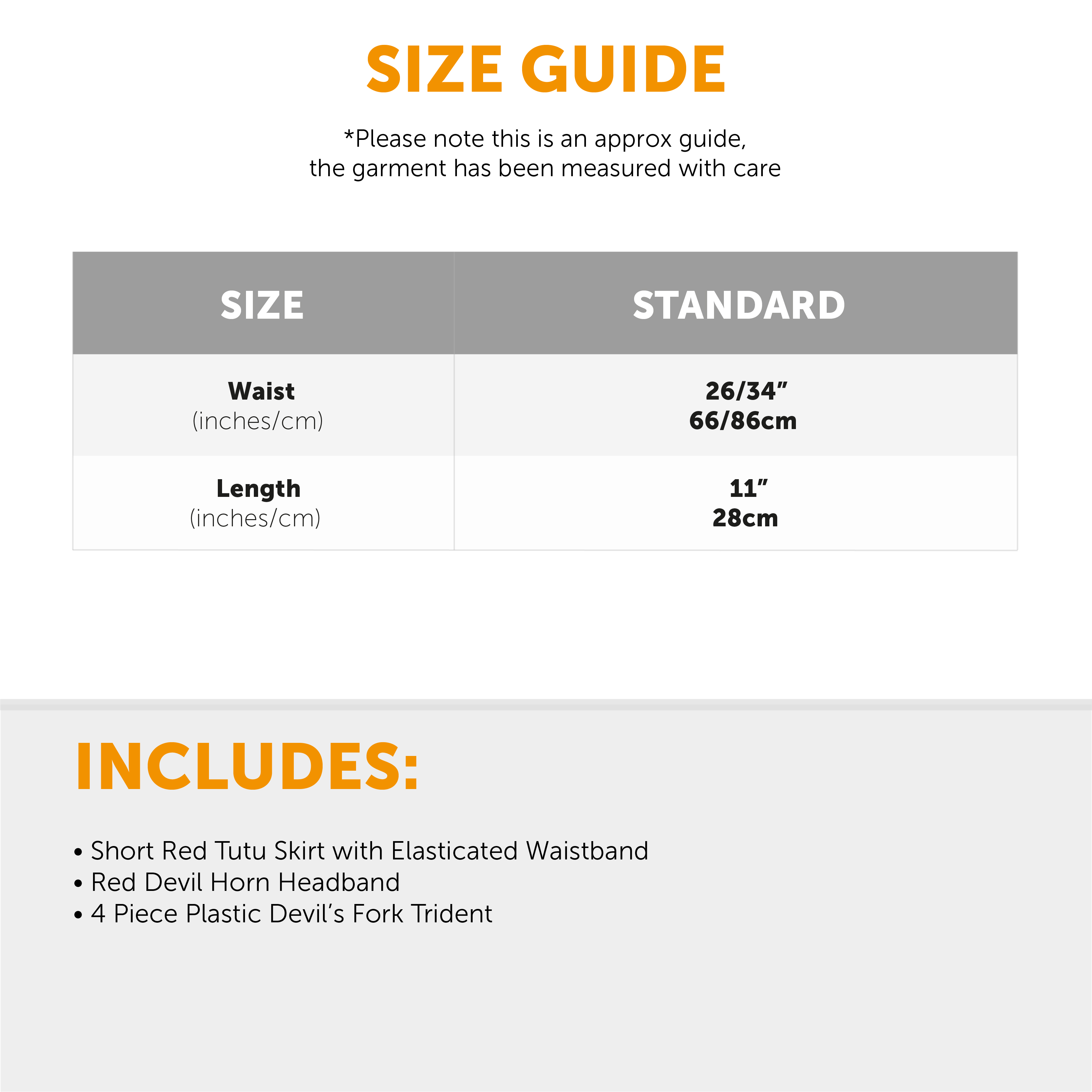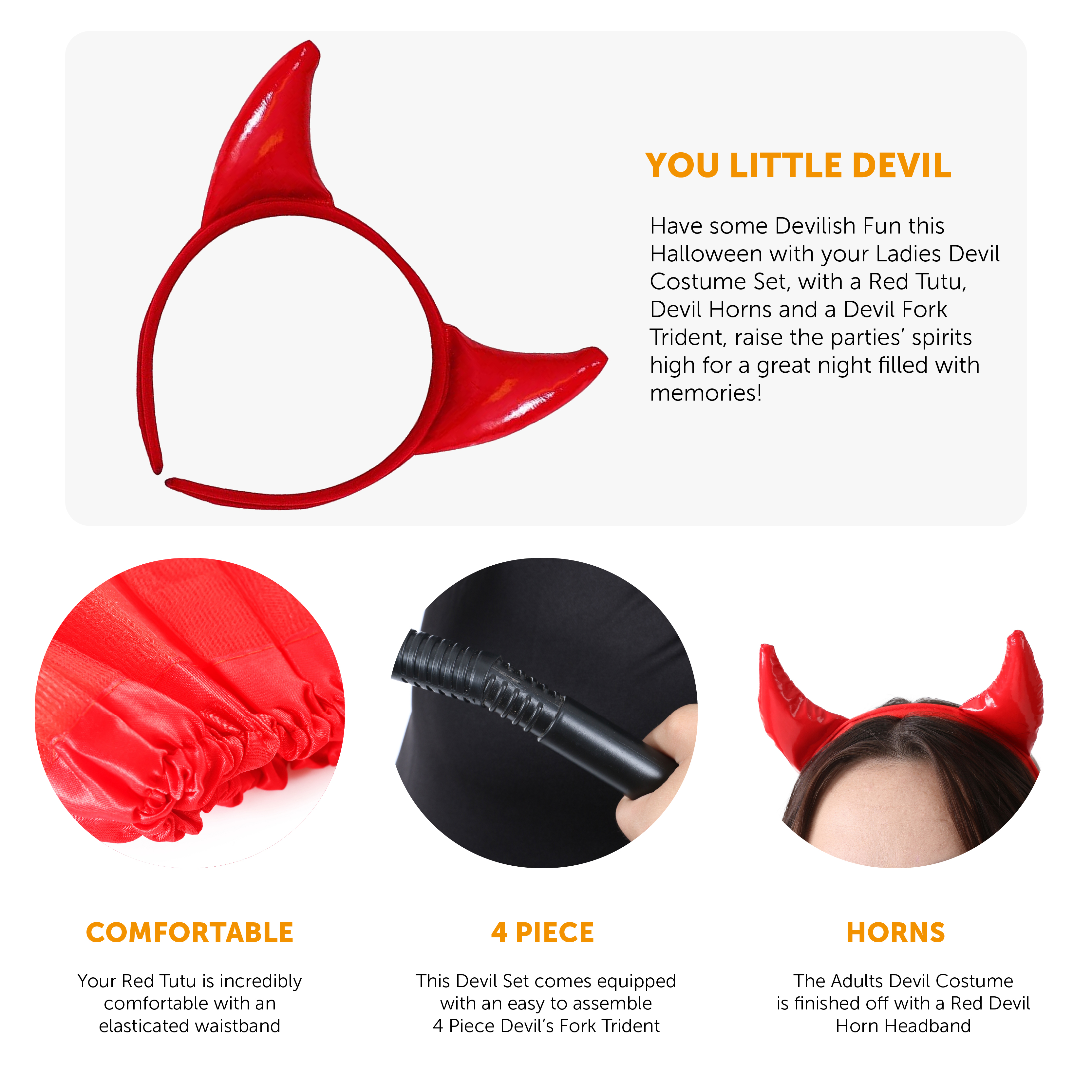 COSTUME DETAILS: This Ladies Devil Costume Set includes a vibrant Red Tutu with netted layers and an elasticated waistband, a Red Devil Horn Headband and an easy to assemble 4 Piece Plastic Devil Fork Trident, the perfect Costume to act Devilish all night long!
