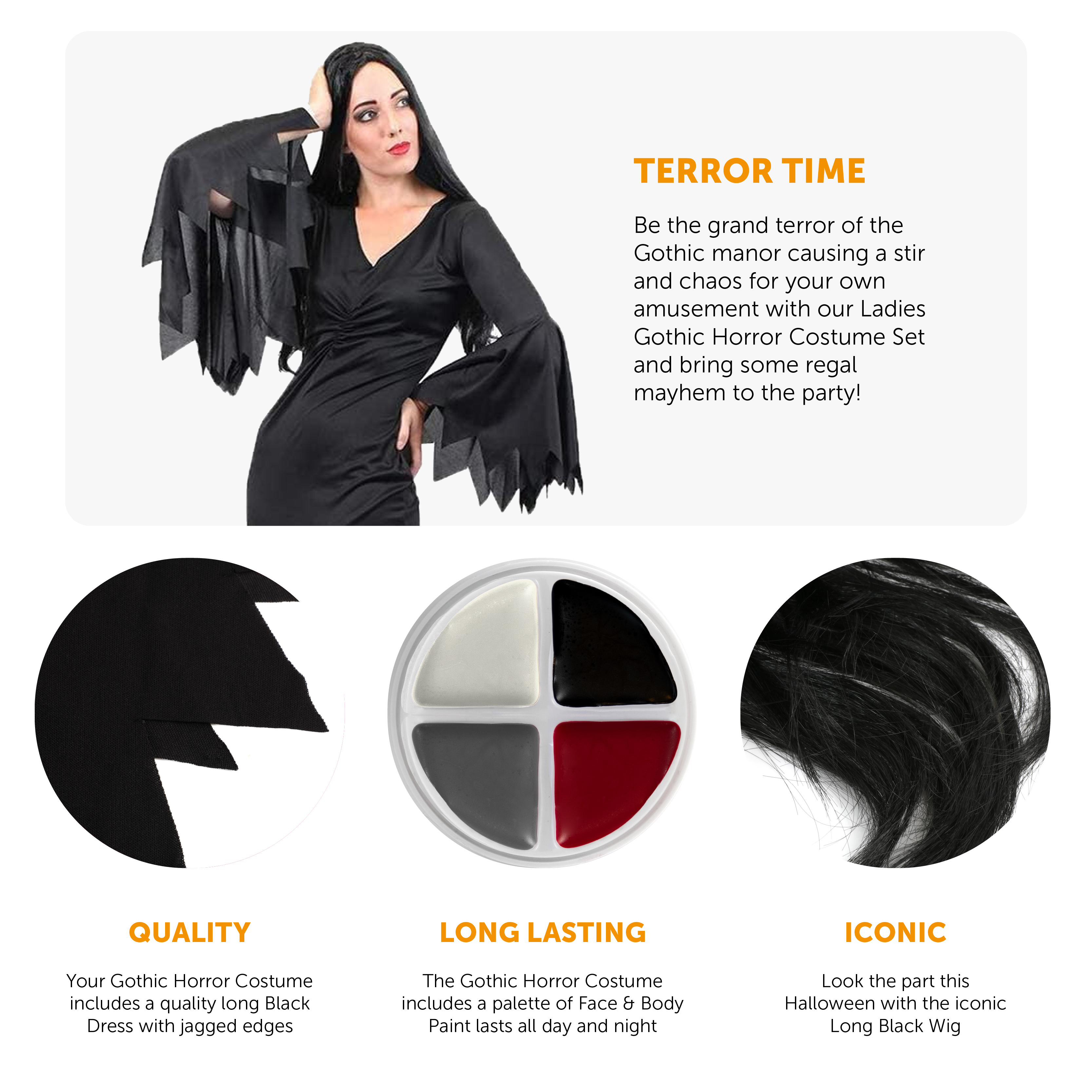COSTUME DETAILS: Your Ladies Gothic Horror Halloween Costume Set includes a Long Black Dress with tattered edges, a Long Black Wig, a palette of Face & Body Paint, and Red Lipstick, the perfect Halloween look this year!