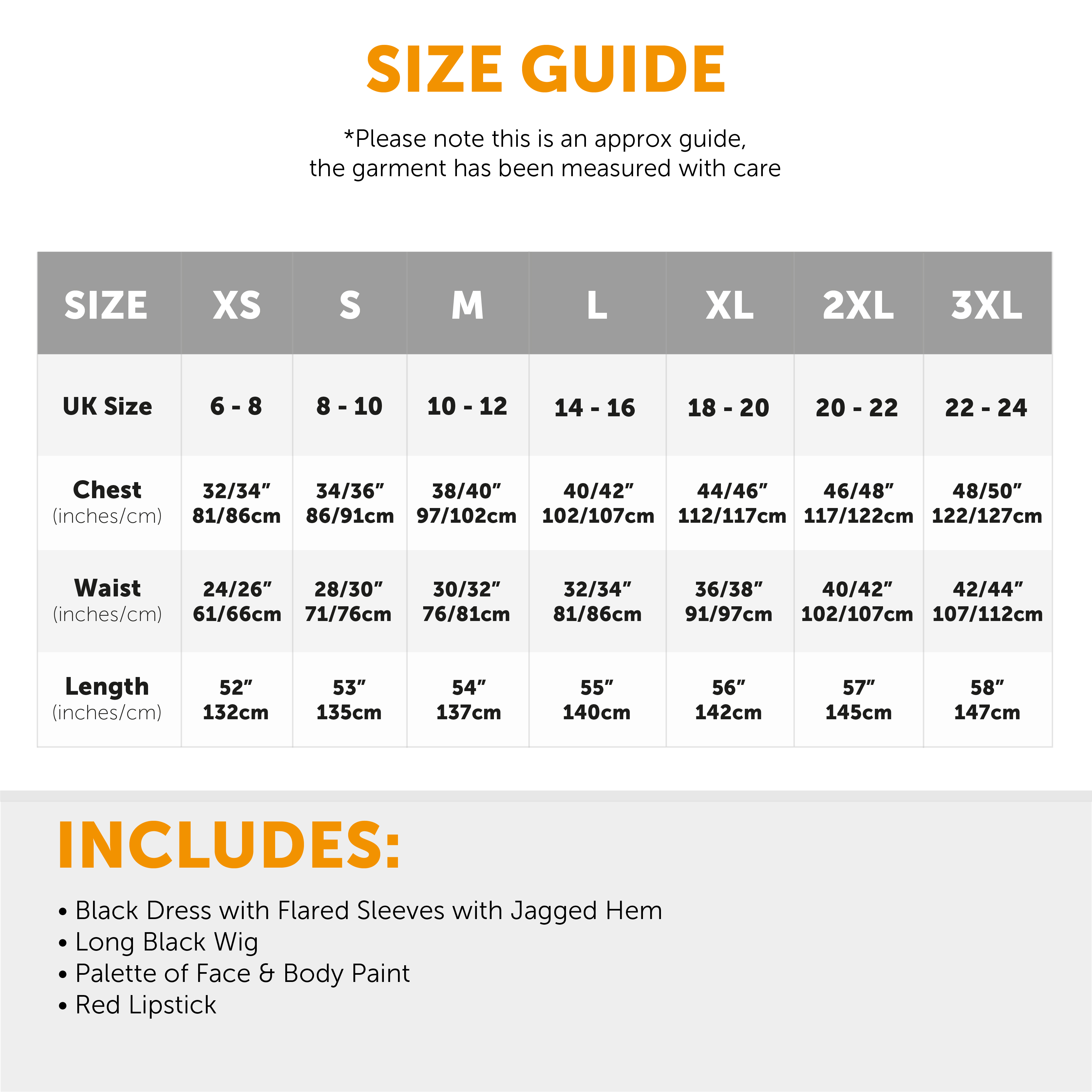AVAILABLE IN MULTIPLE SIZES: This Ladies Gothic Horror Costume Set is available in multiple sizes from X-Small to XXX-Large: X-Small (UK 6 - 8) Chest 32/34" (81/86cm), Waist 24/26" (61/66cm), Length 52" (132cm) | Small (UK 8 - 10) Chest 34/36" (86/91cm), Waist 28/30" (71/76cm), Length 53" (135cm) | Medium (UK 10 - 12) Chest 38/40" (97/102cm), Waist 30/32" (76/81cm), Length 54" (137cm) | Large (UK 14 - 16) Chest 40/42" (102/107cm), Waist 32/34" (81/86cm), Length 55" (140cm) | X-Large (UK 18 - 20) Chest 44/46" (112/117cm), Waist 36/38" (91/97cm), Length 56" (142cm) | XX-Large (UK 20 - 22) Chest 46/48" (117/122cm), Waist 40/42" (102/107cm), Length 57" (145cm) | XXX-Large (UK 22 - 24) Chest 48/50" (122/127cm), Waist 42/44" (107/112cm), Length 58" (147cm)