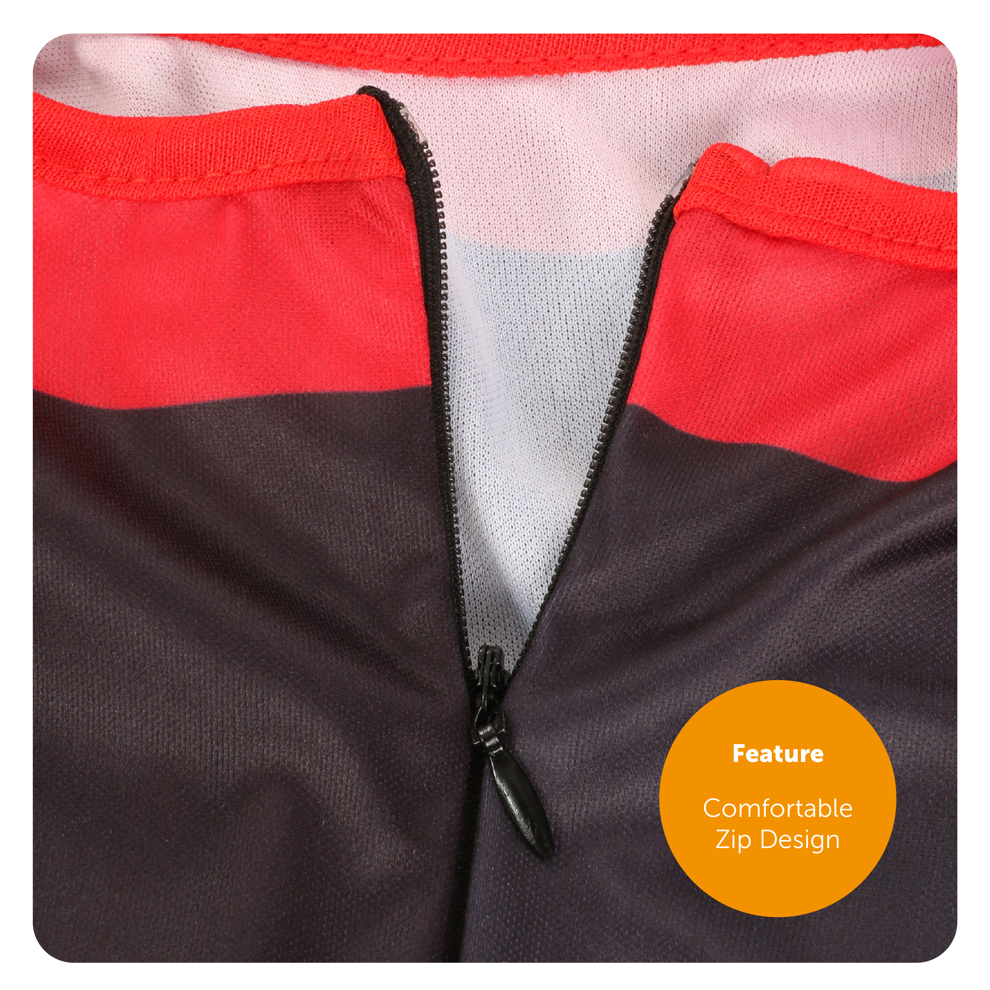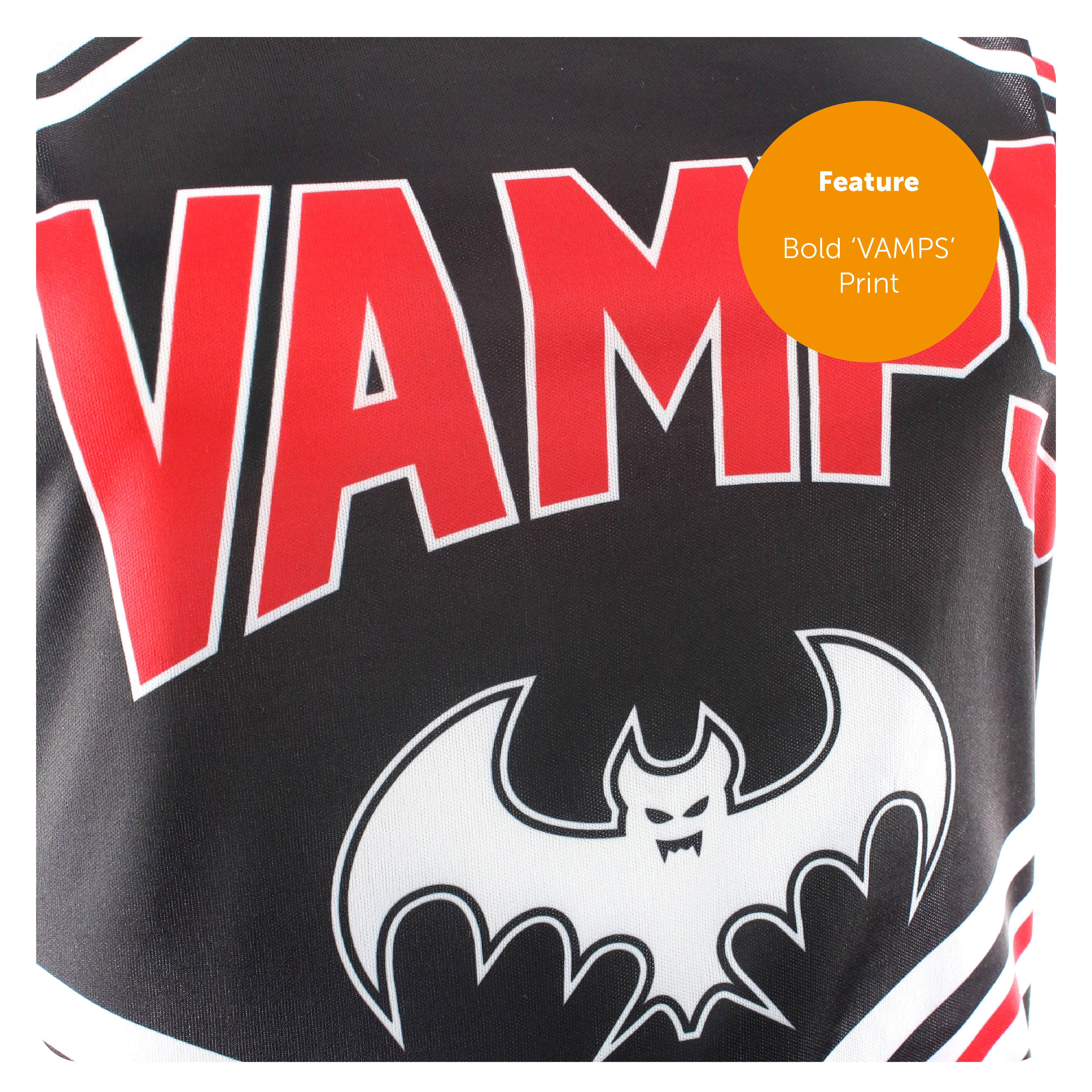 VAMPIRE CHEERLEADER DETAILS: Your Vampire Cheerleader Costume includes a Black and Red Dress with Pleated Skirt Decorated with Bats and Coffins and “VAMPS” Print on Top!