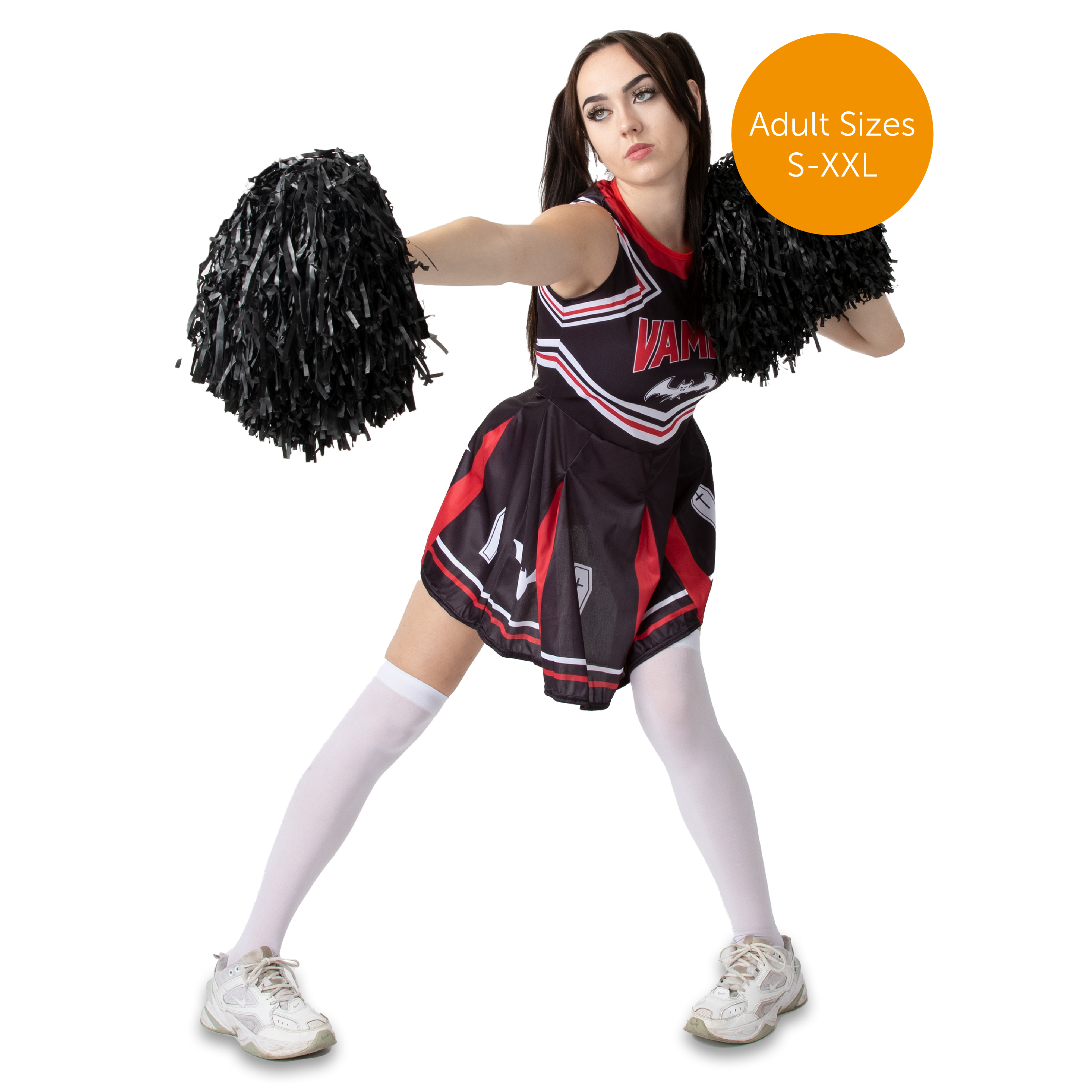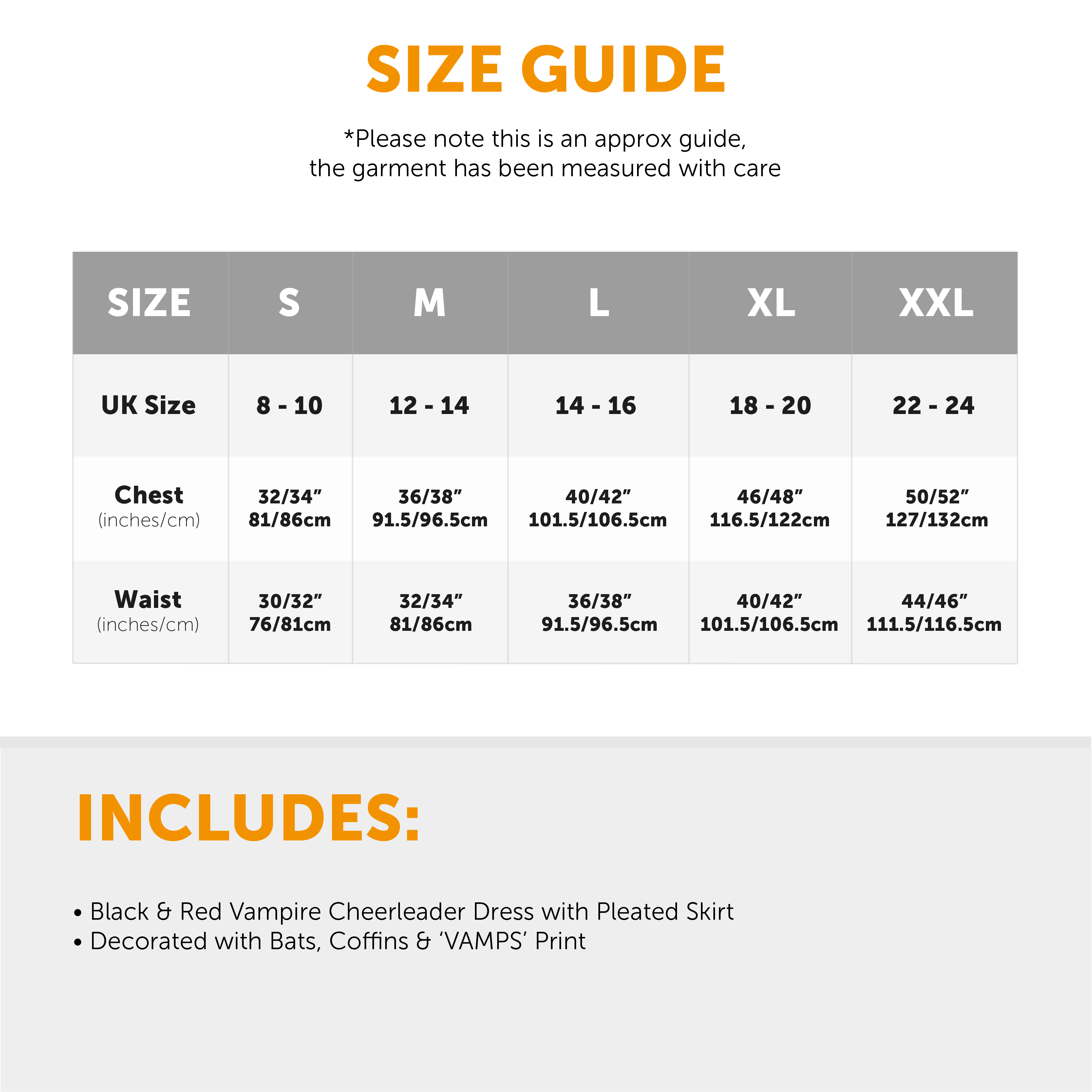 AVAILABLE IN MULTIPLE SIZES: Your Ladies Vampire Cheerleader Costume is available in multiple sizes from Small to XX-Large: Small (UK 8-10), Chest: 32/34" (81/86cm), Waist: 30/32" (76/81cm) | Medium (UK 12-14), Chest: 36/38" (91.5/96.5cm), Waist: 32/34" (81/86cm) | Large (UK 14-16), Chest: 40/42" (101.5/106.5cm), Waist: 36/38" (91.5/96.5cm) | X-Large (UK 18-20), Chest: 46/48" (116.5/122cm), Waist: 40/42" (101.5/106.5cm) | XX-Large (UK 22-24), Chest: 50/52" (127/132cm), Waist: 44/46" (111.5/116.5cm)