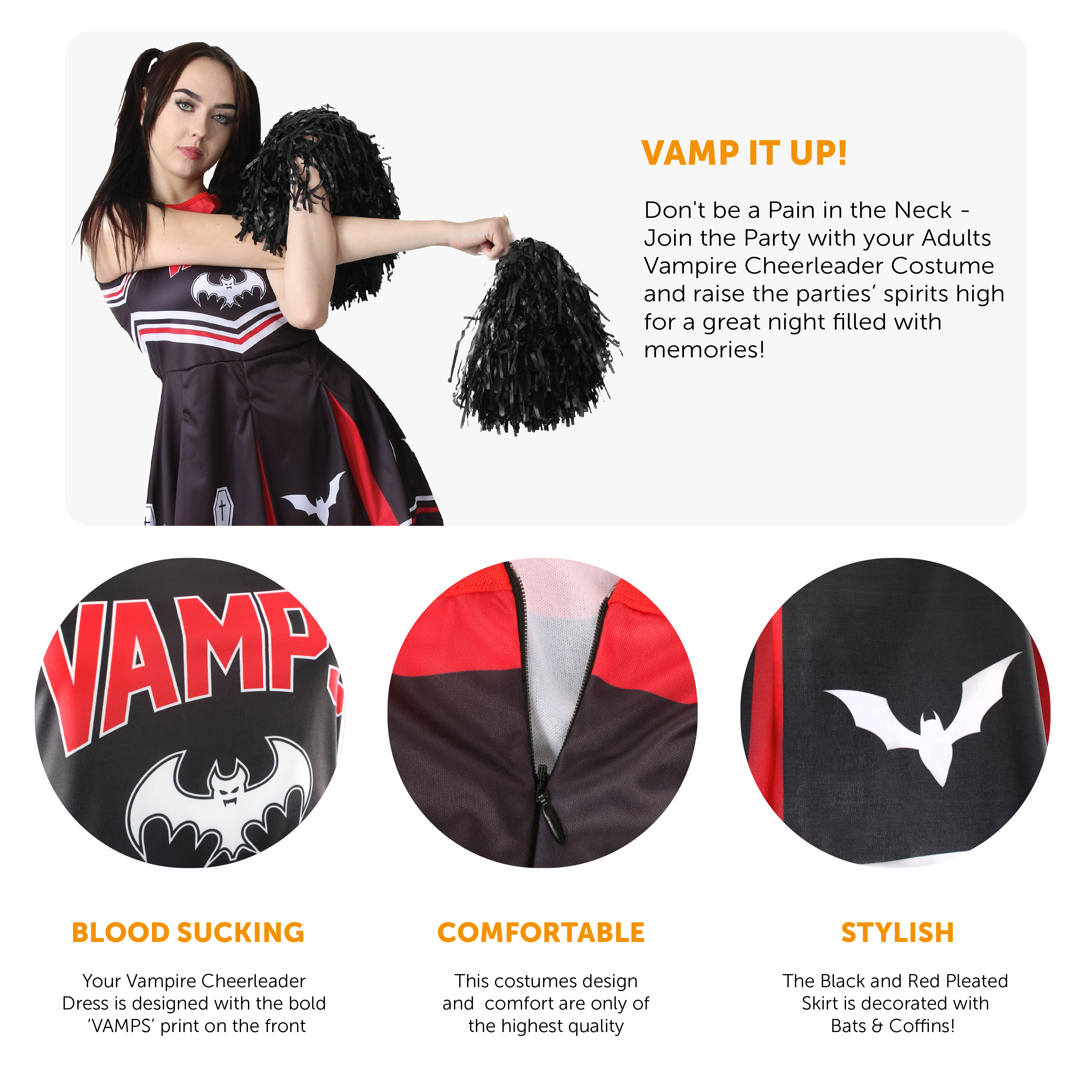 LADIES VAMPIRE CHEERLEADER COSTUME: Don't be a Pain in the Neck this Halloween, join the Party with your Vampire Cheerleader Costume and raise the parties’ spirits high for a great night filled with memories!
