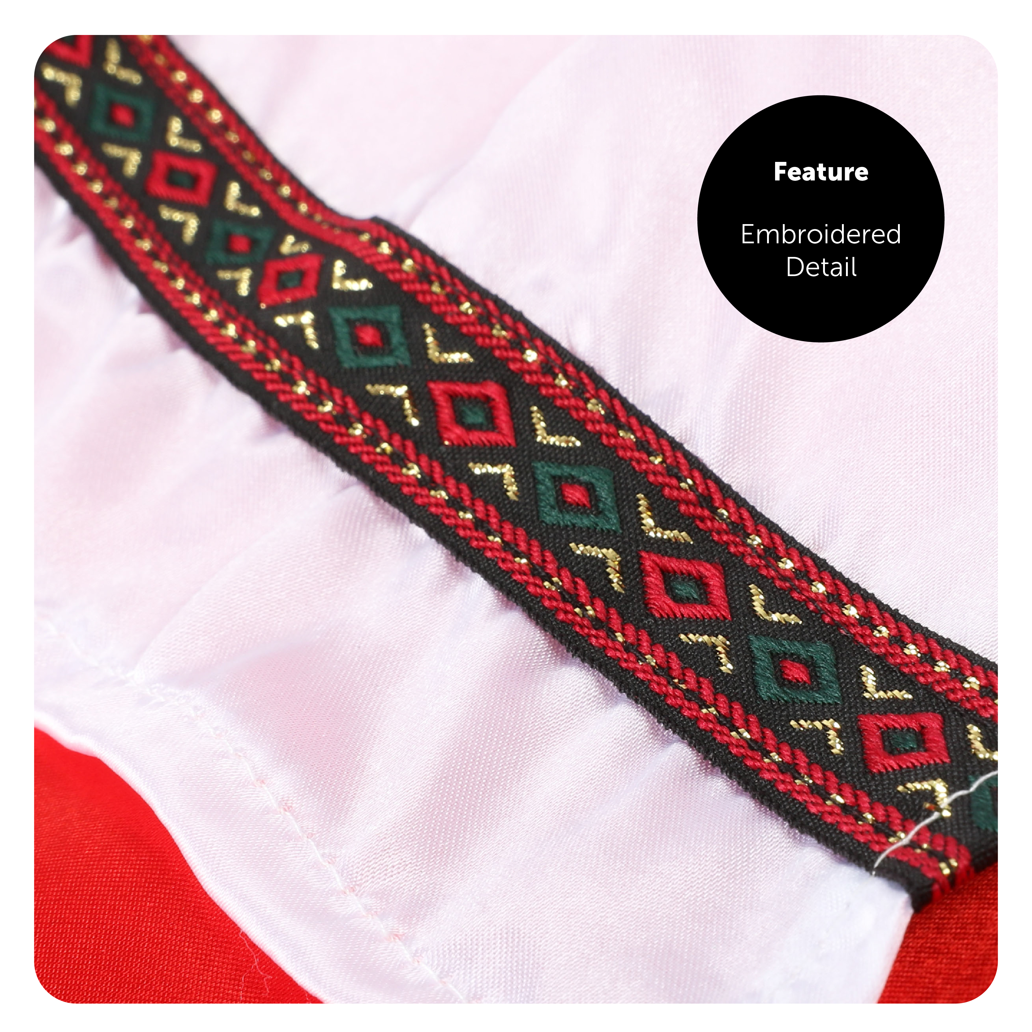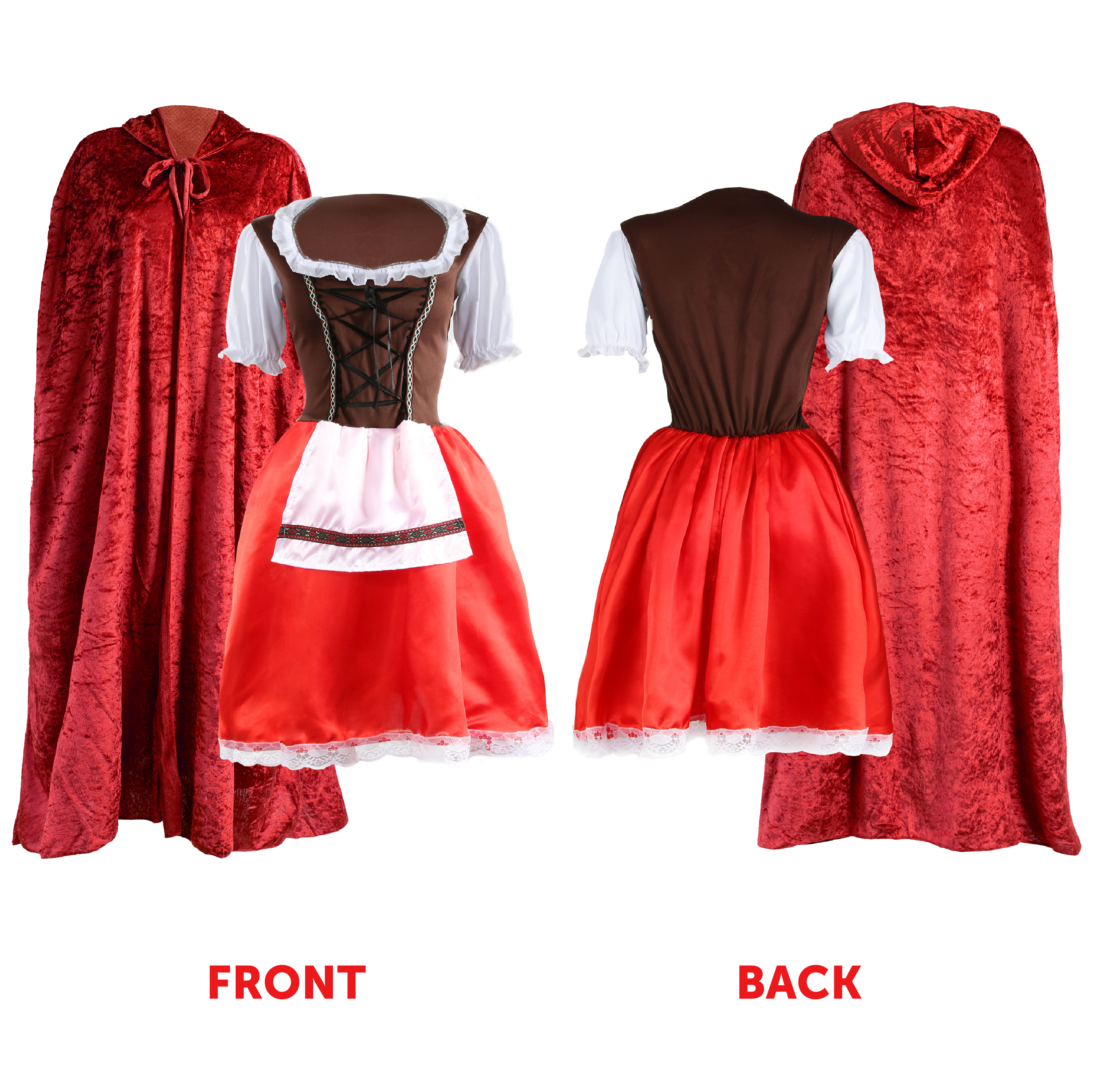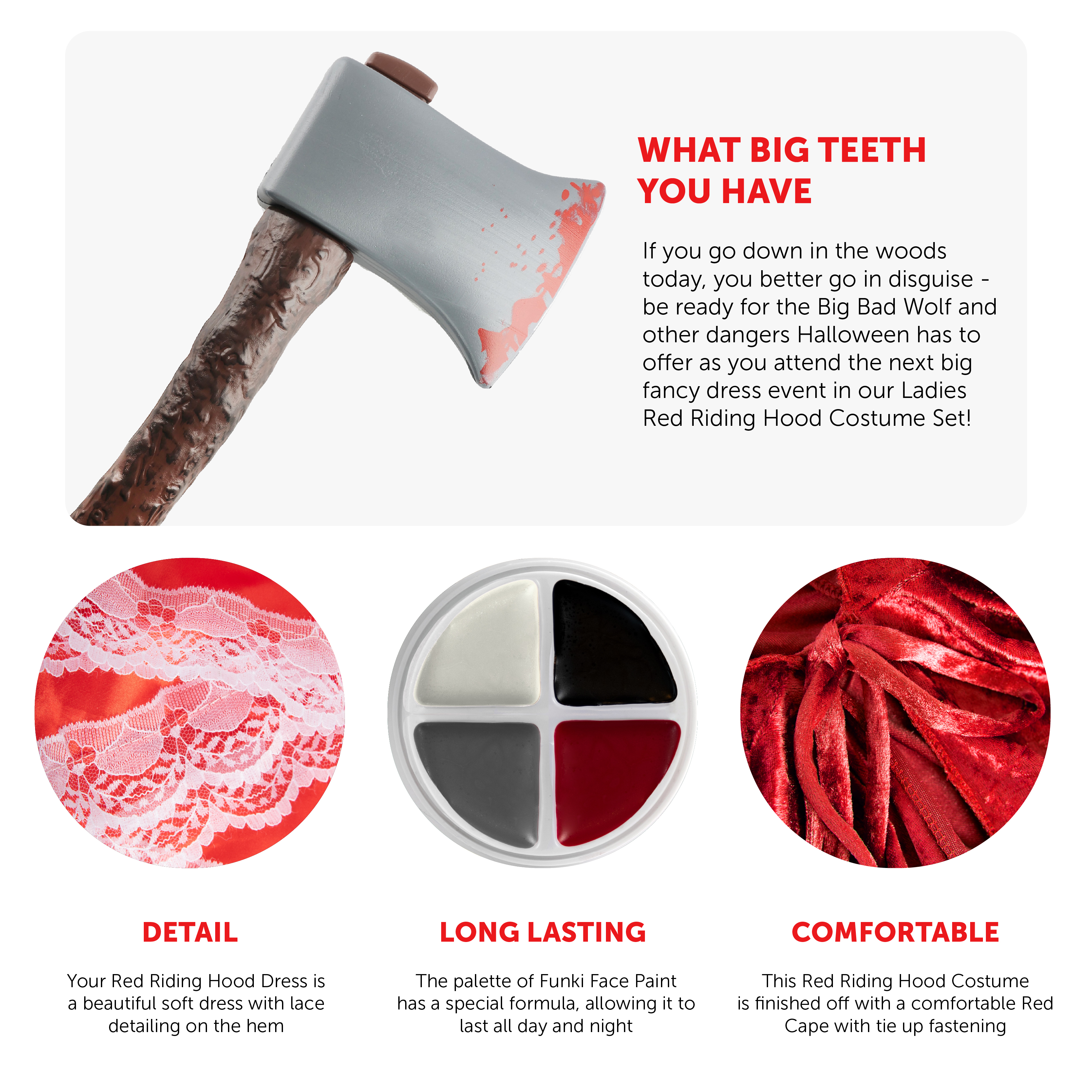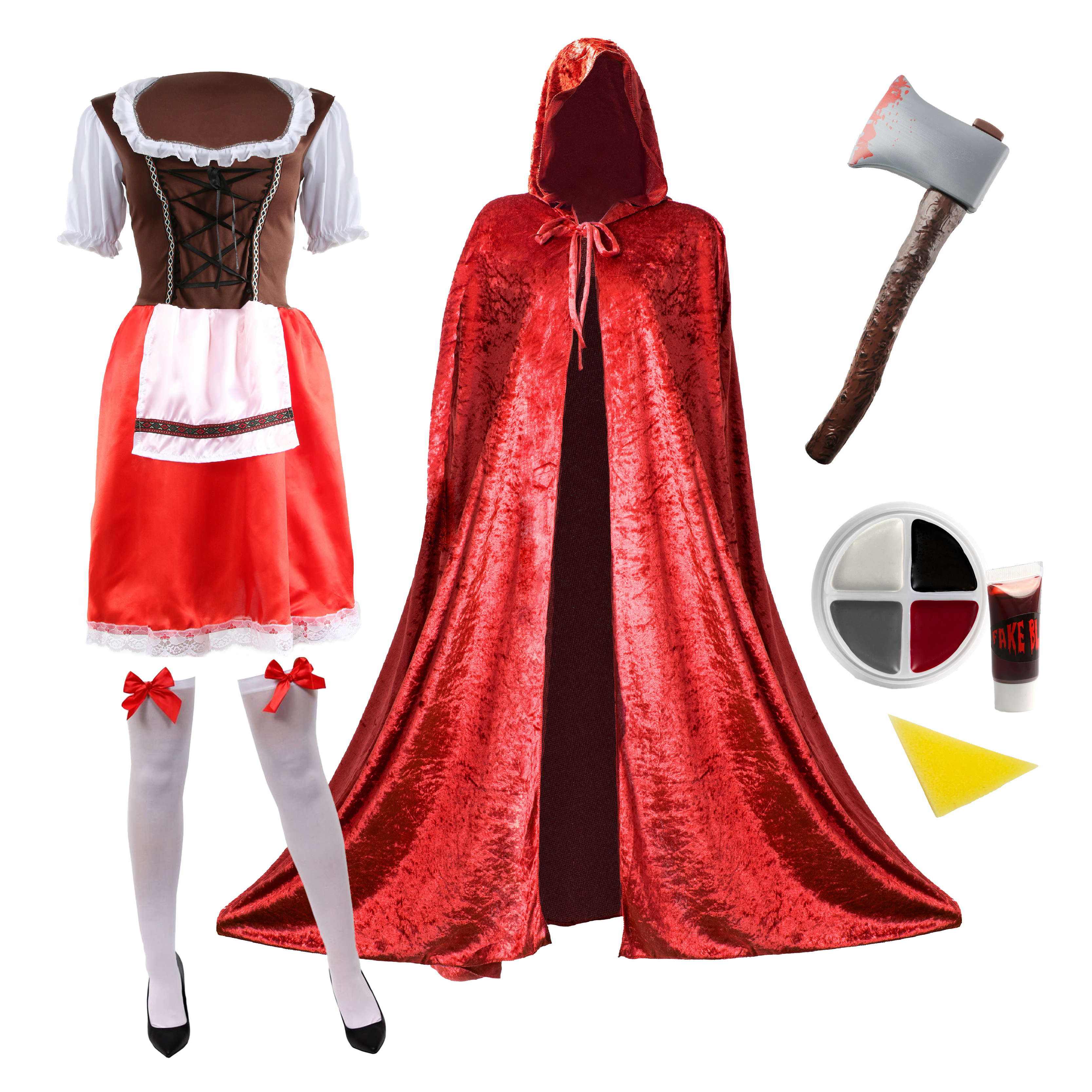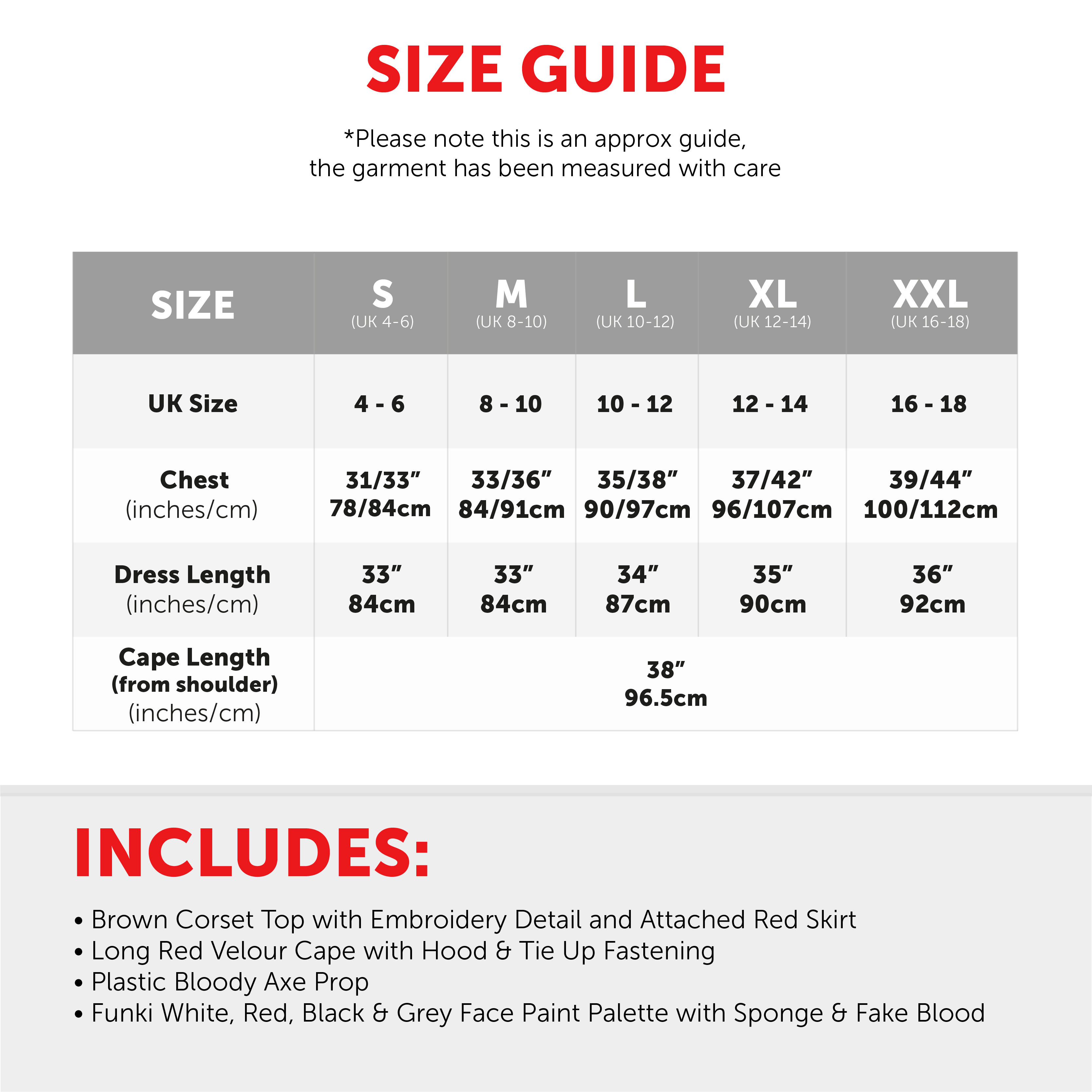 COSTUME INCLUDES: Your Ladies Red Riding Hood Costume Set includes a beautiful Red Skirt Dress with Lace and Embroidered details attached to a Brown Laced Corset Top, a Long Red Hooded Velour Cape with Drawstring fastening, White Stockings with Red Bows, a Plastic Bloody Axe Prop and a Palette of White, Red, Black and Grey Face Paint that comes equipped with a sponge and Fake Blood!