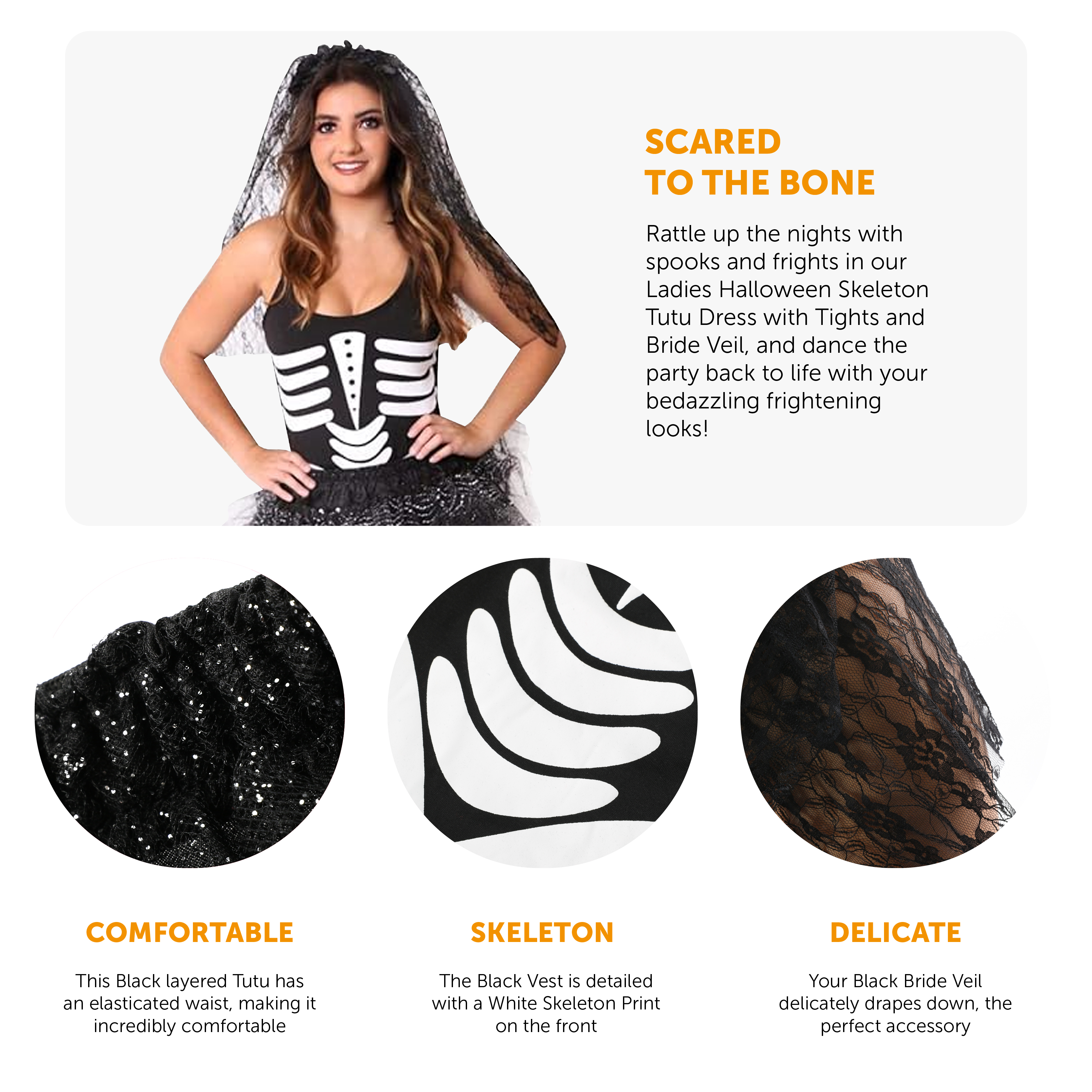 PERFECT FOR HALLOWEEN & OTHER FANCY DRESS: Whether you want to spook the crowd for Halloween, in need of a look for Day of the Dead events, or any other fancy dress, be sure to pick up our Ladies Halloween Skeleton Tutu Dress with Tights and Bride Veil!