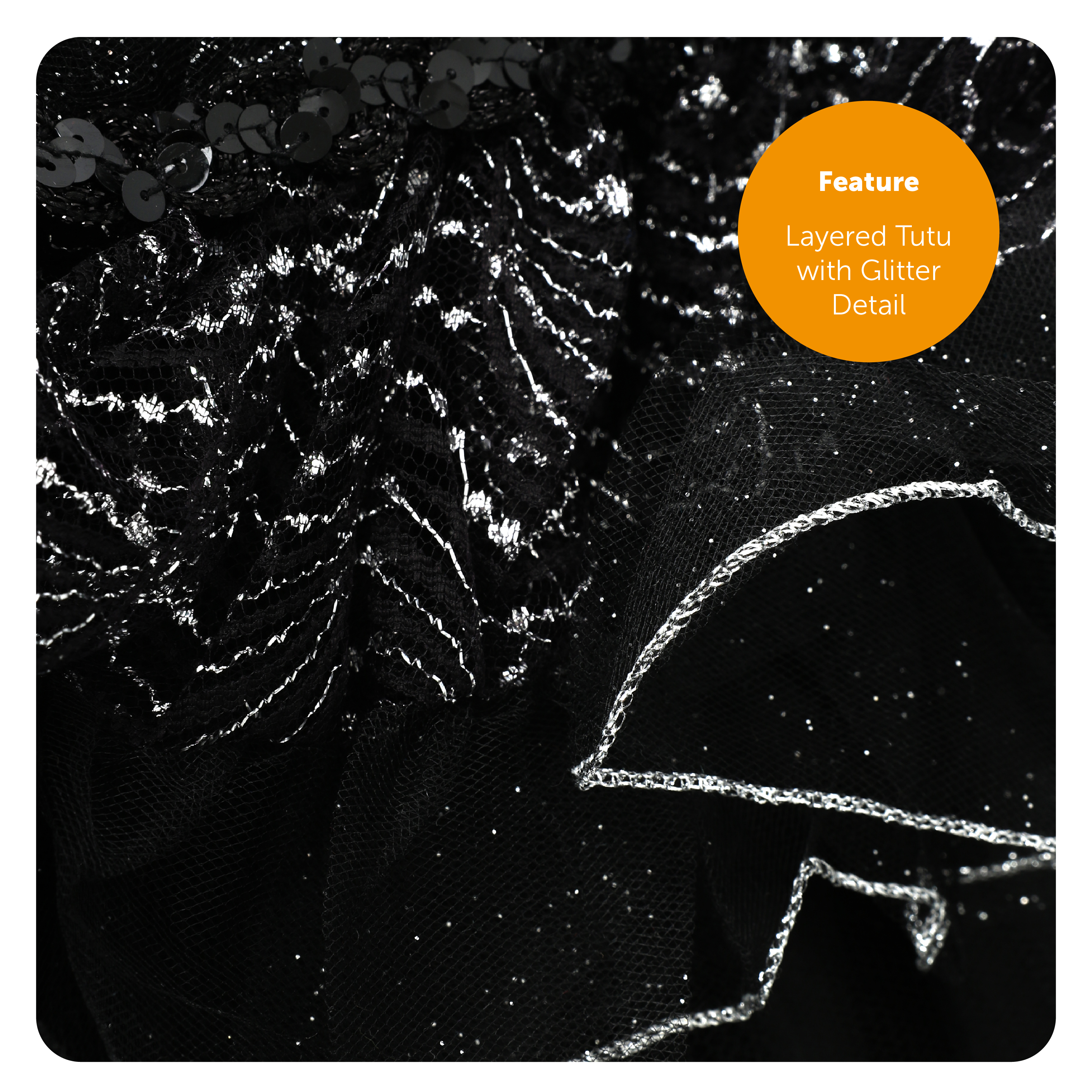 COSTUME DETAILS: Your Ladies Skeleton Costume includes a Black Vest with White Skeleton print on the front, a layered Black Tutu with Glitter detail, Black Tights with Skeleton Print on the front, and a delicate Black Lace Veil with a Black Rose Headband, a great look for any Halloween event!