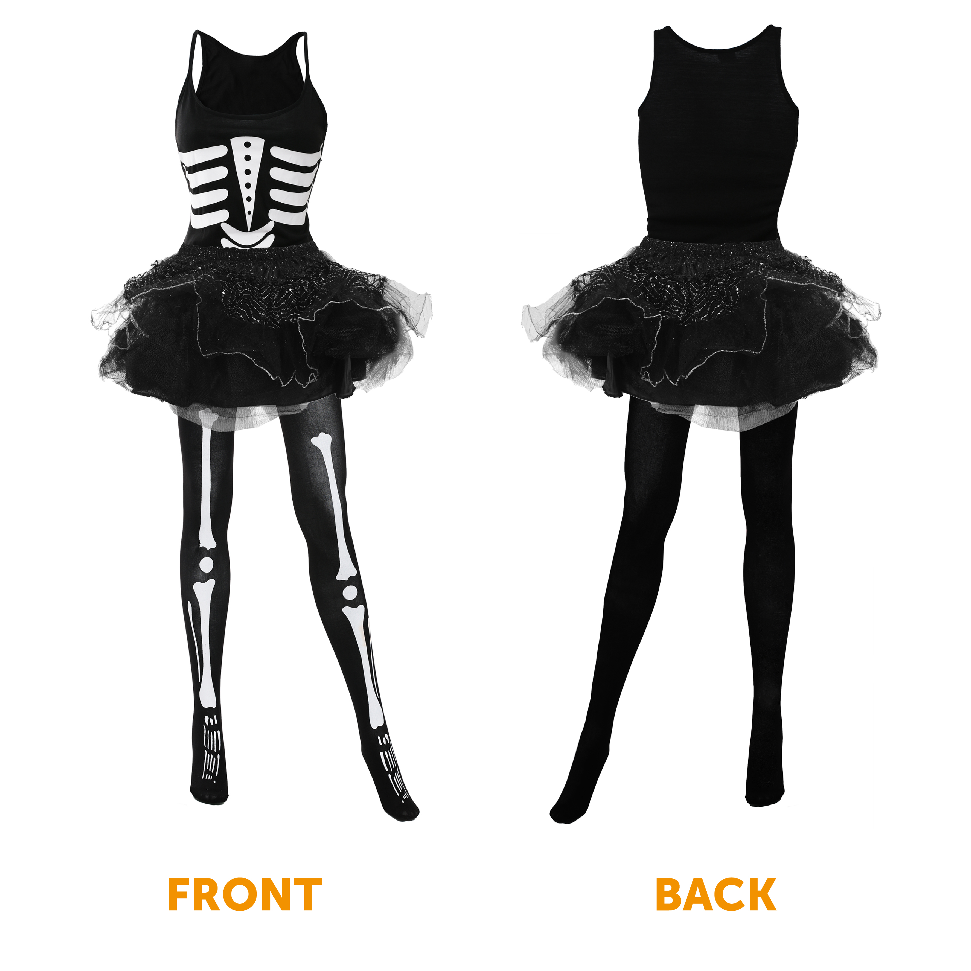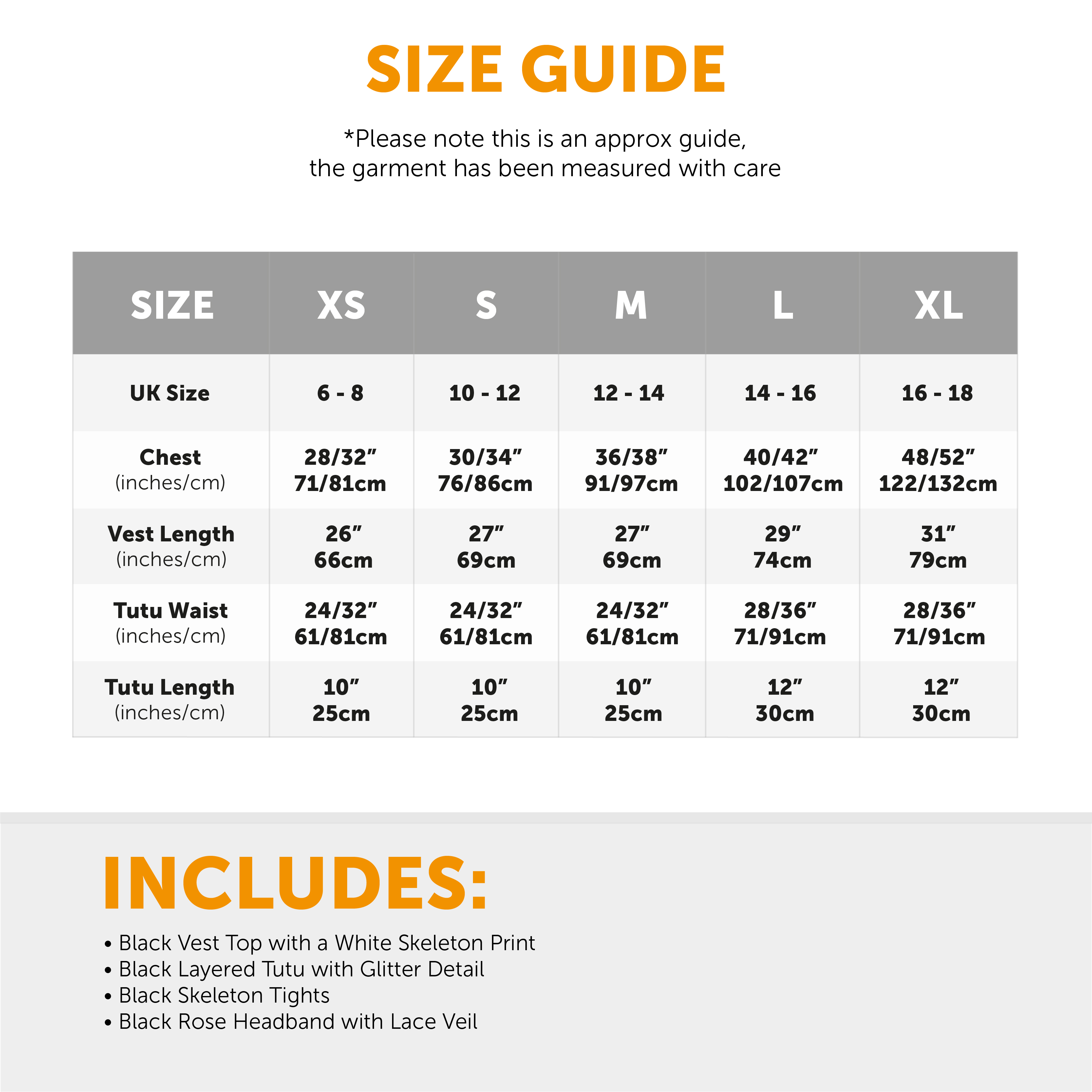 AVAILABLE IN MULTIPLE SIZES: The Ladies Skeleton Tutu Dress Costume is available in sizes ranging from X-Small to X-Large: X-Small - UK 6 - 8 - Chest 28/32" (71/81cm), Vest Length: 26" (66cm), Tutu Waist: 24/32" (61/81cm), Tutu Length: 10" (25cm) | Small - UK 10 - 12 - Chest: 30/34" (76/86cm), Vest Length: 27" (69cm), Tutu Waist: 24/32" (61/81cm), Tutu Length: 10" (25cm) | Medium - UK 12 - 14 - Chest: 36/38" (91/97cm), Vest Length: 27" (69cm), Tutu Waist: 24/32" (61/81cm), Tutu Length: 10" (25cm) | Large - UK 14 - 16 - Chest: 40/42" (102/107cm), Vest Length: 29" (74cm), Tutu Waist: 28/36" (71/91cm), Tutu Length: 12" (30cm) | X-Large - UK 16 - 18 - Chest: 48/52" (122/132cm), Vest Length: 31" (79cm), Tutu Waist: 28/36" (71/91cm), Tutu Length: 12" (30cm)