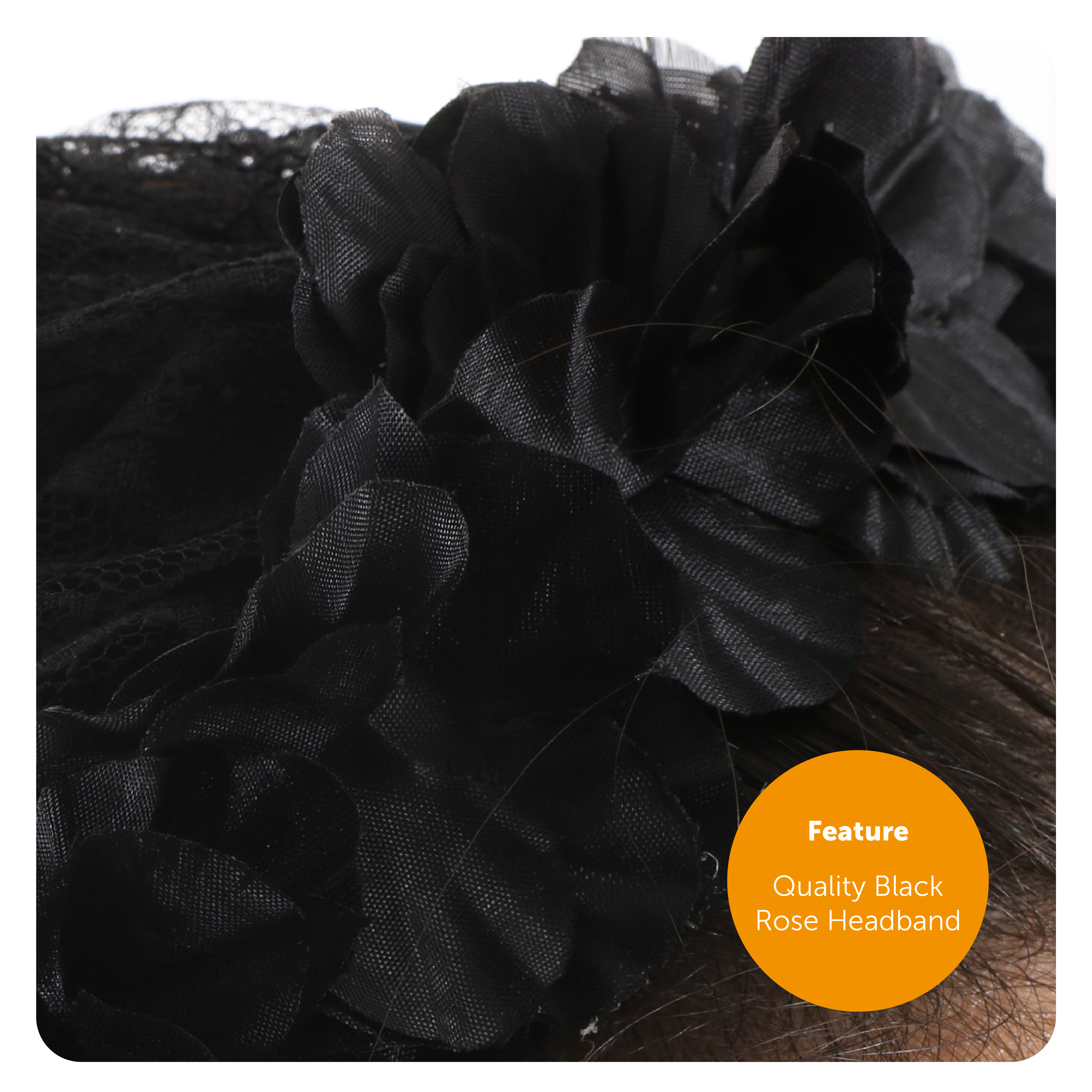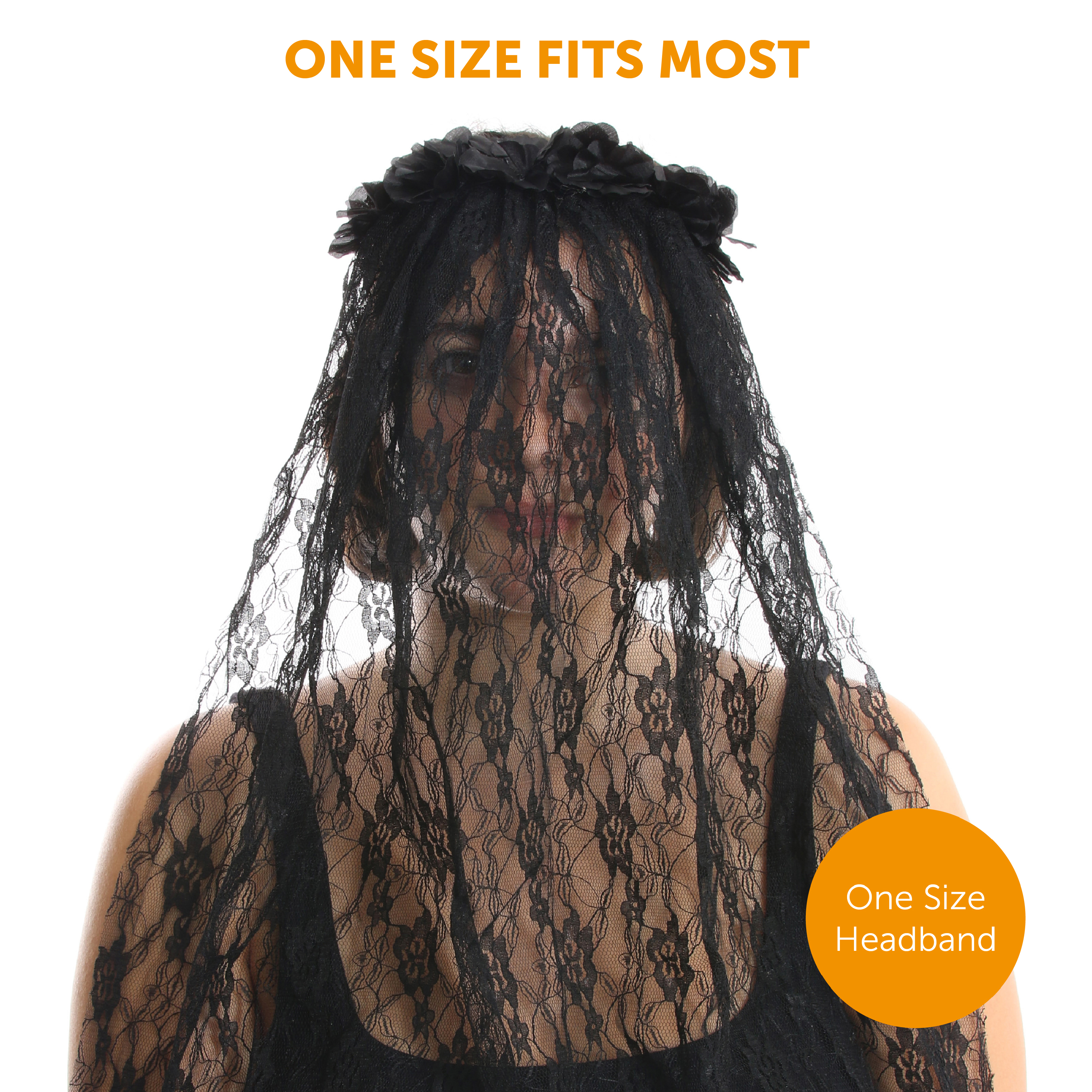 ONE SIZE FITS MOST: Attached to a comfortable one sized Headband, this Black Rose Floral Lace Veil can be worn over the face or swept back, measuring a length of 60cm (24"), it is the perfect accessory for your Costume!