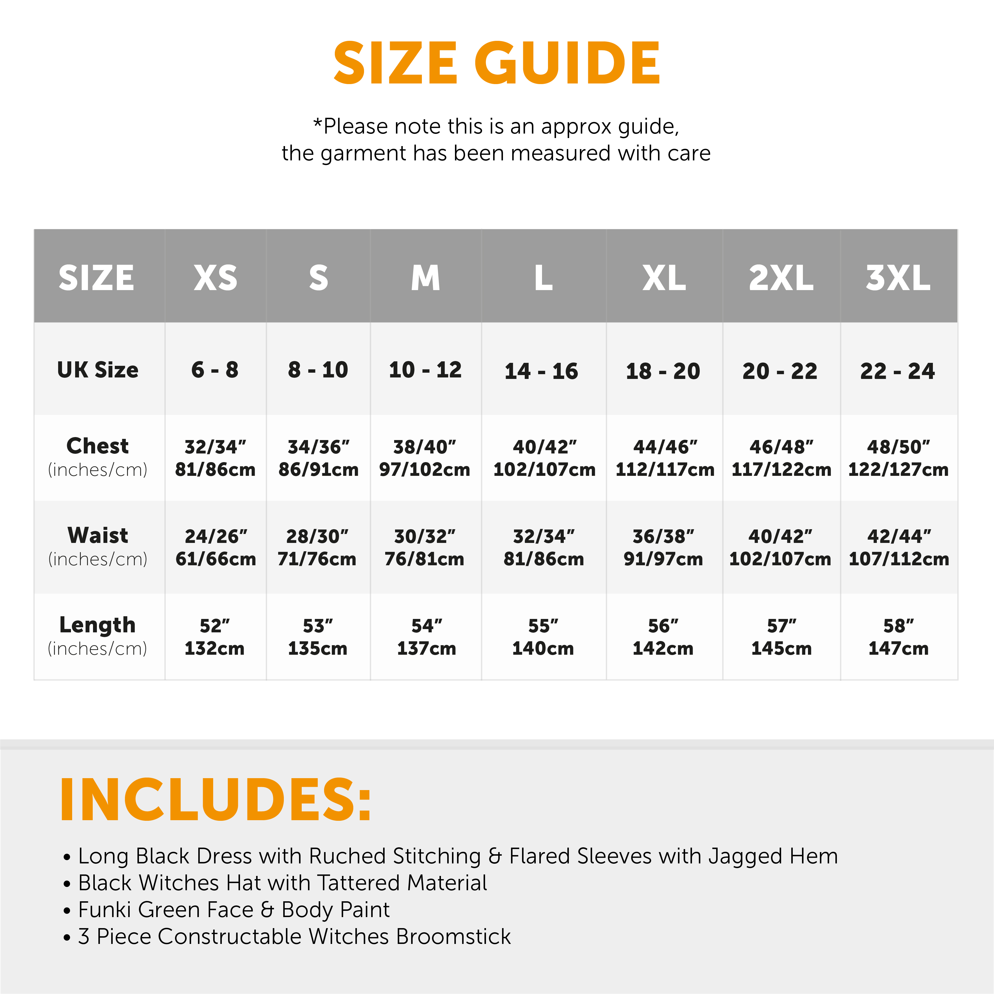 AVAILABLE IN MULTIPLE SIZES: This Ladies Witch Costume is available in various sizes, from x-Small to XXX-Large; X-Small (UK 6-8) - Chest: 32/34" (81/86cm), Waist: 24/26" (61/66cm), Length: 52" (132cm) | Small (UK 8-10) - Chest: 34/36" (86/91cm), Waist: 28/30" (71/76cm), Length: 53" (135cm) | Medium (UK 10-12) - Chest: 38/40" (97/102cm), Waist: 30/32" (76/81cm), Length: 54" (137cm) | Large (UK 14-16) - Chest: 40/42" (102/107cm), Waist: 32/34" (81/86cm), Length: 55" (140cm) | X-Large (UK 18-20) - Chest: 44/46" (112/117cm), Waist: 36/38" (91/97cm), Length: 56" (142cm) | XX-Large (UK 20-22) - Chest: 46/48" (117/122cm), Waist: 40/42" (102/107cm), Length: 57" (145cm) | XXX-Large (UK 22-24) - Chest: 48/50" (122/127cm), Waist: 42/44" (107/112cm), Length: 58" (147cm)