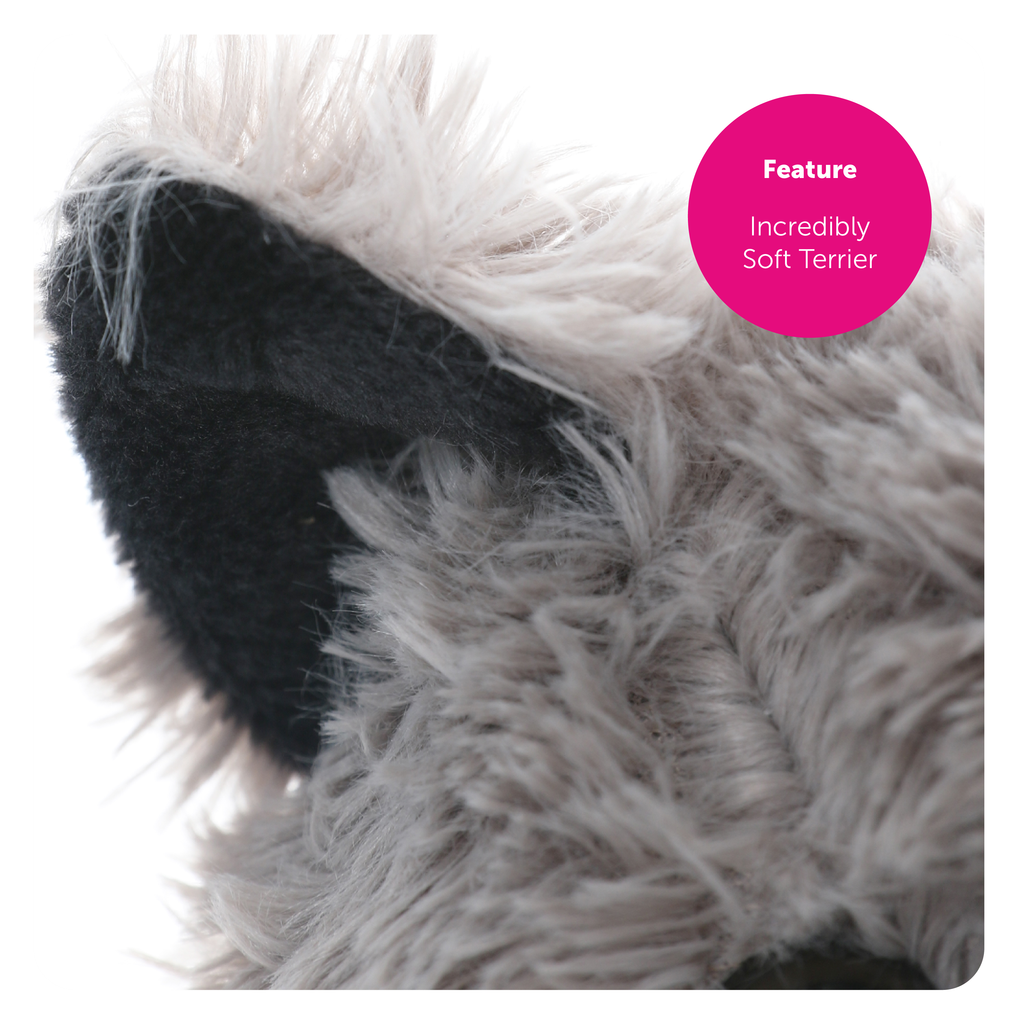 Your Small Grey Terrier Dog Plush is 6" (16cm) in height and is incredibly soft — you won’t be able to get enough of its cuddly fur as you carry it around in your arms or handbag!