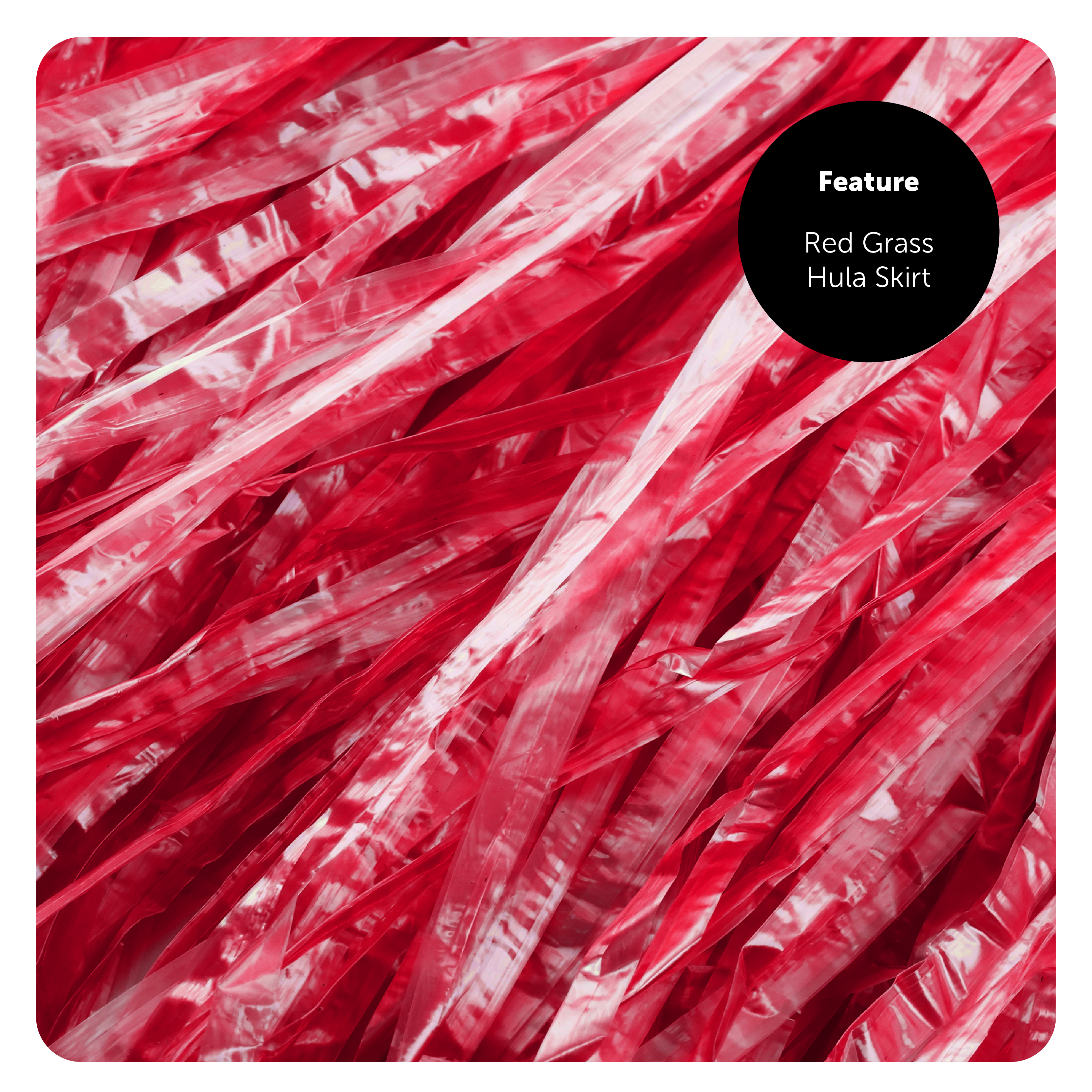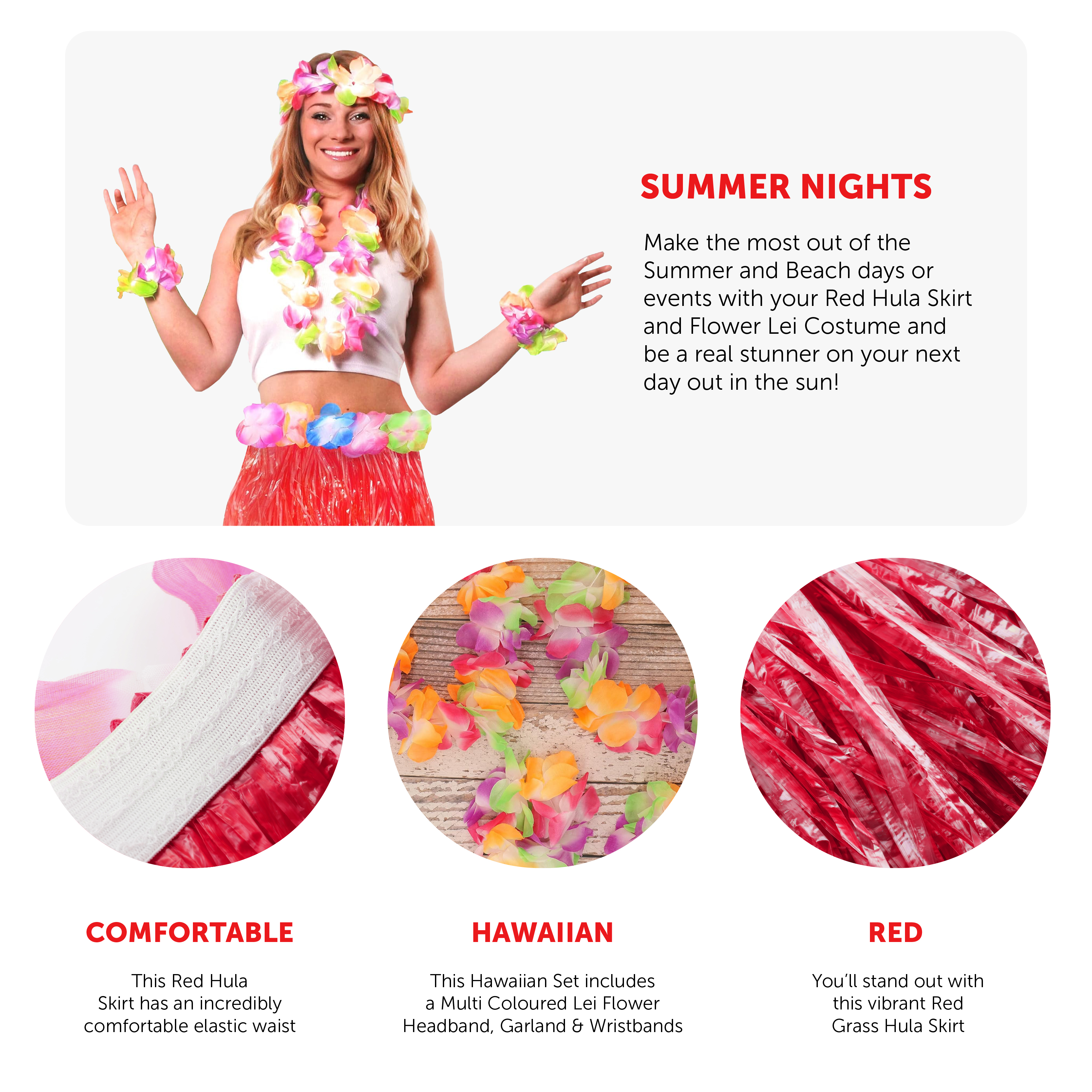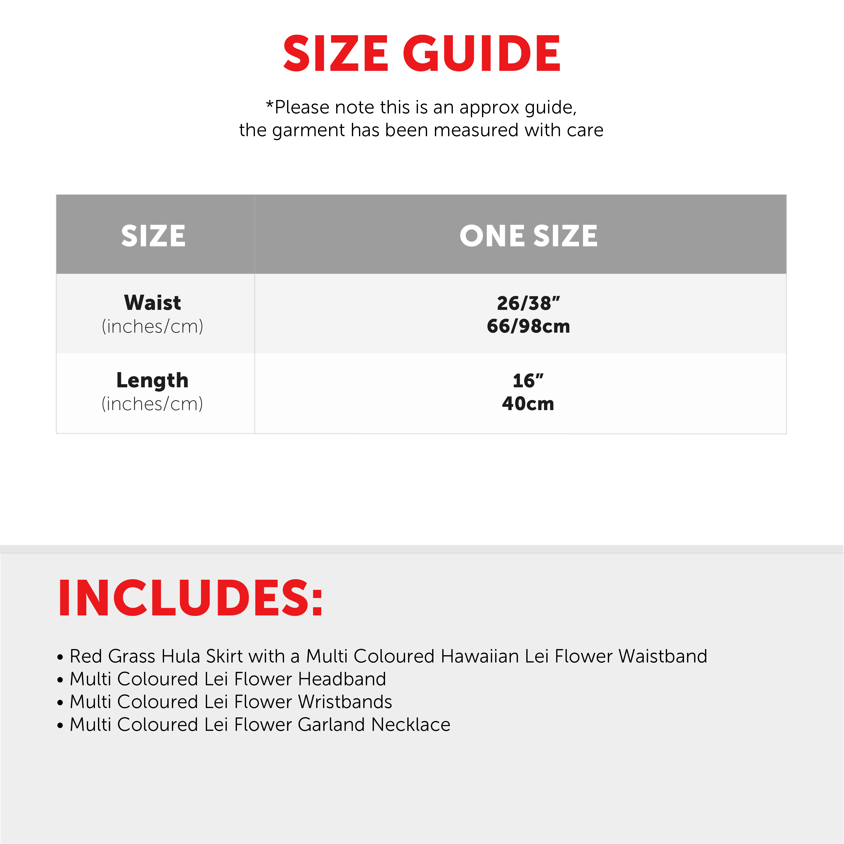 COSTUME DETAILS: Your Costume includes a short grass-like Red Hula Skirt with an elasticated waistband, with multi coloured decorative Hawaiian Lei Flowers around the waist, and a 4 Piece Multi coloured Hawaiian Lei Flower Necklace, Headband and Wristband Set, all tropical and ready for the beach!
