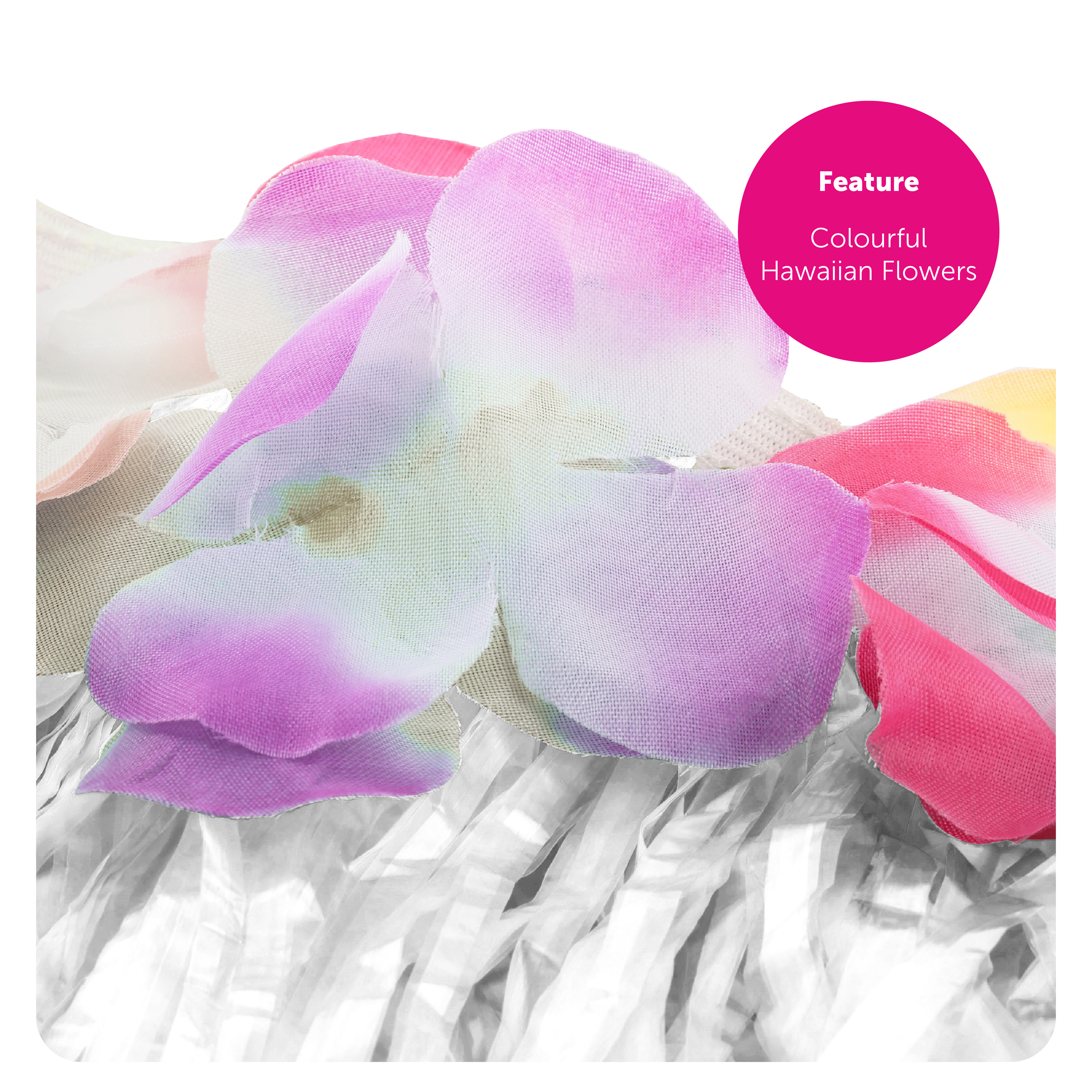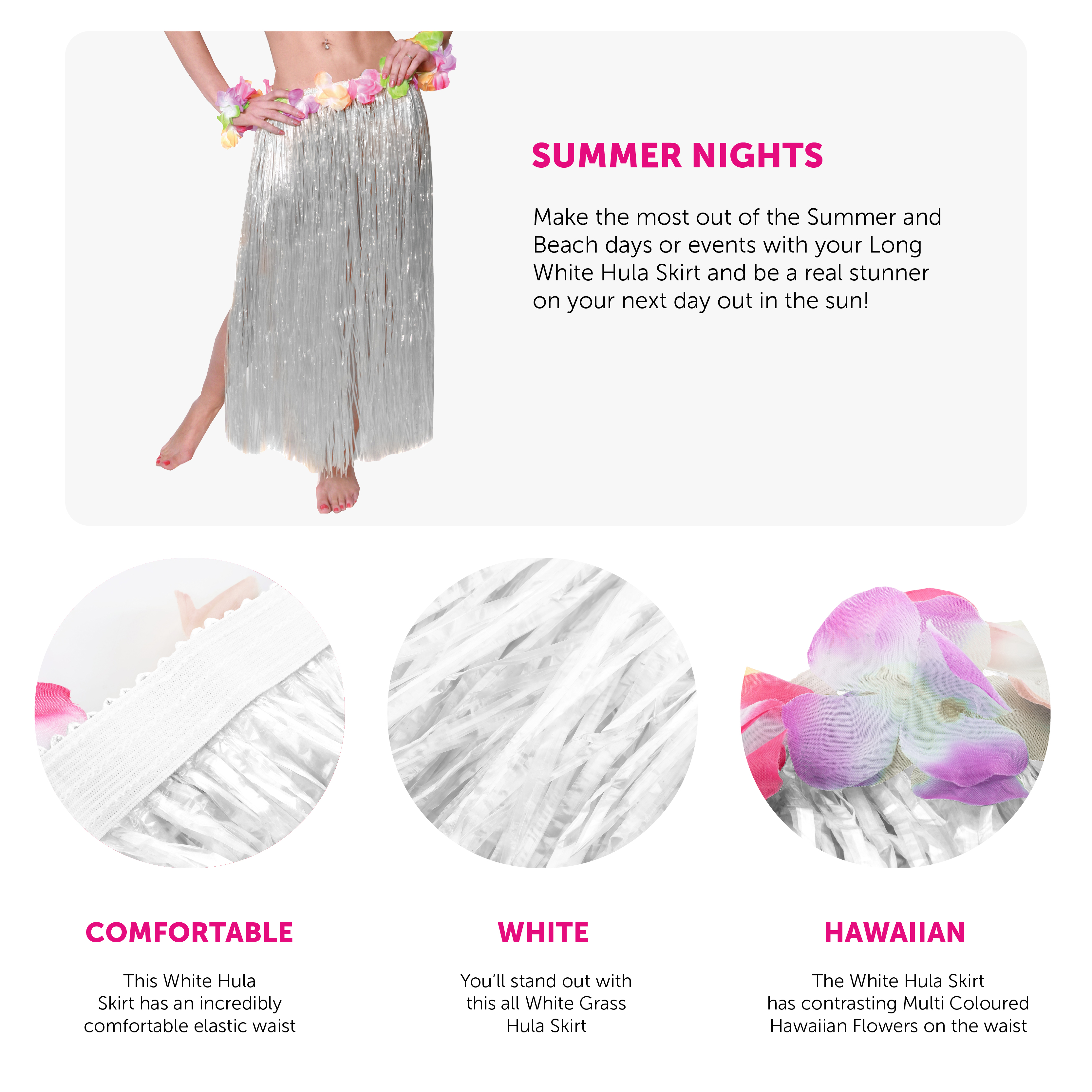HULA SKIRT DETAILS: Your Long Hula Skirt is a White, grass-like Skirt with an elasticated waistband and multi coloured decorative Hawaiian Lei Flowers, all tropical and ready for the beach!