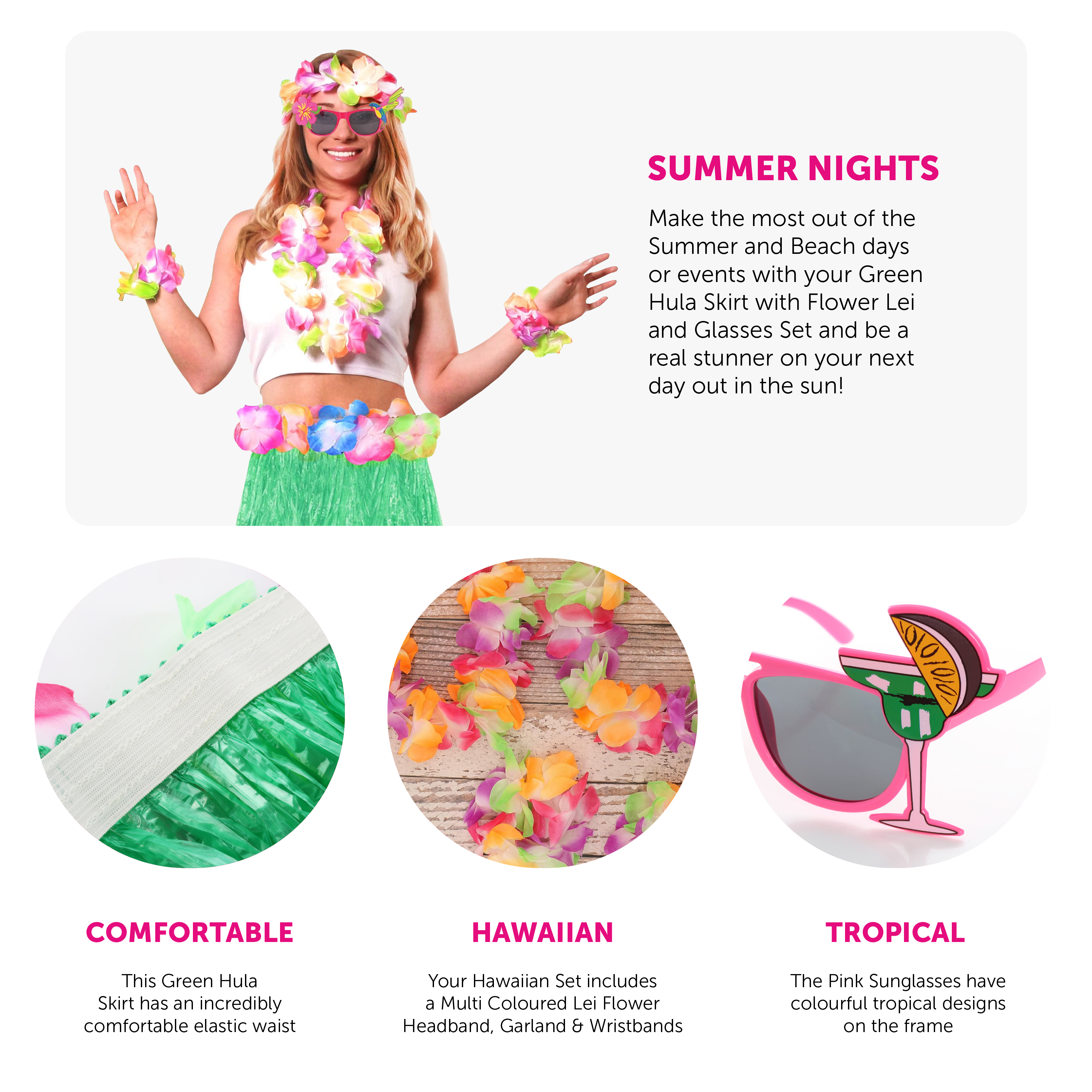 SET DETAILS: Your set includes a short grass-like Green Hula Skirt with an elasticated waistband, with multi coloured decorative Hawaiian Lei Flowers around the waist, a 4 Piece Multi coloured Hawaiian Lei Flower Necklace, Headband and Wristband Set, and Pink Tropical Sunglasses with Hawaiian designs, all ready for the beach!