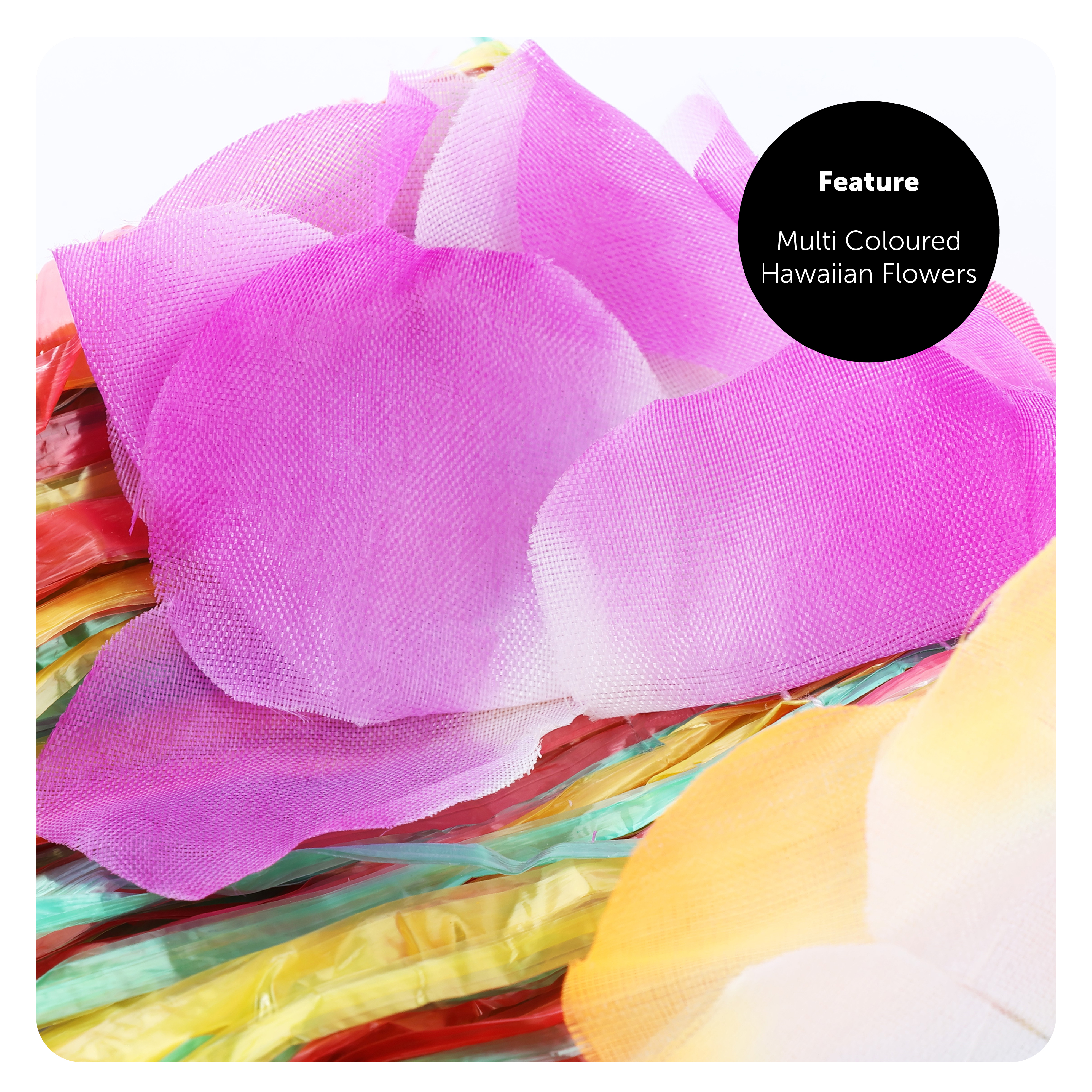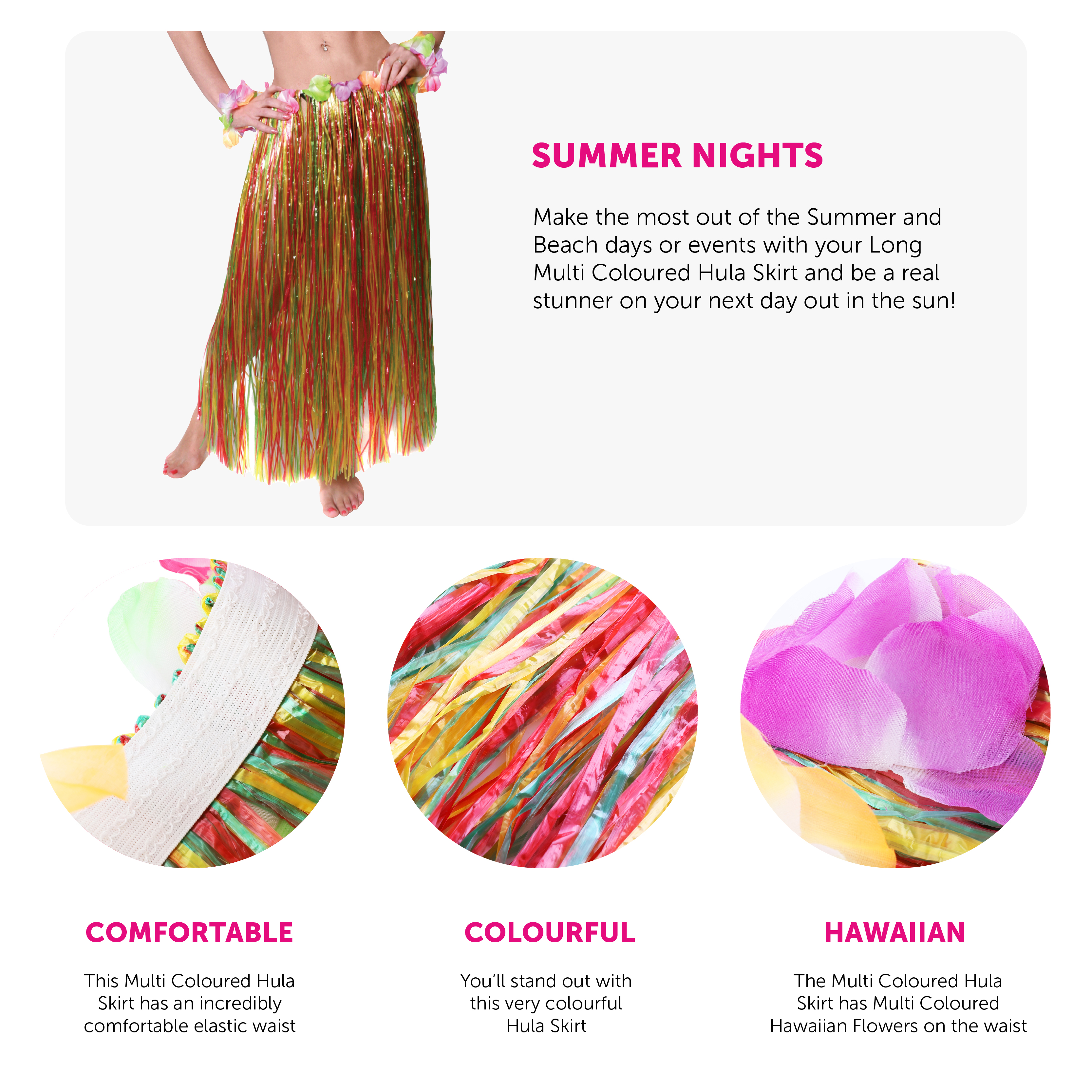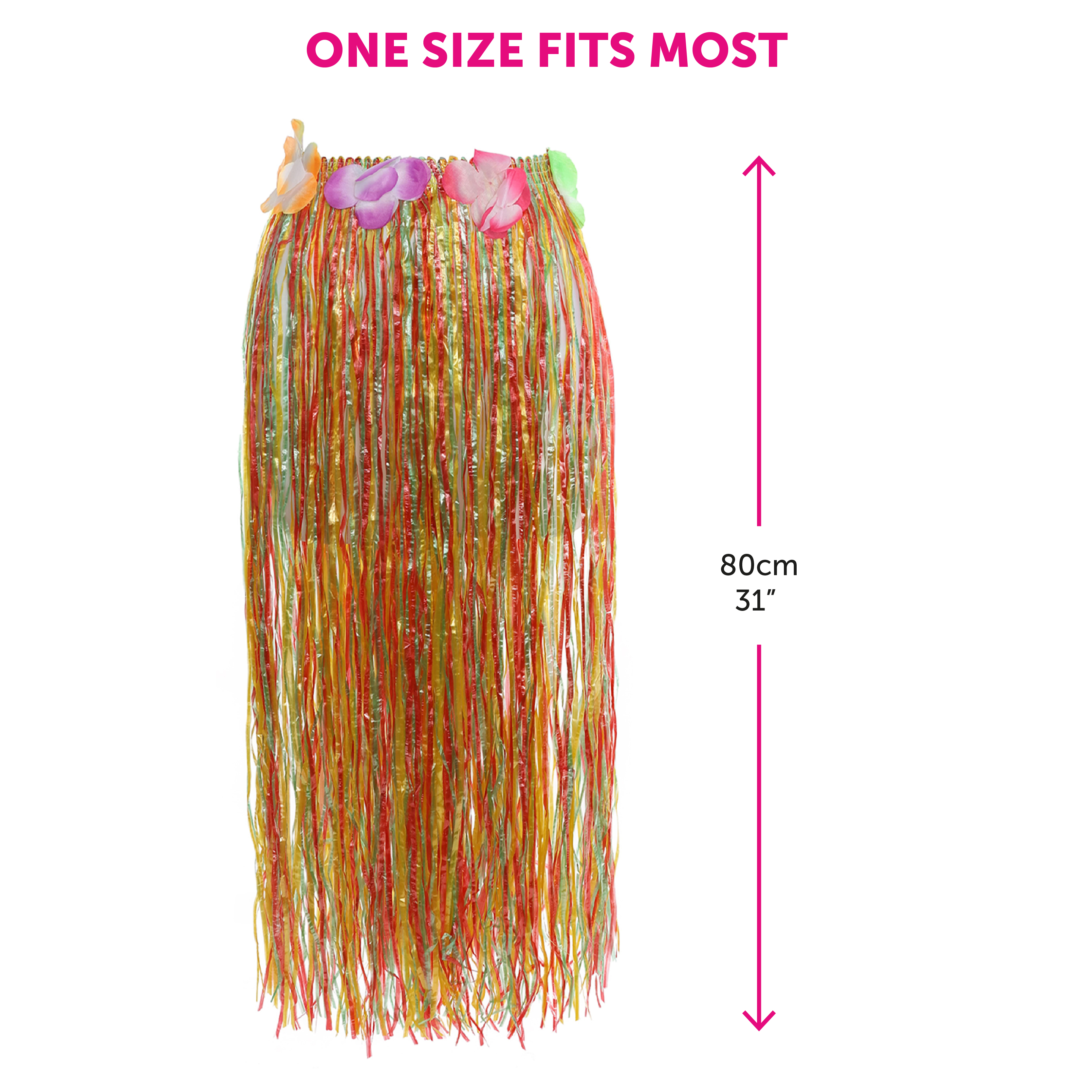 MULTI COLOURED 80CM HULA SKIRT: Make the most out of the Summer and Beach days or events with your Long Multi Coloured Hula Skirt and be a real stunner on your next day out in the sun! HULA SKIRT DETAILS: Your Long Hula Skirt is a Multi Coloured, grass-like Skirt with an elasticated waistband and multi coloured decorative Hawaiian Lei Flowers, all tropical and ready for the beach! AVAILABLE IN MULTIPLE PACKS: Your Multi Coloured Hula Skirt is available in multiple packs, from Single, Packs of 2, Packs of 3, Packs of 6, and Packs of 12, all for you to share and use whenever you’d like! ONE SIZE FITS MOST: The Multi Coloured Hula Skirt is available in one size, with the Waist measuring 26/36" (66/91cm) and a Length of 31" (80cm), it is comfortable for most to wear! PERFECT FOR SUMMER AND HAWAIIAN FANCY DRESS: Whether you cook up a storm for a BBQ in the Summer, or attend a Hawaiian party, your Long Multi Coloured Hula Skirt is sure to set the tone and raise everyone’s spirits high!