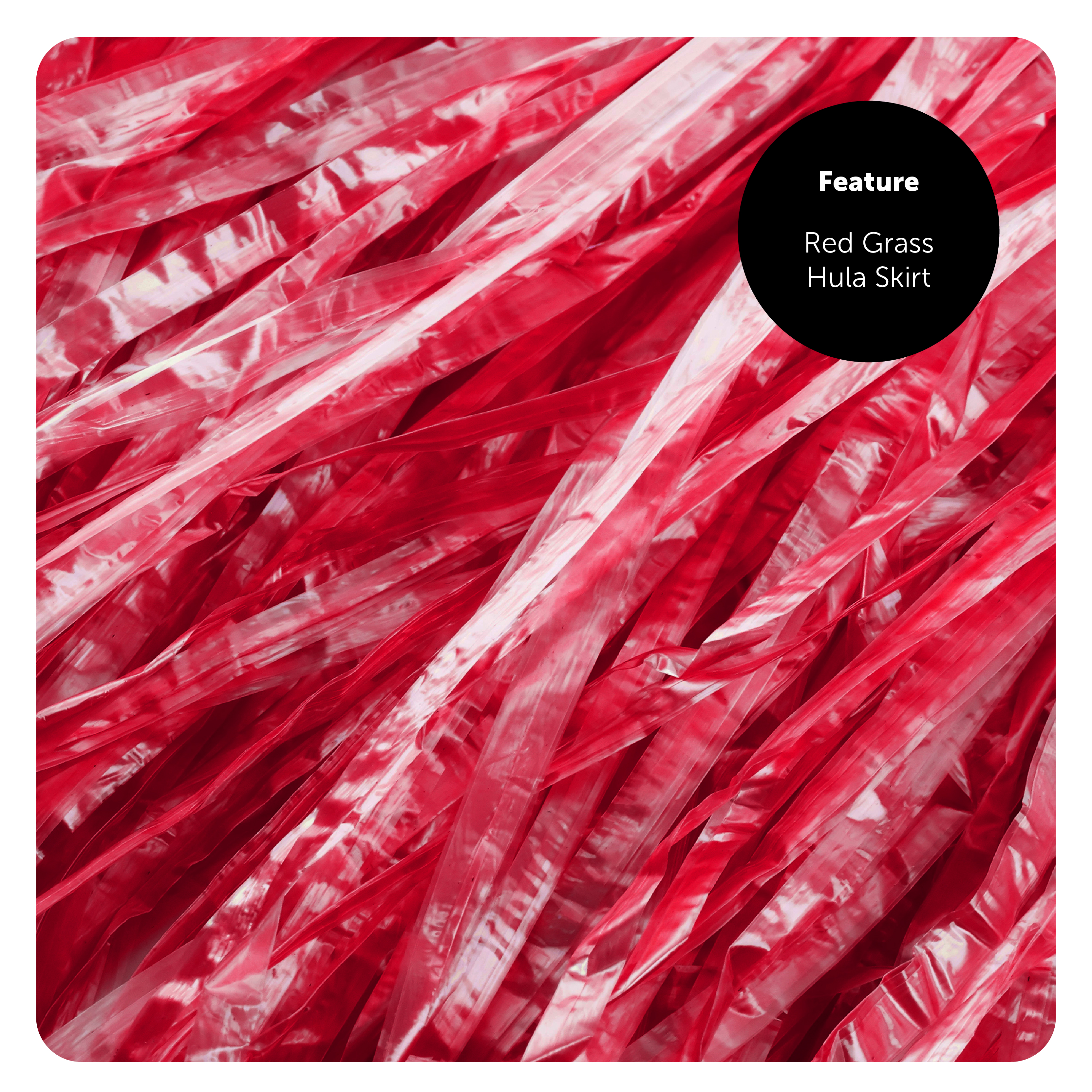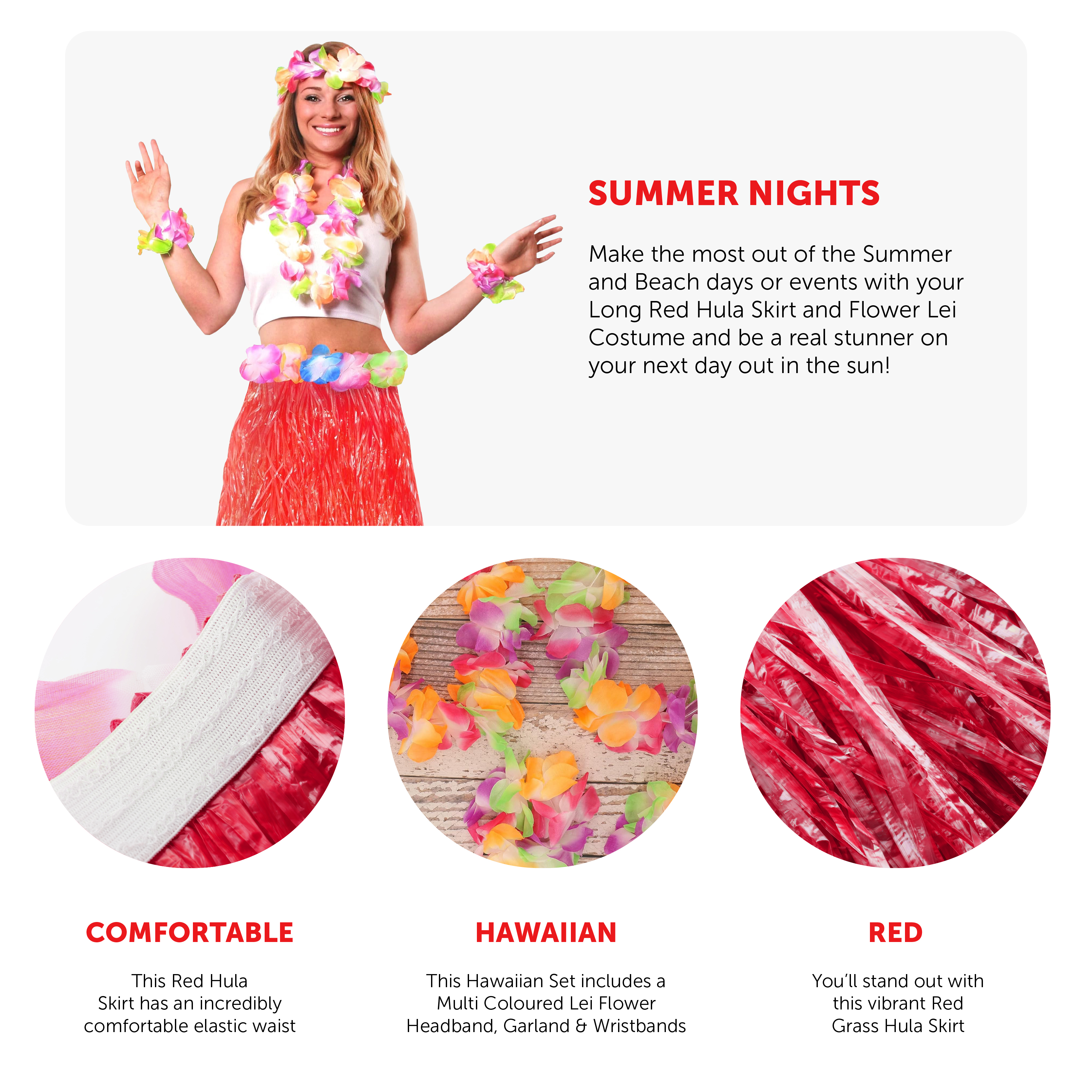COSTUME DETAILS: Your Costume includes a long grass-like Red Hula Skirt with an elasticated waistband, with multi coloured decorative Hawaiian Lei Flowers around the waist, and a 4 Piece Multi coloured Hawaiian Lei Flower Necklace, Headband and Wristband Set, all tropical and ready for the beach!