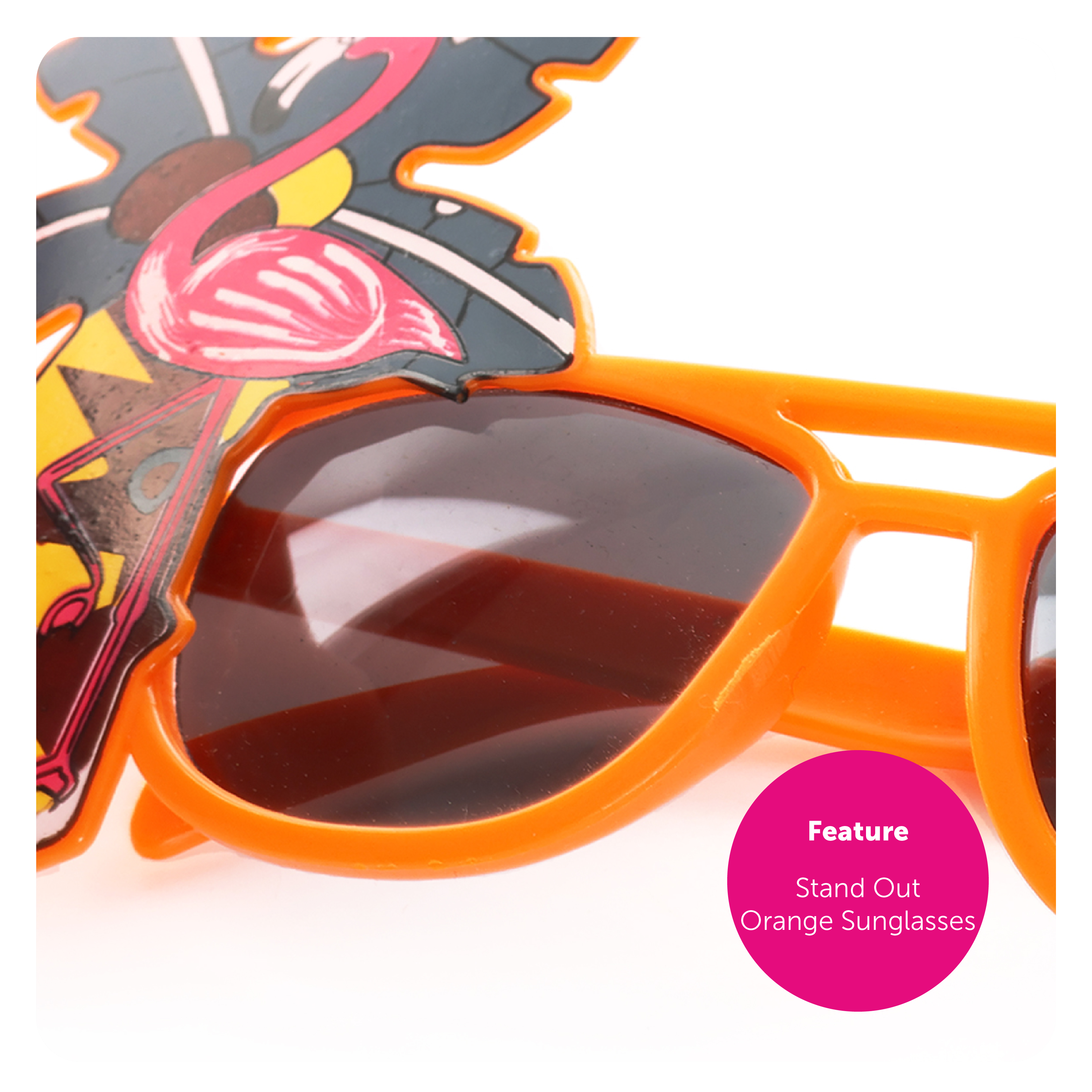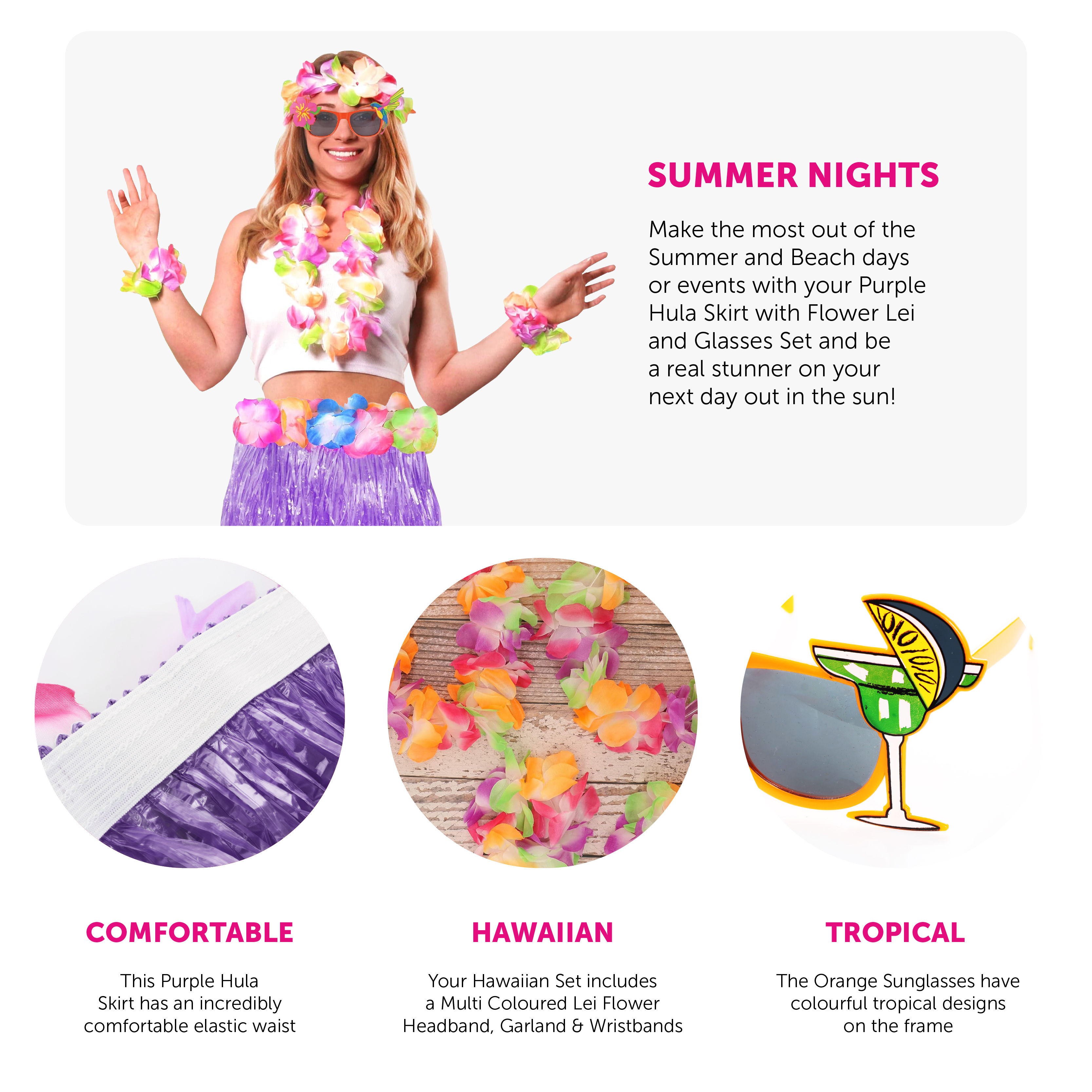 SET DETAILS: Your set includes a short grass-like Purple Hula Skirt with an elasticated waistband, with multi coloured decorative Hawaiian Lei Flowers around the waist, a 4 Piece Multi coloured Hawaiian Lei Flower Necklace, Headband and Wristband Set, and Orange Tropical Sunglasses with Hawaiian designs, all ready for the beach!