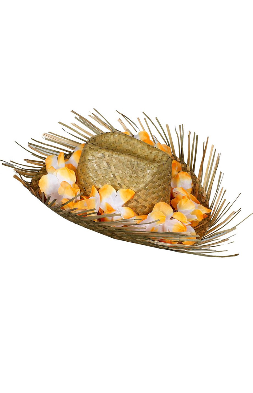 Finish off your Hawaiian Costume with one of our Straw Beachcomber Hat with Attached Lei